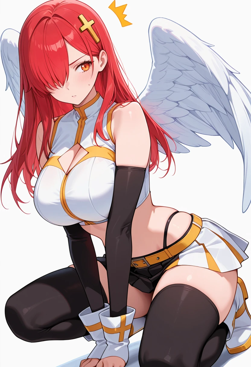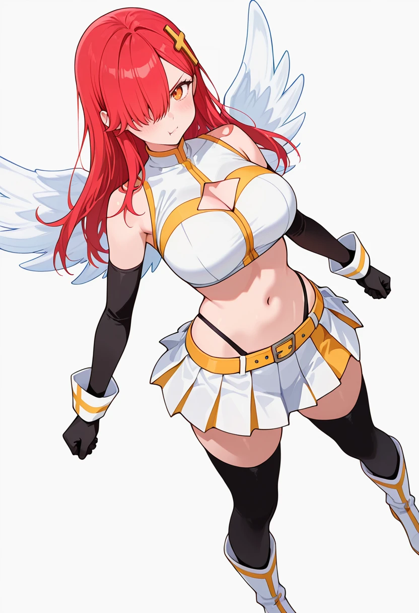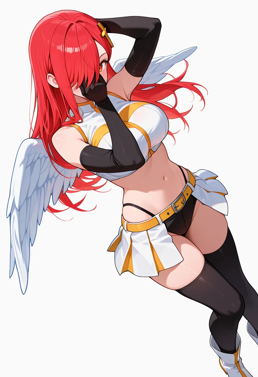 bare shoulders, midriff,angel wings, crop top, clothing cutout, detached sleeves,pleated skirt,belt, black highleg panties,black thighhighs,white boots,black elbow gloves,Explanation and notes below👇