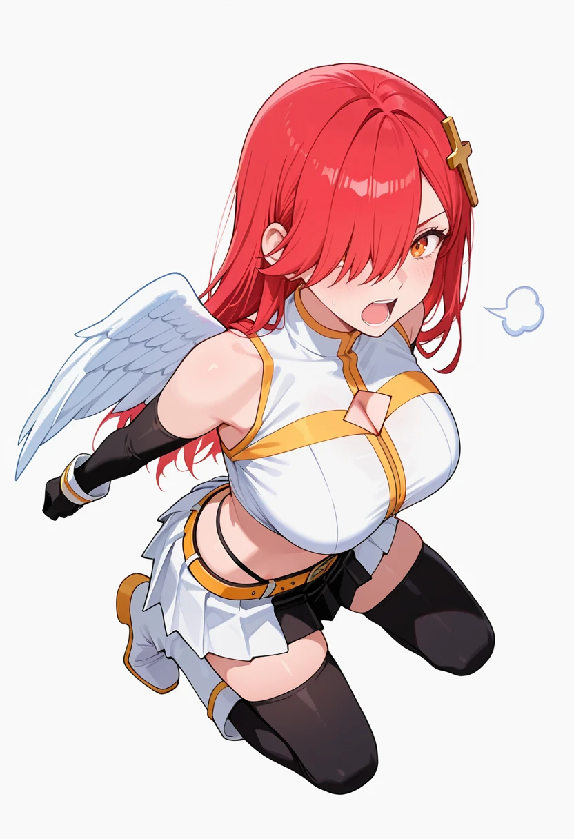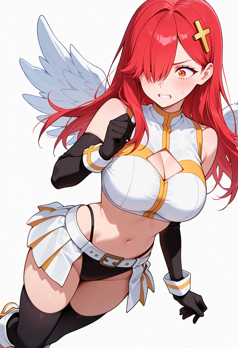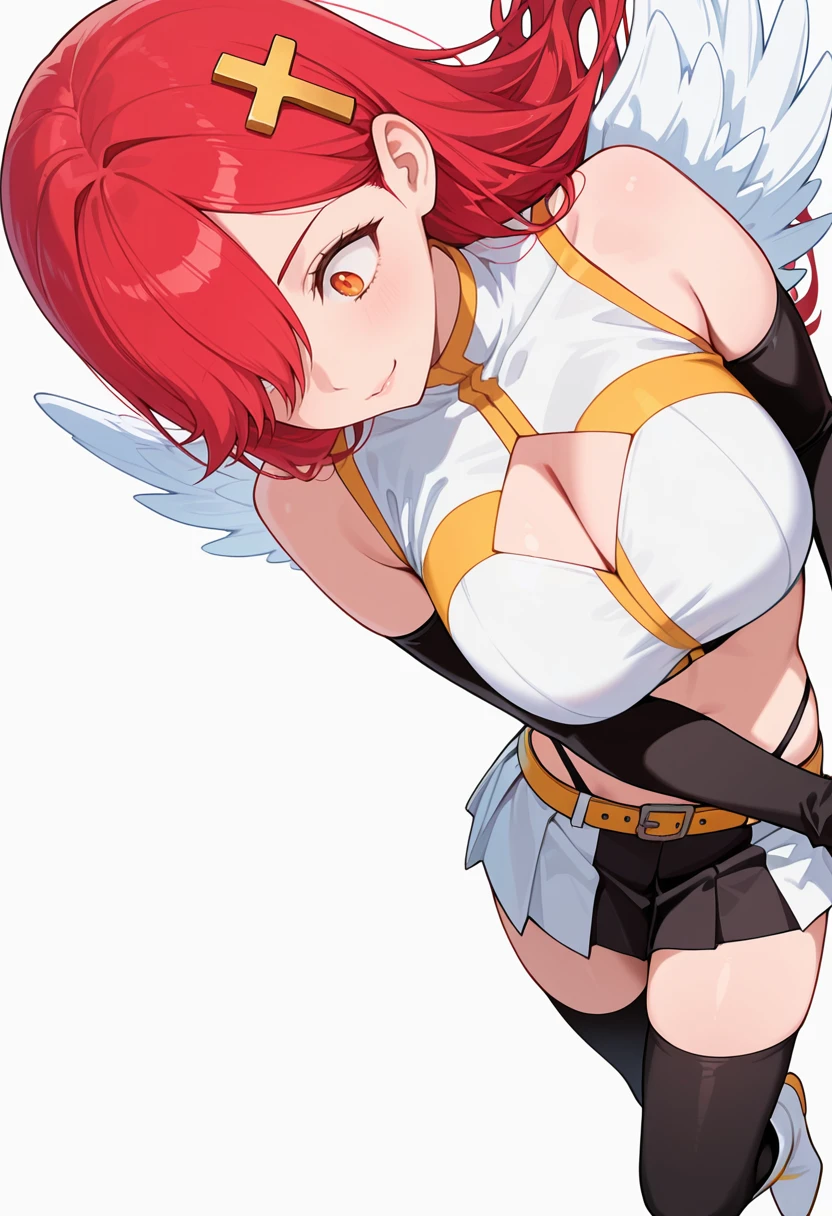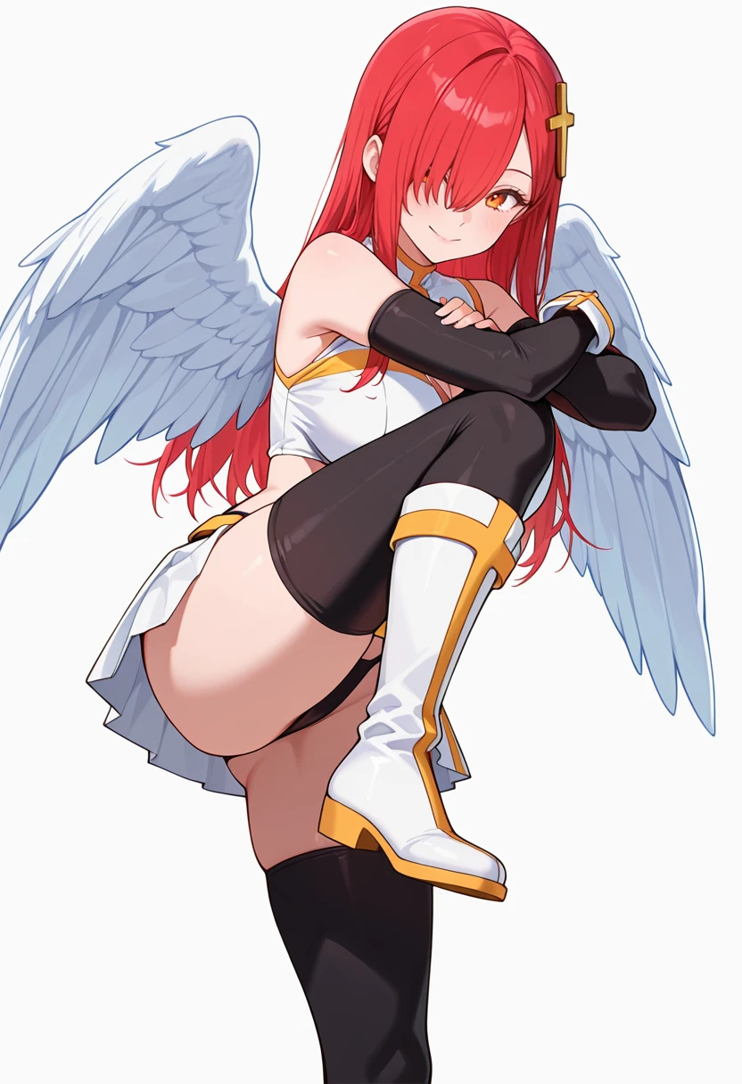 bare shoulders, midriff,angel wings, crop top, clothing cutout, detached sleeves,pleated skirt,belt, black highleg panties,black thighhighs,white boots,black elbow gloves,Explanation and notes below👇