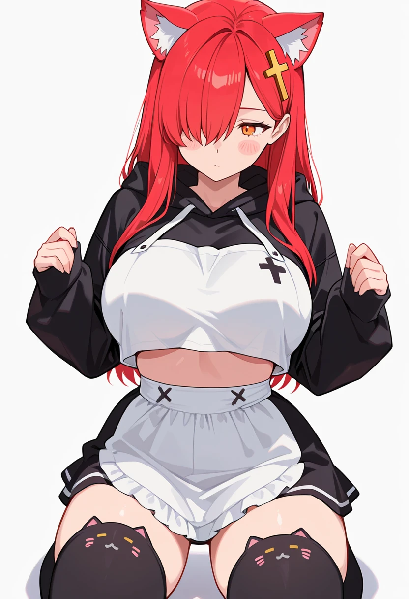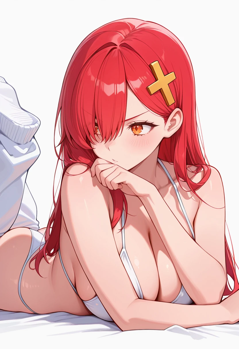 ariel_cnr, 1girl, red hair, long hair, orange eyes,hair over one eye,large breasts,cross hair ornament, 👗Default Outfit