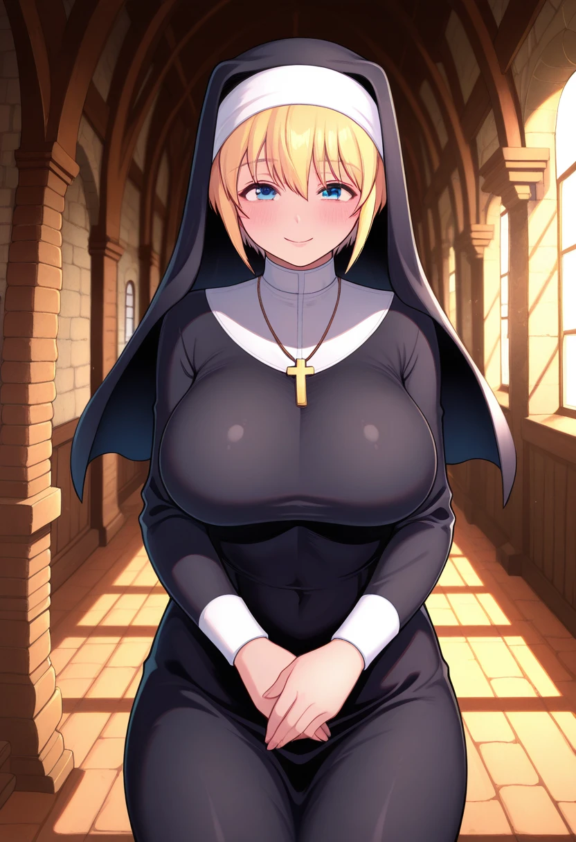 isesaintww, mature female, bandage blindfold, white blindfold, covered eyes, blonde hair, long hair, sidelocks, large breasts,