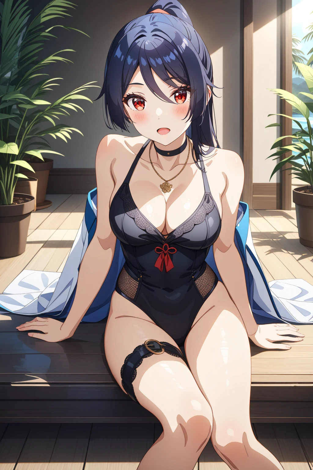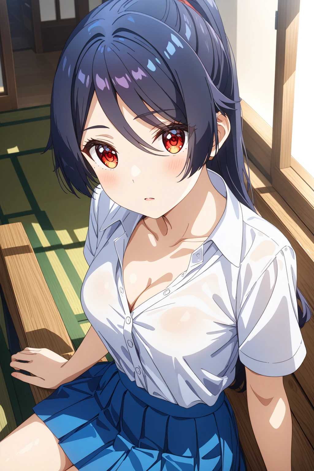 long hair, bangs, red eyes, black hair, hair between eyes, ponytail,