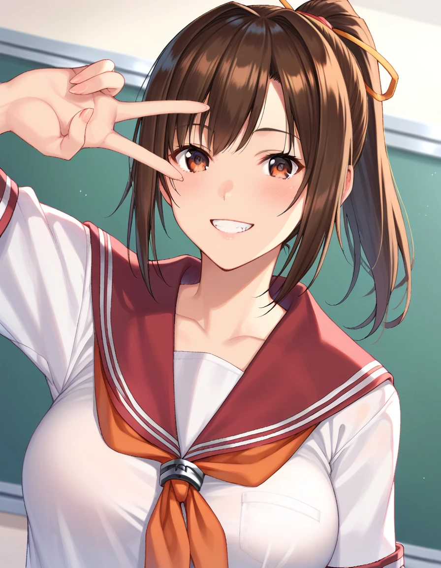 large breasts, brown hair, brown eyes, hair ribbon, ponytail,