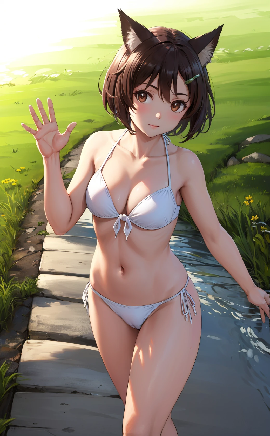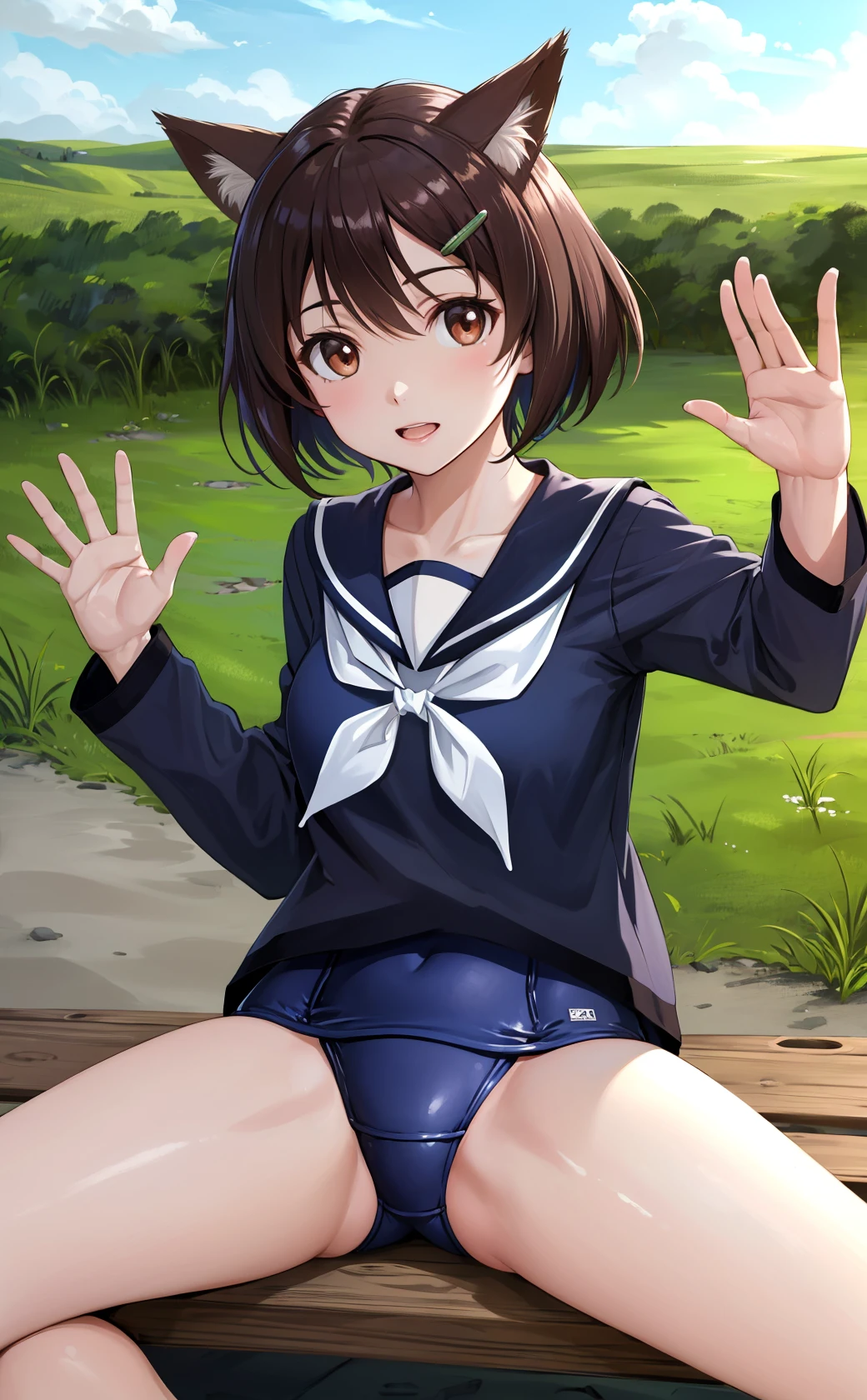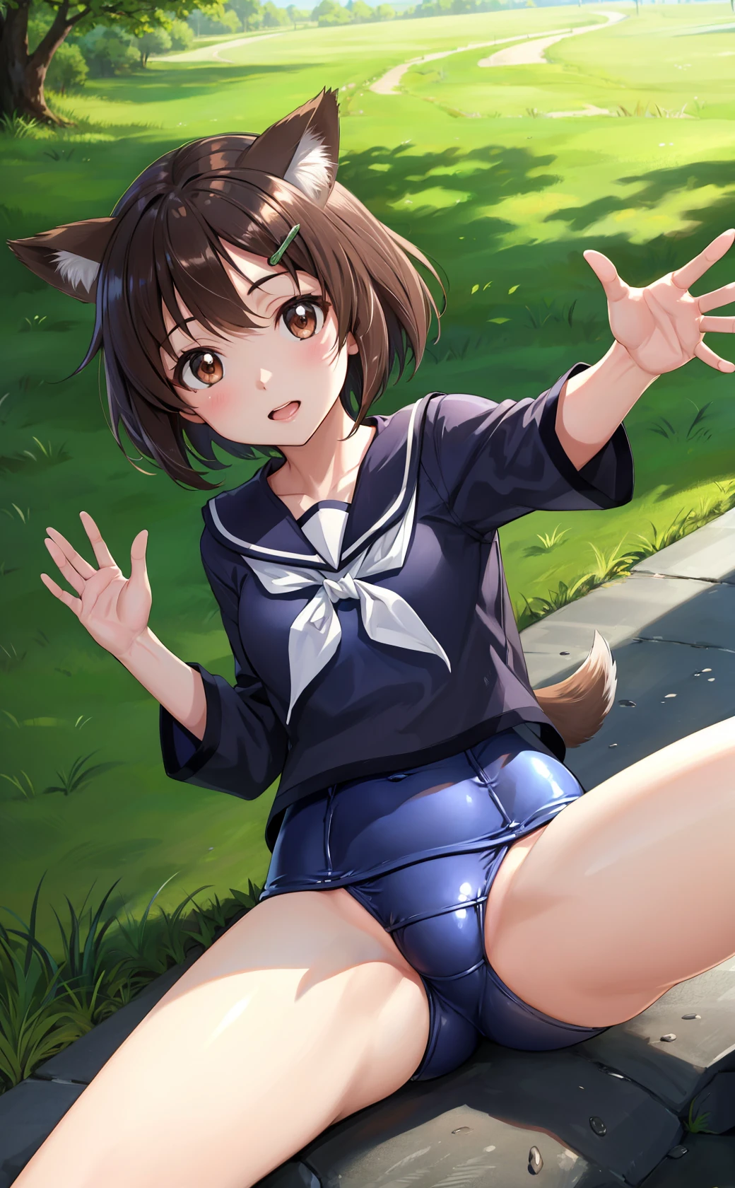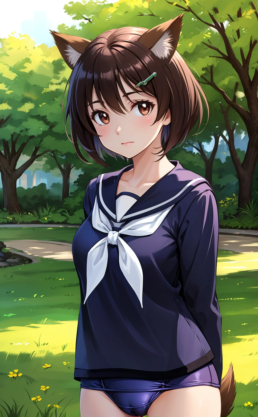 short hair, brown eyes, brown hair, hair ornament, hairclip, dog ears, dog tail, dog girl,