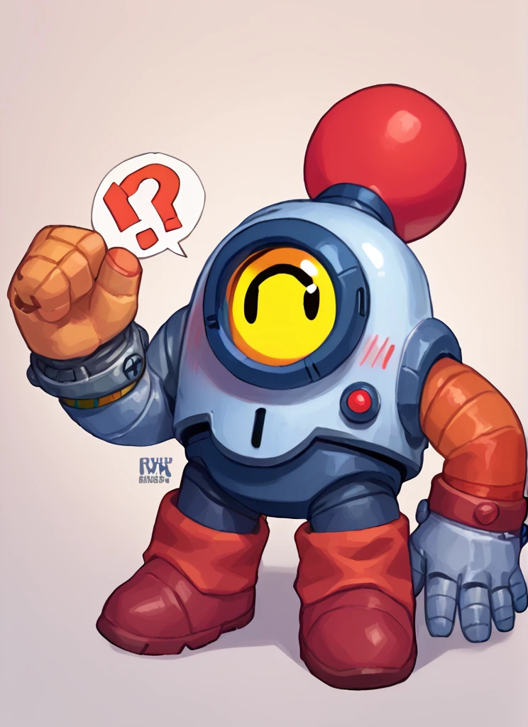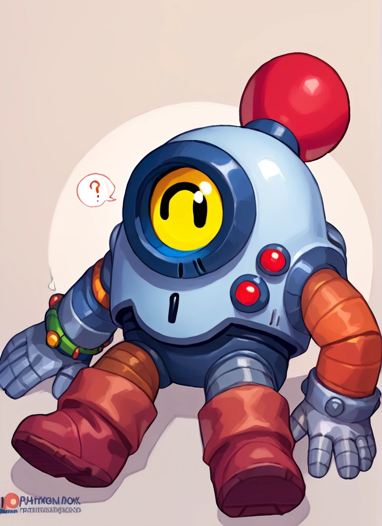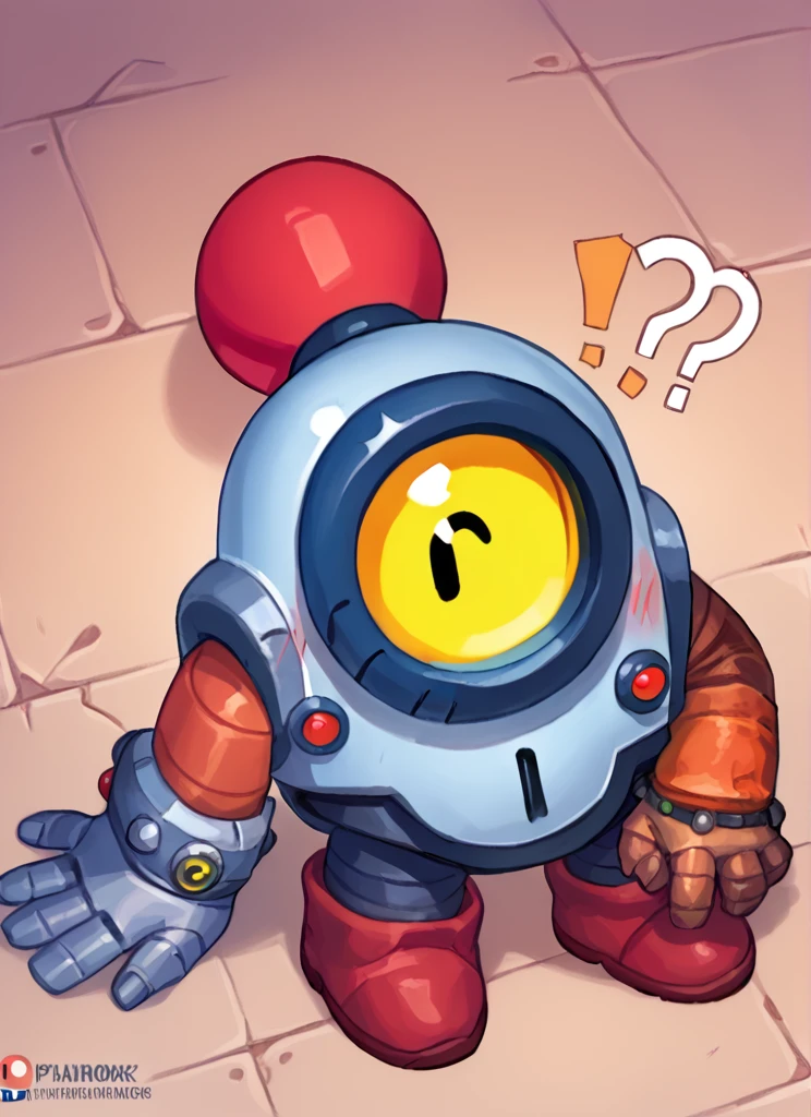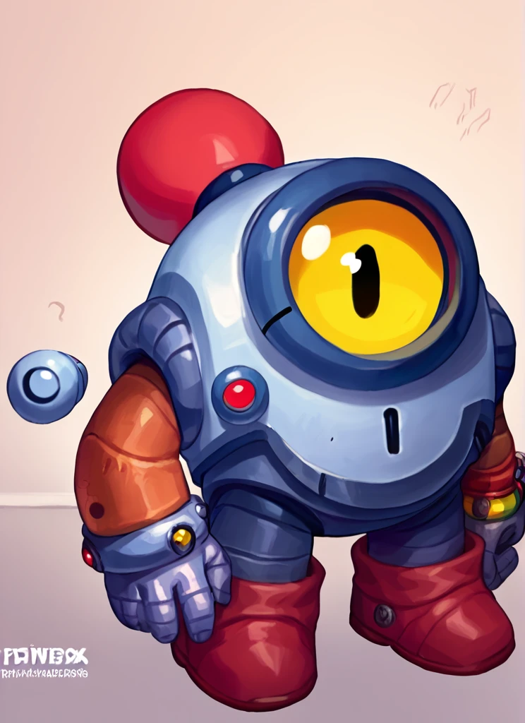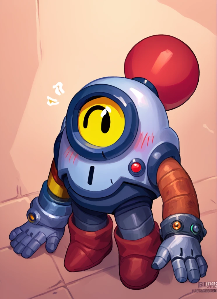 bsnani , 1 girl , robot, crewmate \(among us\), cyclops, yellow sclera, red hair bun , red shoes , asymmetrical arms , solo, mechanical arms ,