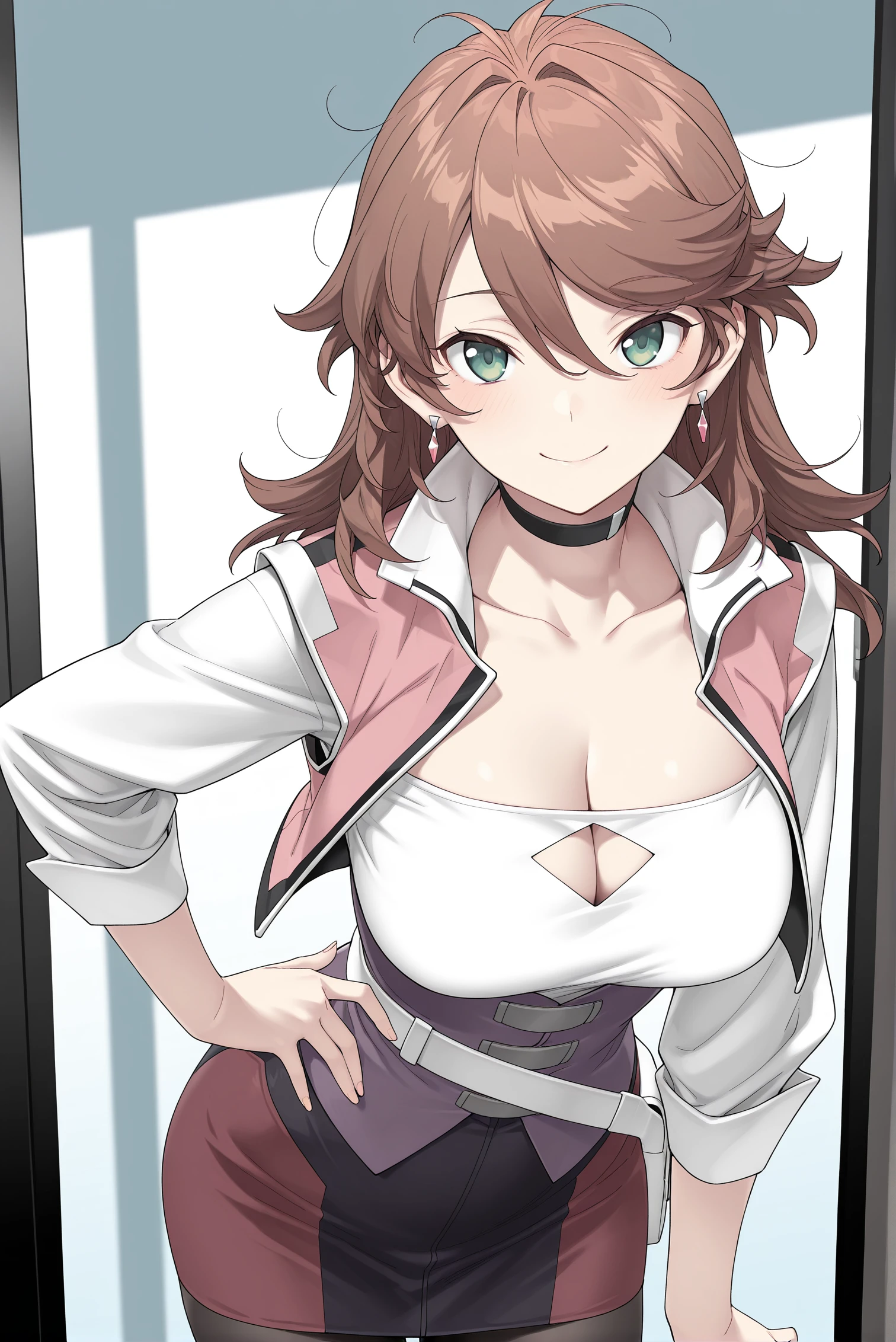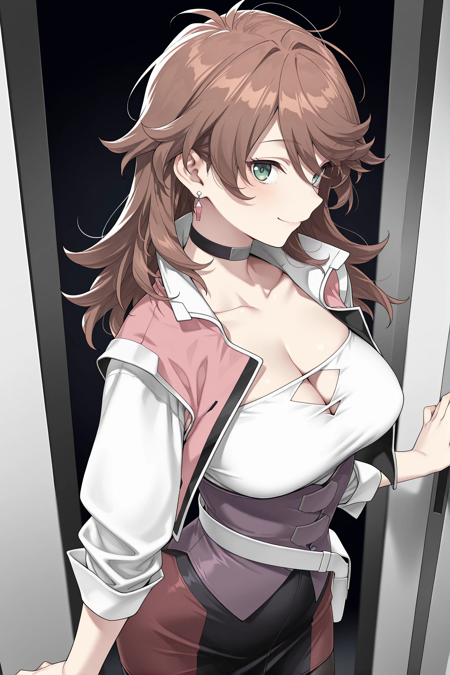 Sagiri Sakurai, green eyes, brown hair, long hair, messy hair, hair between eyes, green earrings