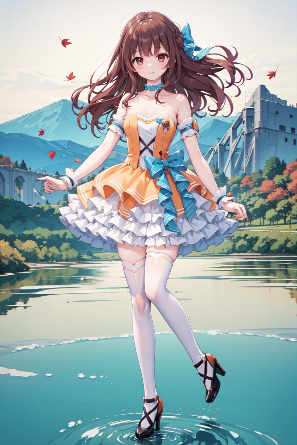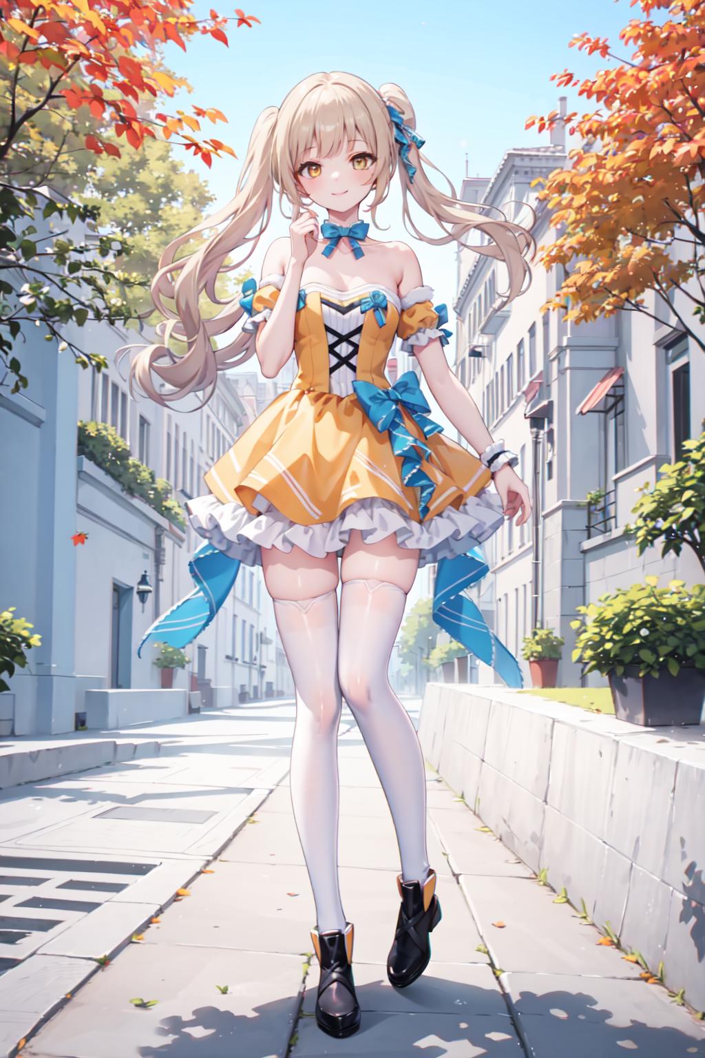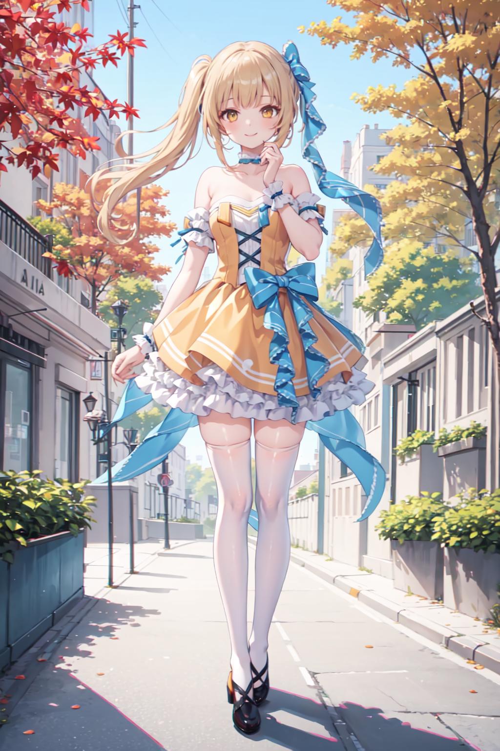 strapless dress,bow, yellow dress,white thighhighs,blue ribbon,