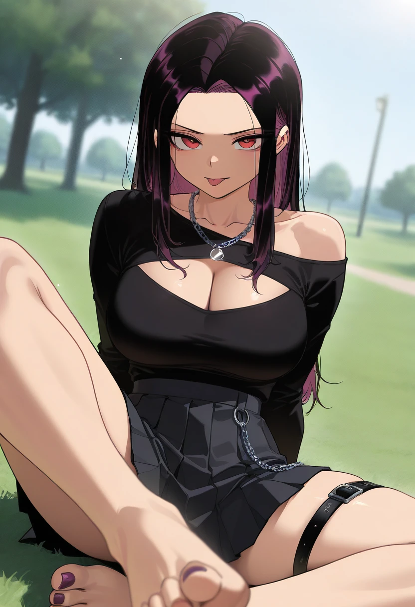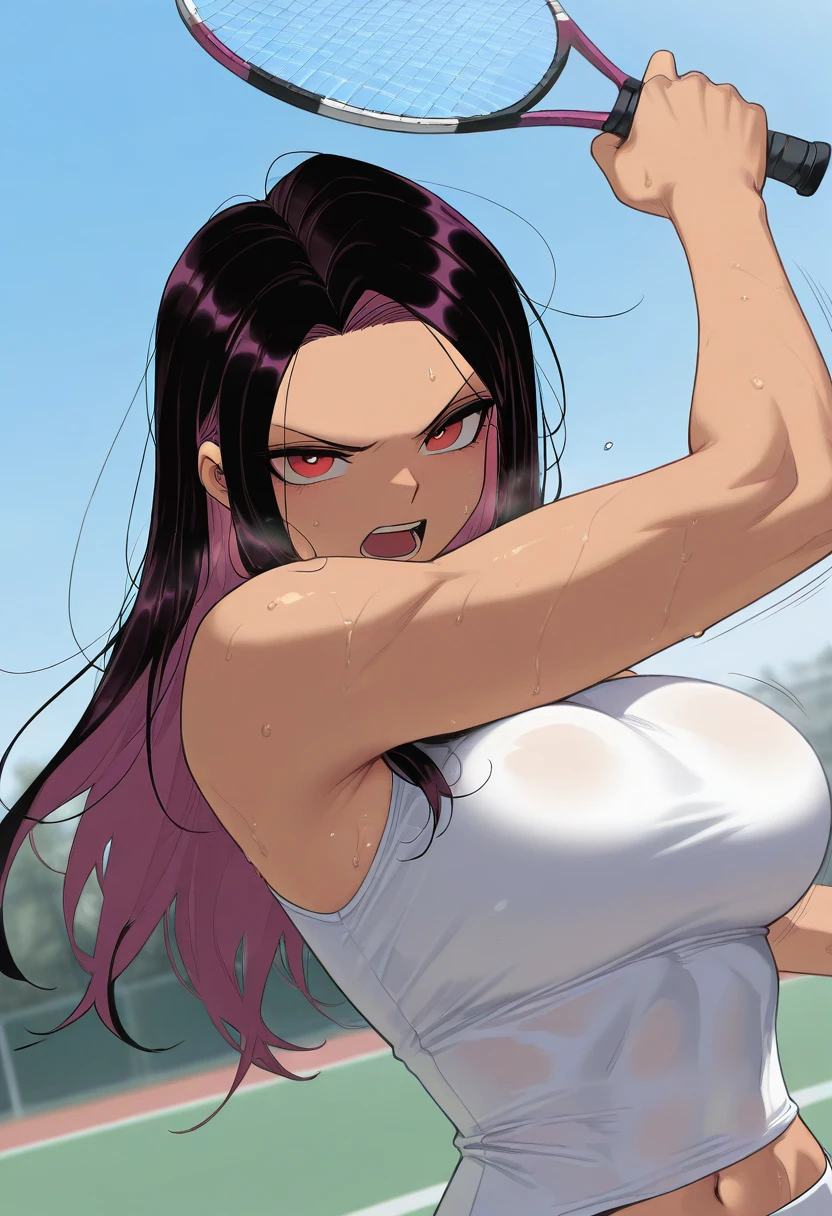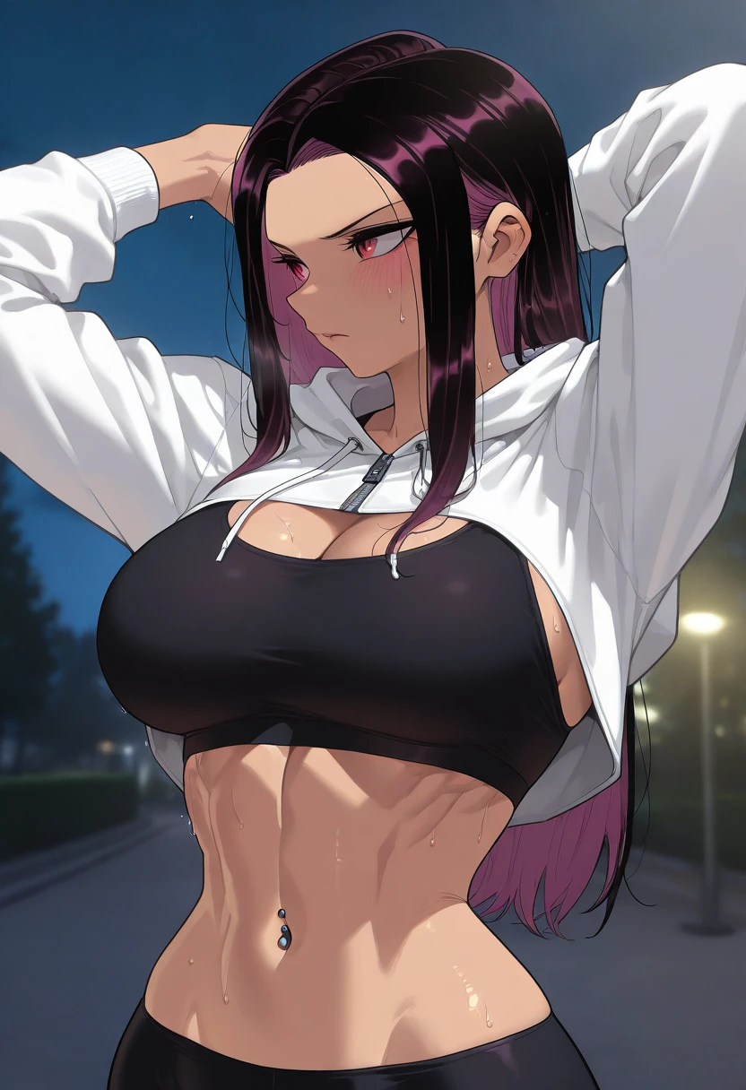 Tags for her look: 1girl, solo, large breasts, long hair, tomboy, toned female, black hair, red eyes, purple hair, streaked hair, two-tone hair, colored inner hair, sidelocks, hair down,