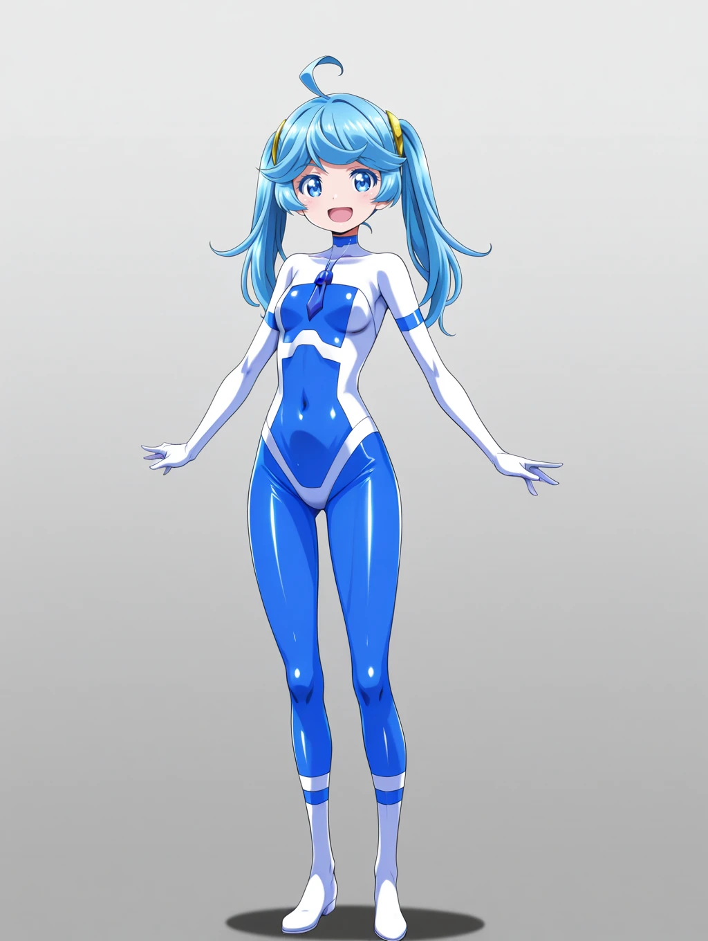 white boots, skin tight, shiny clothes, blue bodysuit, covered collarbone, multicolored bodysuit, white armglove, (white bodysuit:0.8), covered navel, blue necktie,
