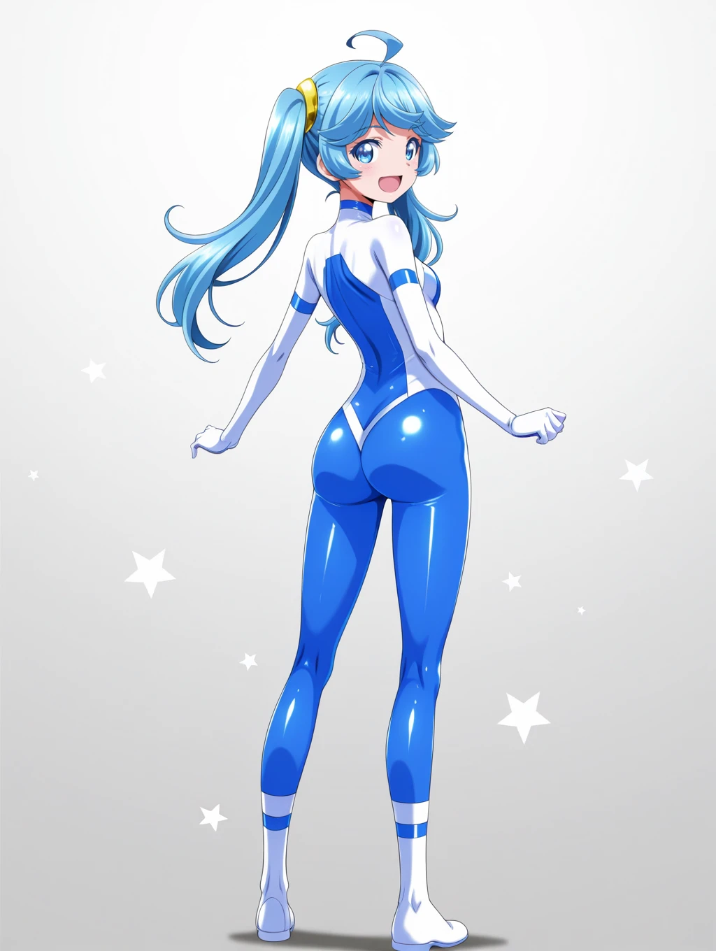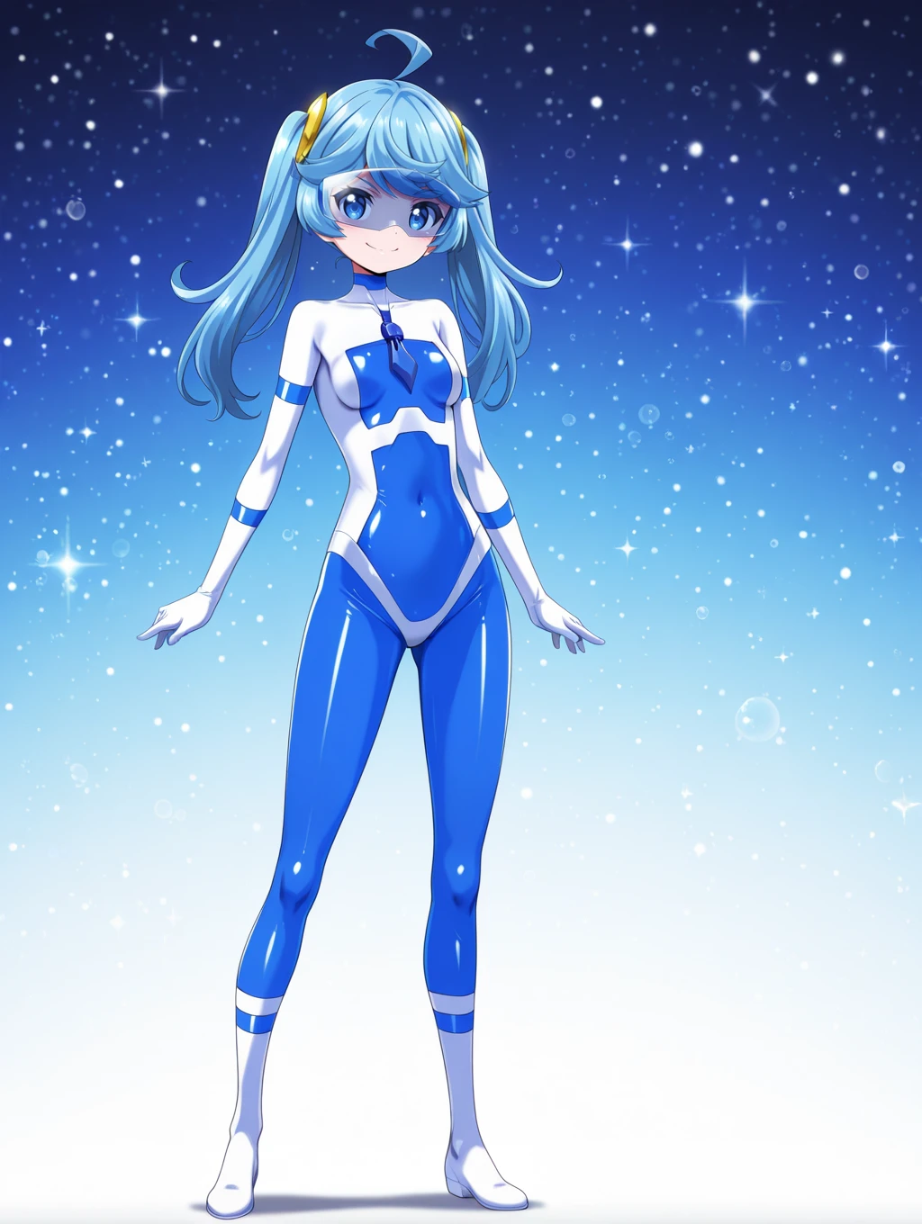 Star Sapphire, long hair, blue eyes, yellow hair ornament, (blue hair:1.2), twintails, collarbone, ahoge, small breasts,