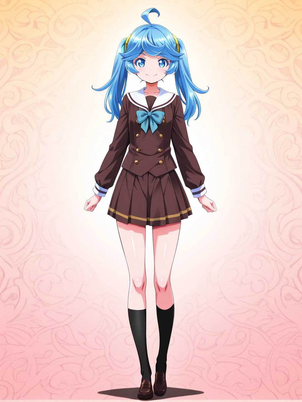 school uniform, pleated skirt, brown loafers, socks, serafuku, miniskirt, kneehighs, brown footwear, black socks, white sailor collar, brown skirt, hair tie, brown shirt, brown serafuku, buttons, blue bow, double-breasted,