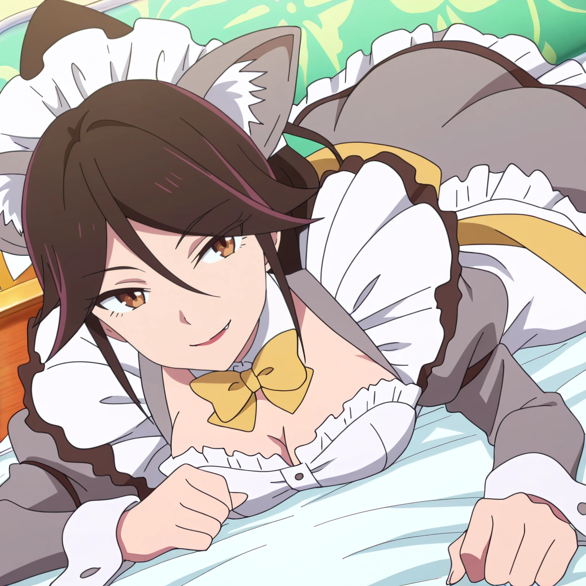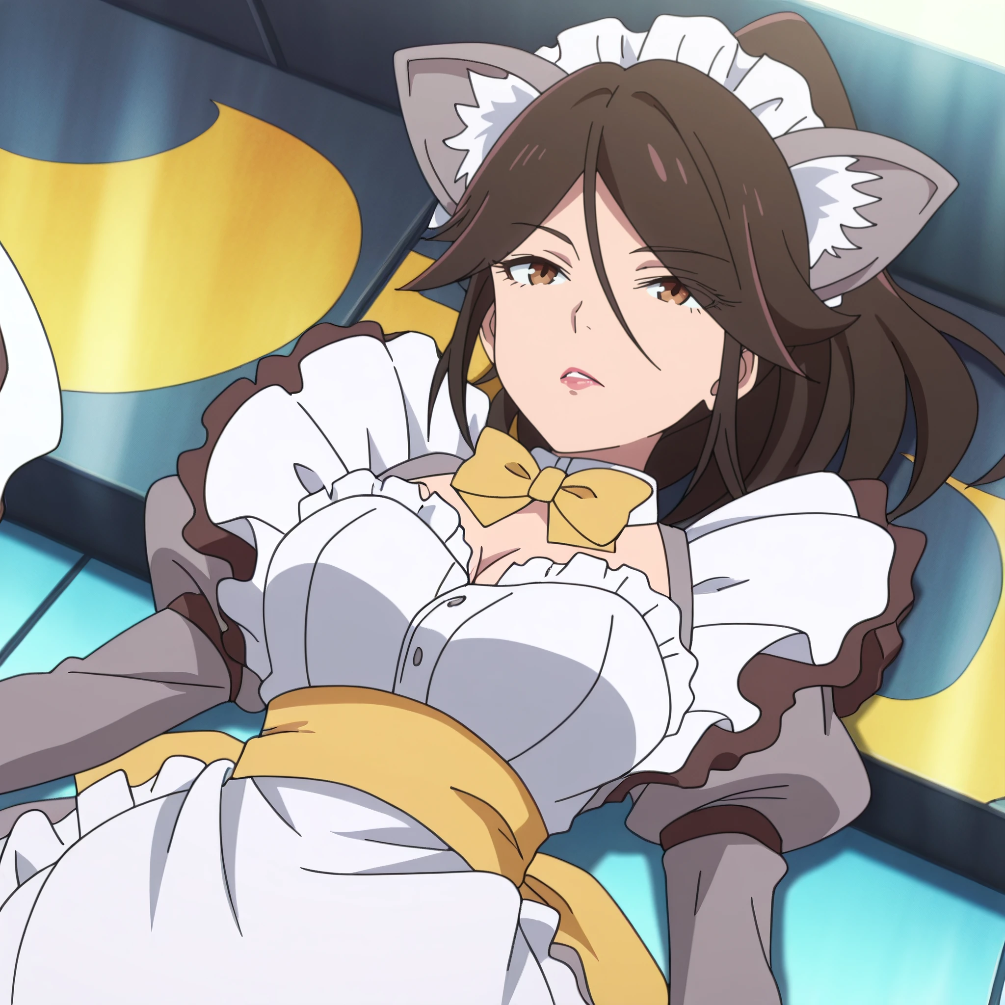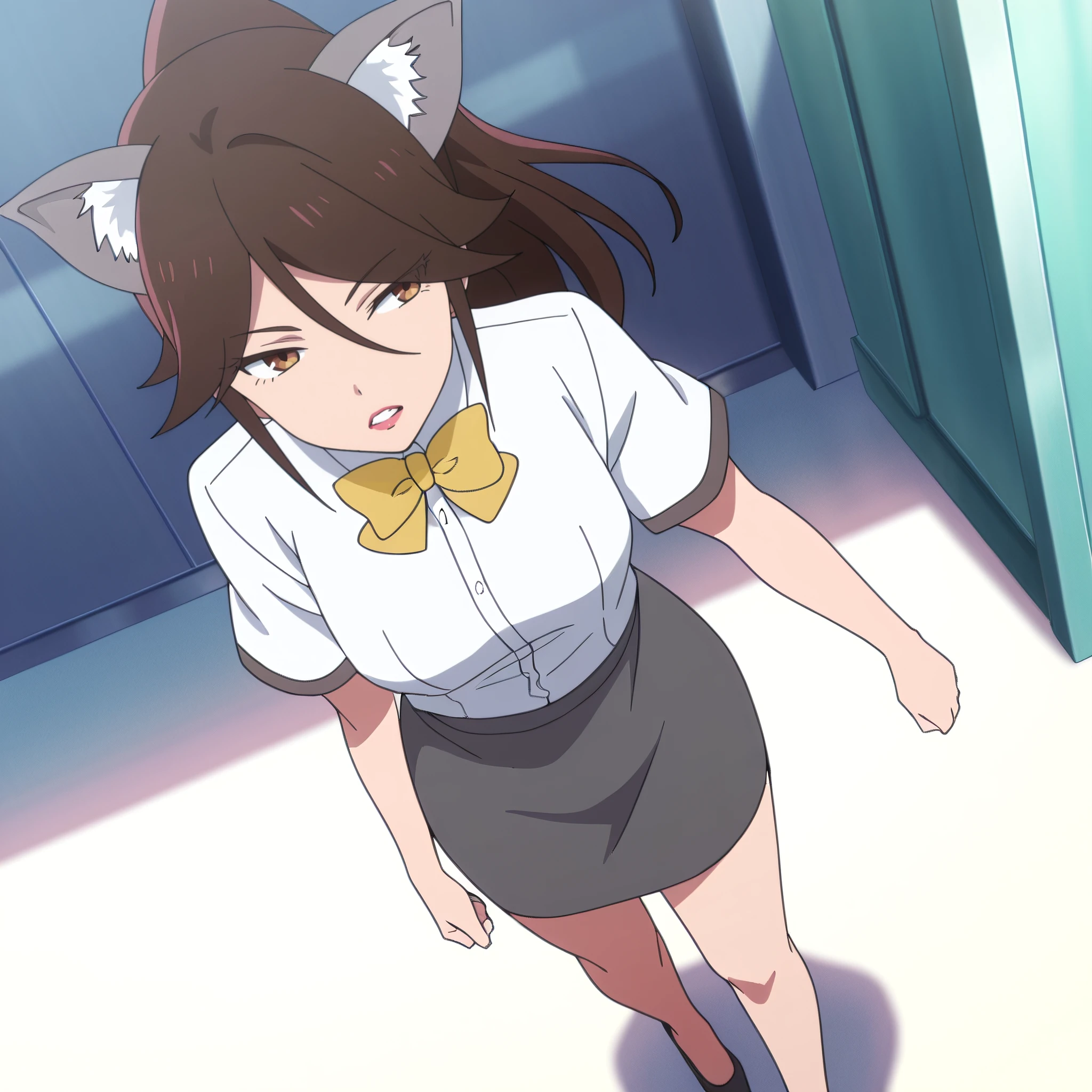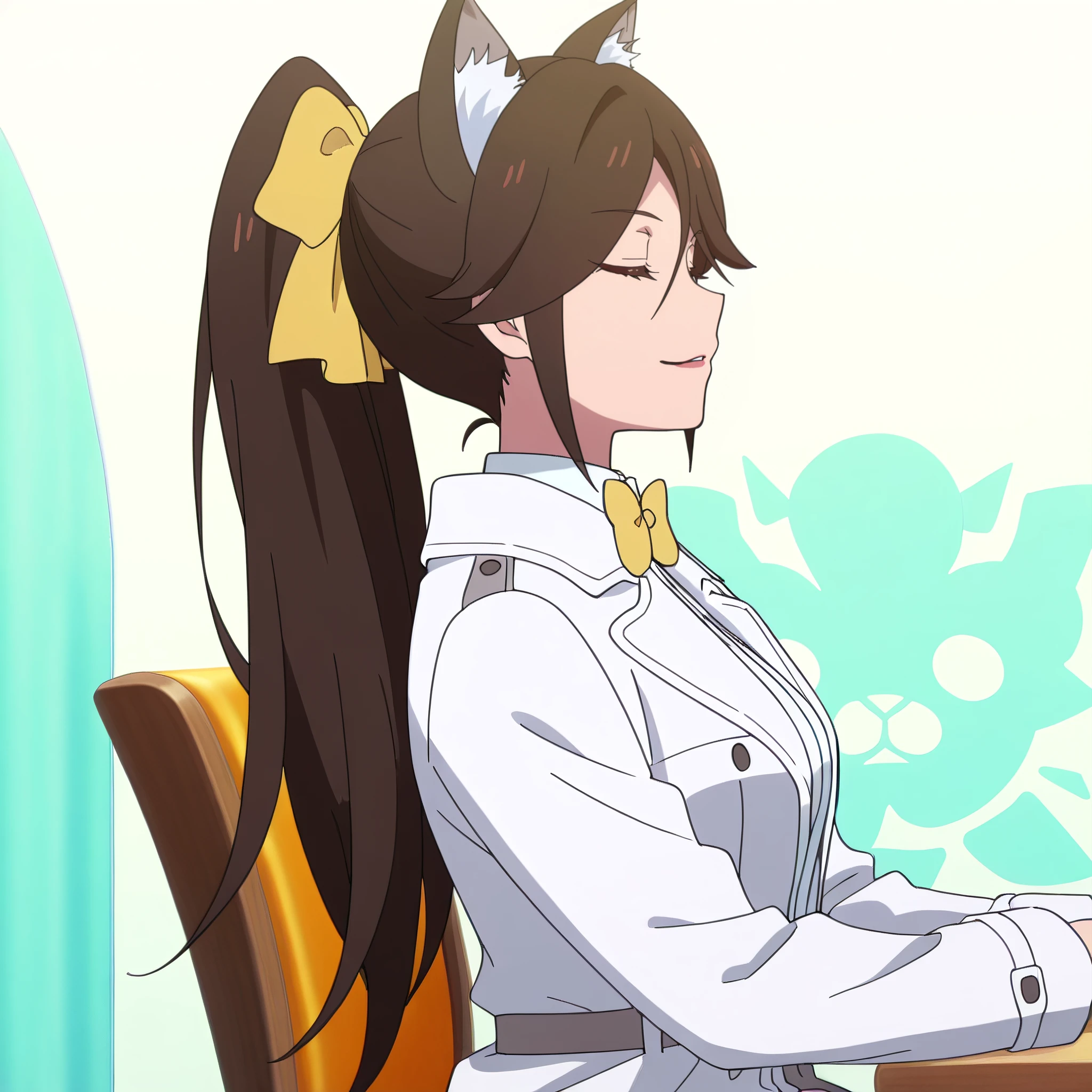 AMWCatExecutive, long hair, bow, brown hair, animal ears, brown eyes, bangs, bowtie, cat ears, yellow bow, hair between eyes, ponytail, eyebrows visible through hair, yellow ribbon, swept bangs,