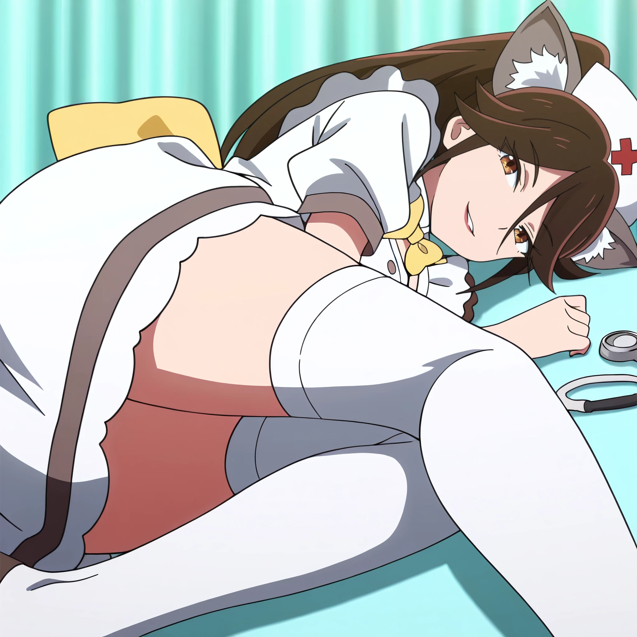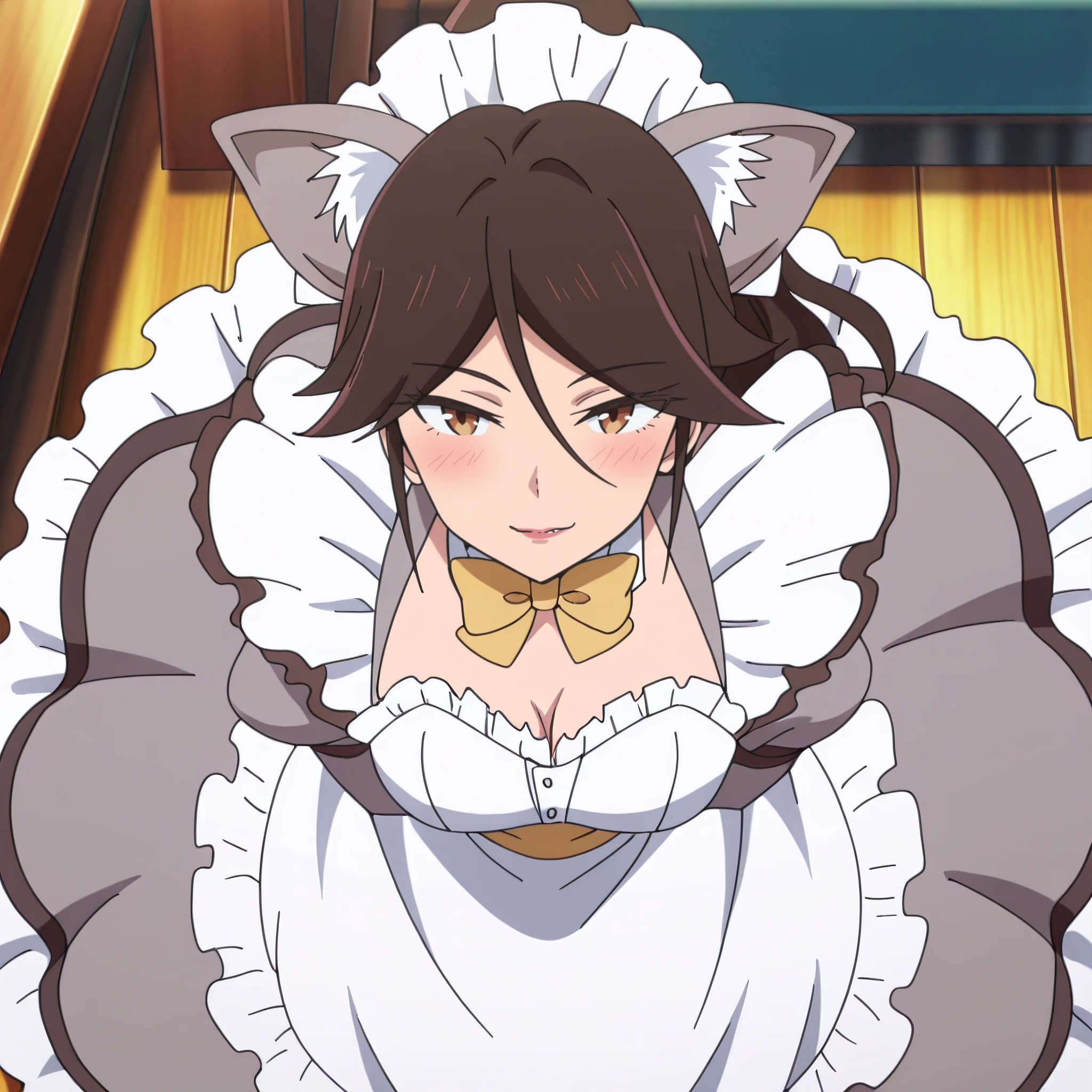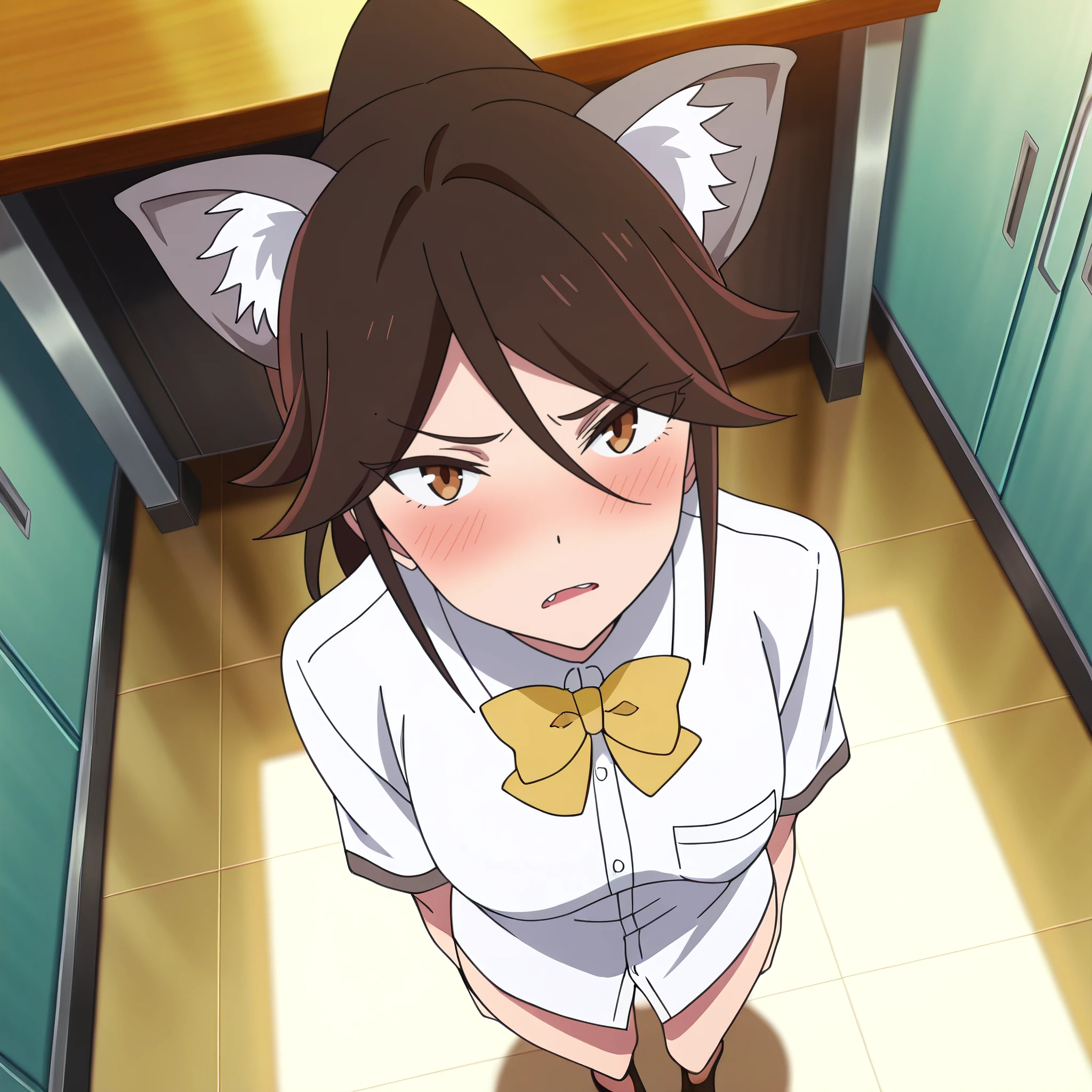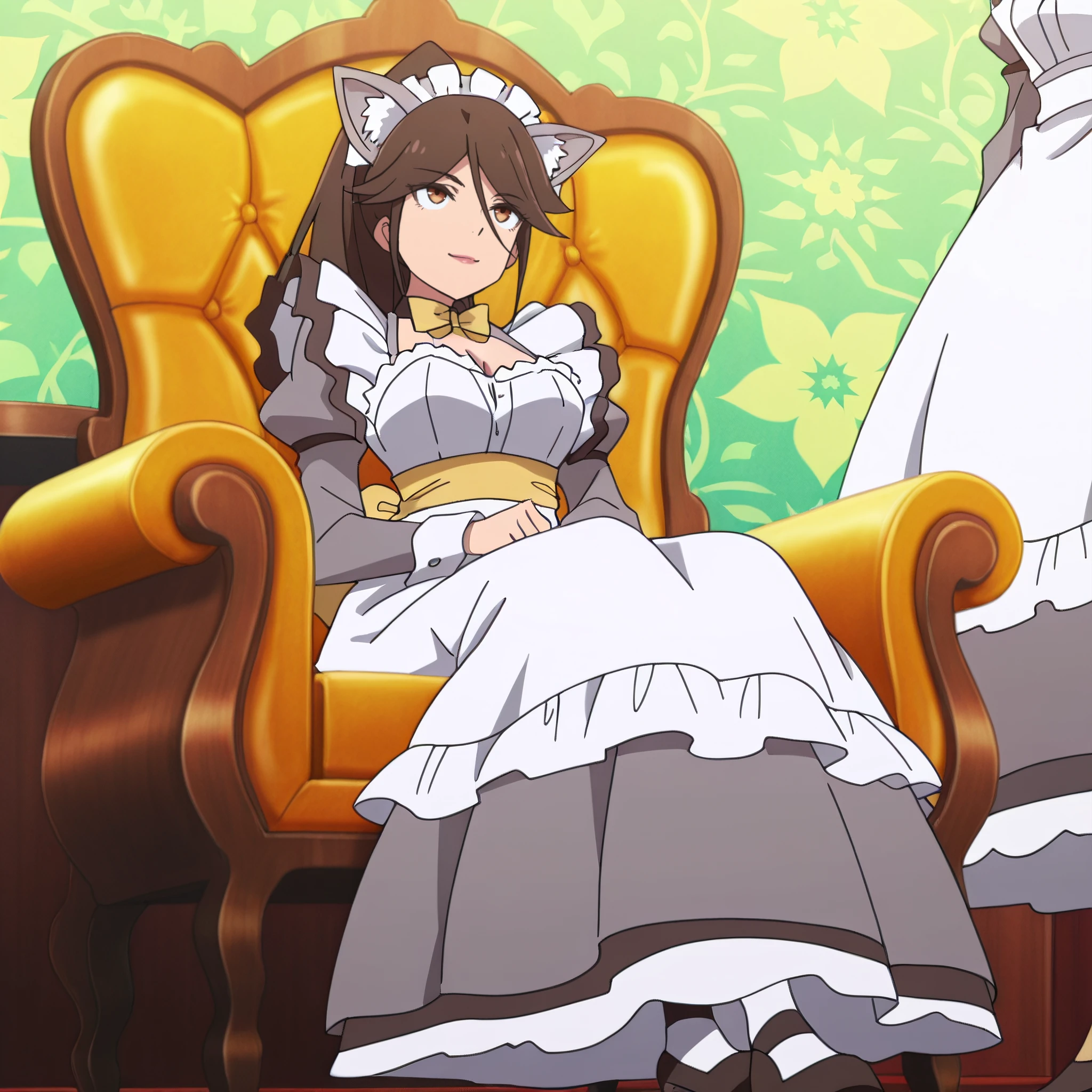 AMWCatExecutive, long hair, bow, brown hair, animal ears, brown eyes, bangs, bowtie, cat ears, yellow bow, hair between eyes, ponytail, eyebrows visible through hair, yellow ribbon, swept bangs,