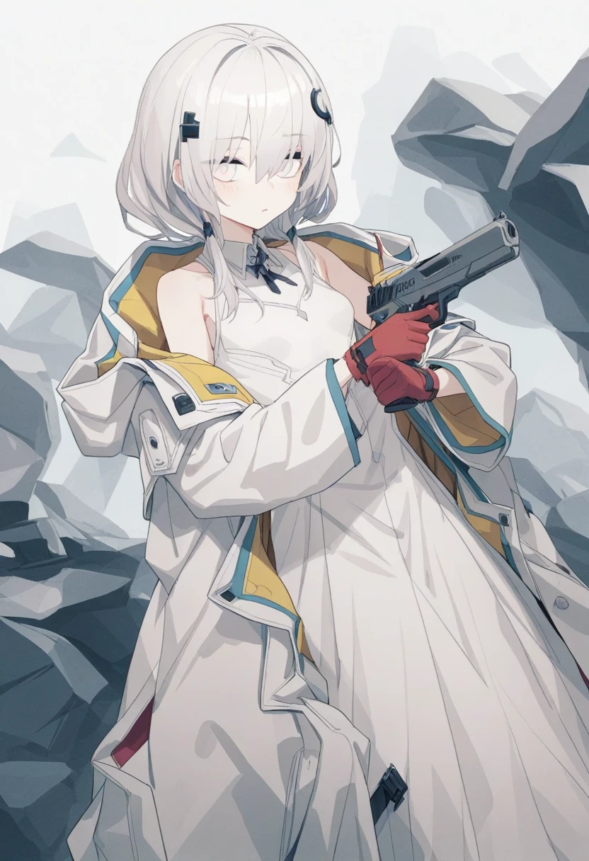 Trigger:gloves, dress, jewelry, jacket, sidelocks, sleeveless, coat, gun, lena ishmael, hair ornament, holding weapon, red gloves, white dress, white hair, white eyes, bare shoulders, collared coat, collared dress, long dress, long sleeves, medium hair, open coat, sleeveless dress, small breasts, white coat,