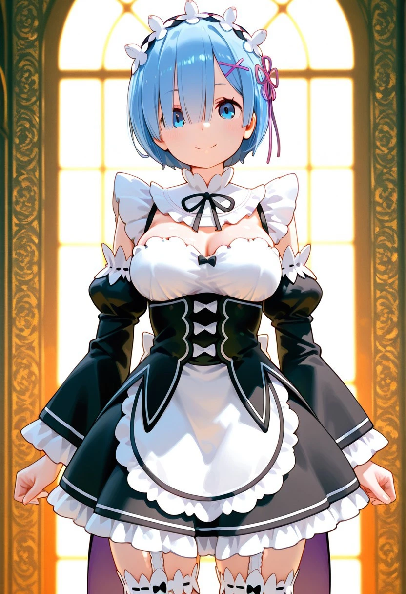 Rem from Re:Zero, blue eyes, blue hair, hair ornament, hair over one eye, hair ribbon, short hair, x hair ornament, medium breasts, apron, black bow, black dress, black ribbon, bow, detached sleeves, dress, frilled apron, frilled sleeves, frills, juliet sleeves, long sleeves, maid, neck ribbon, puffy sleeves, ribbon, roswaal mansion maid uniform, thighhighs, two-tone dress, waist apron, white bow, white dress, white thighhighs,
