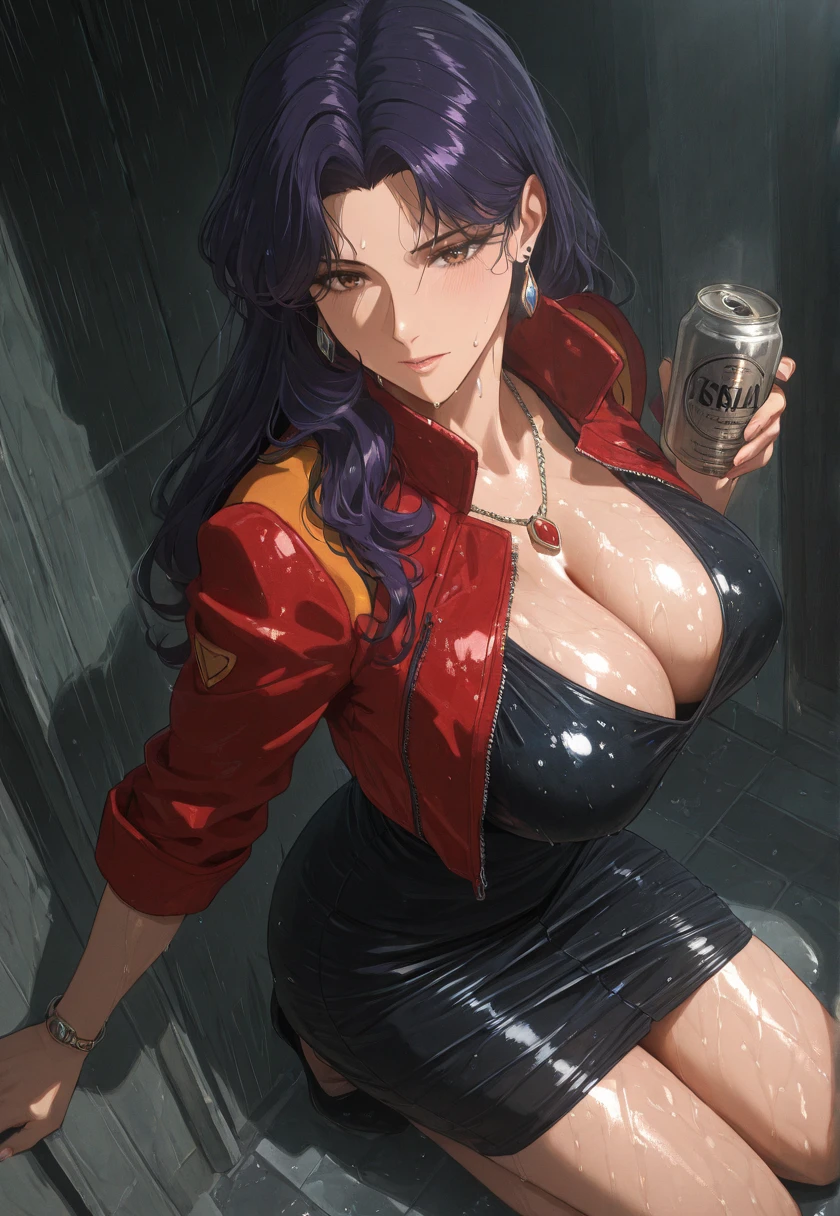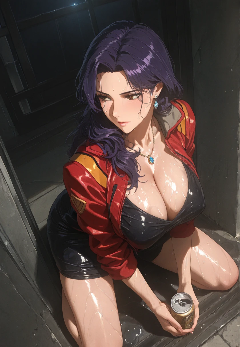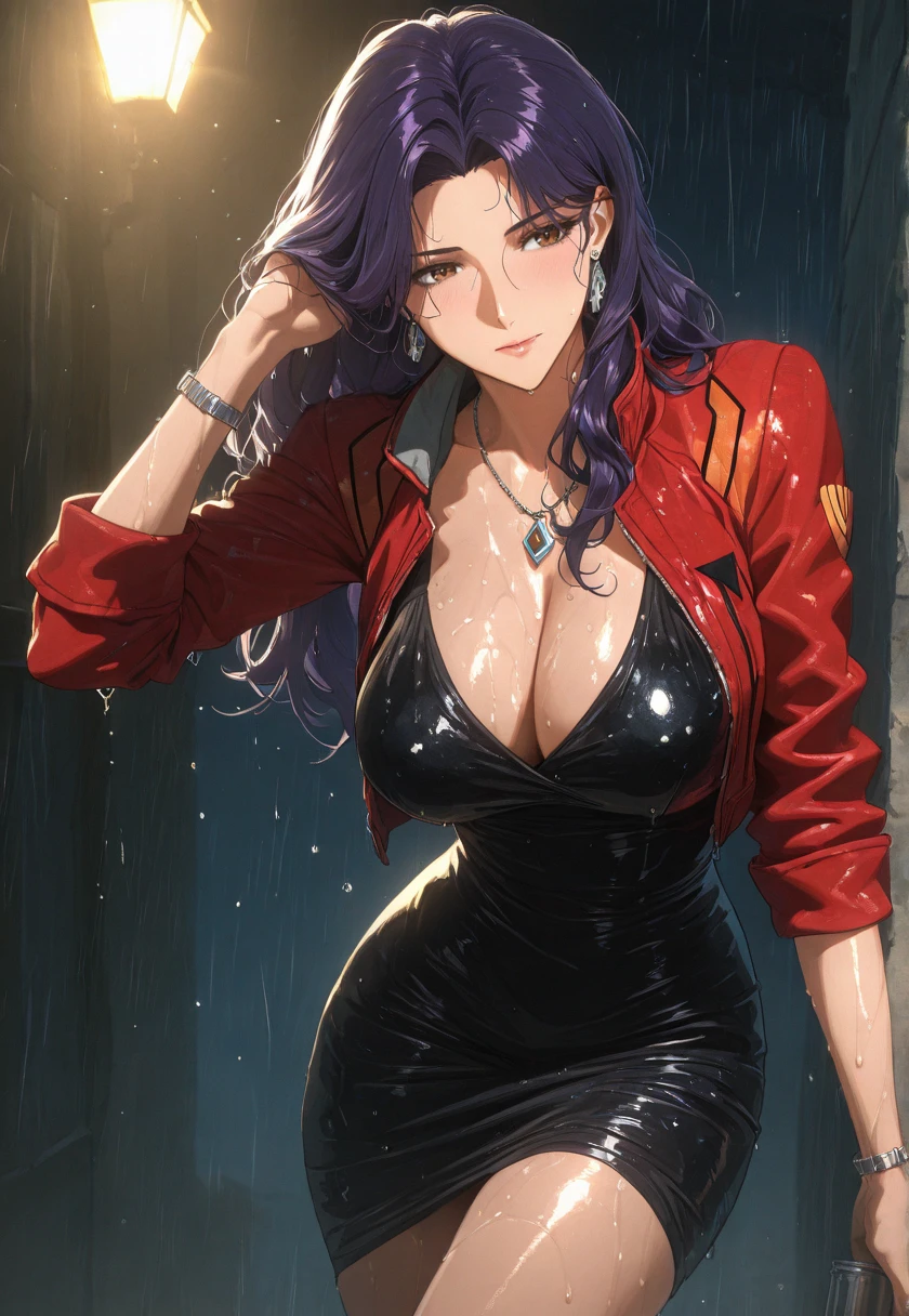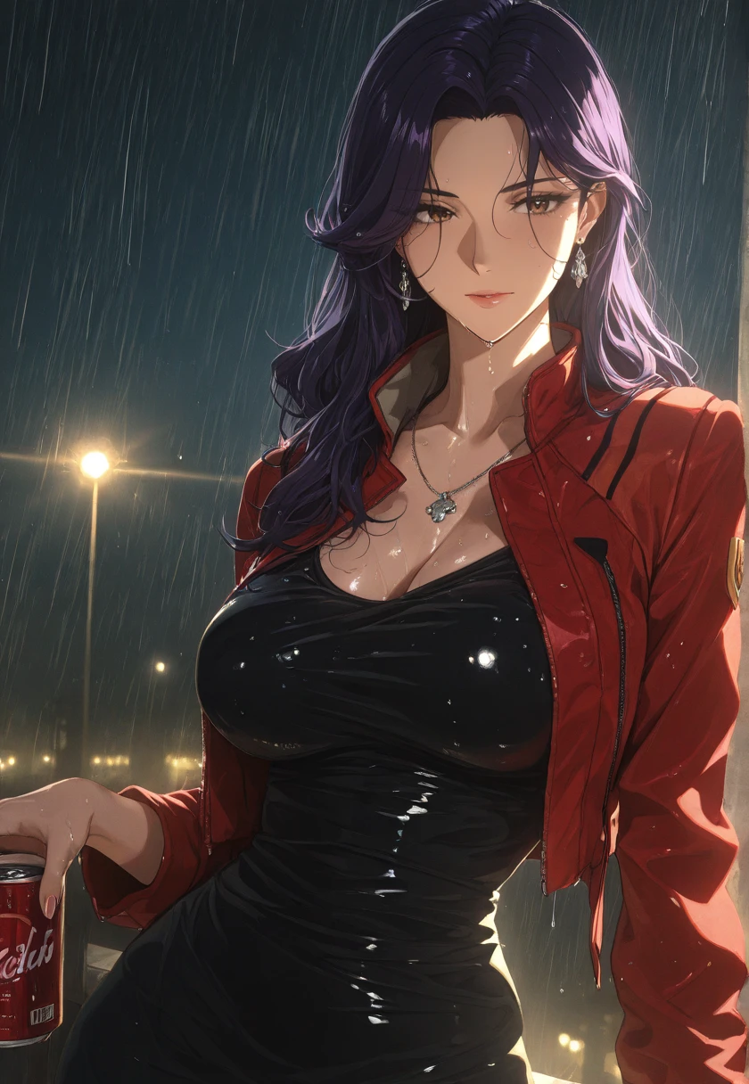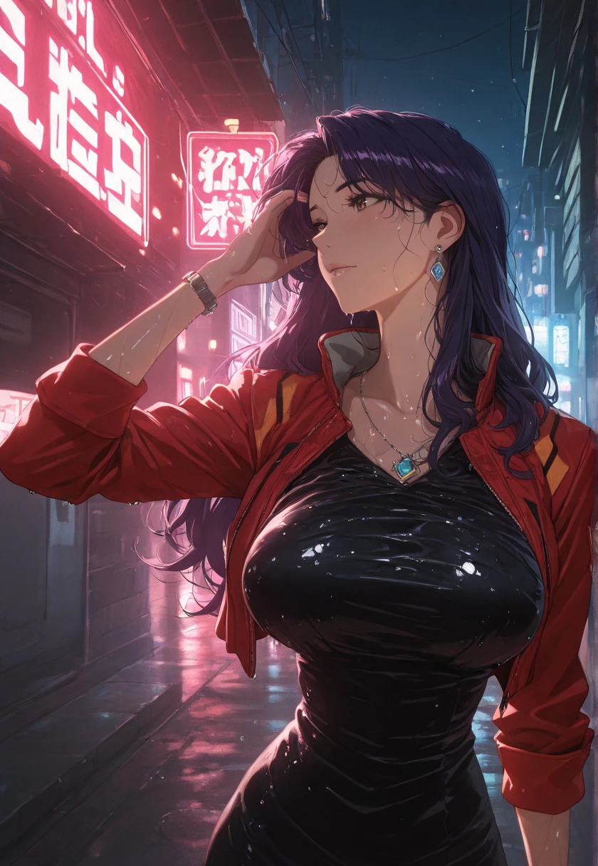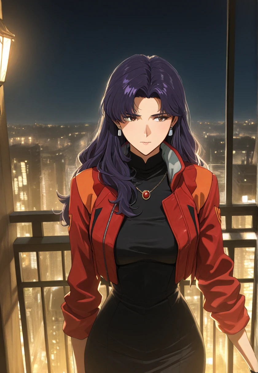 m1sat0, 1girl, solo, purple hair, jewelry, long hair, earrings, brown eyes, jacket, dress, black dress, cropped jacket, red jacket,