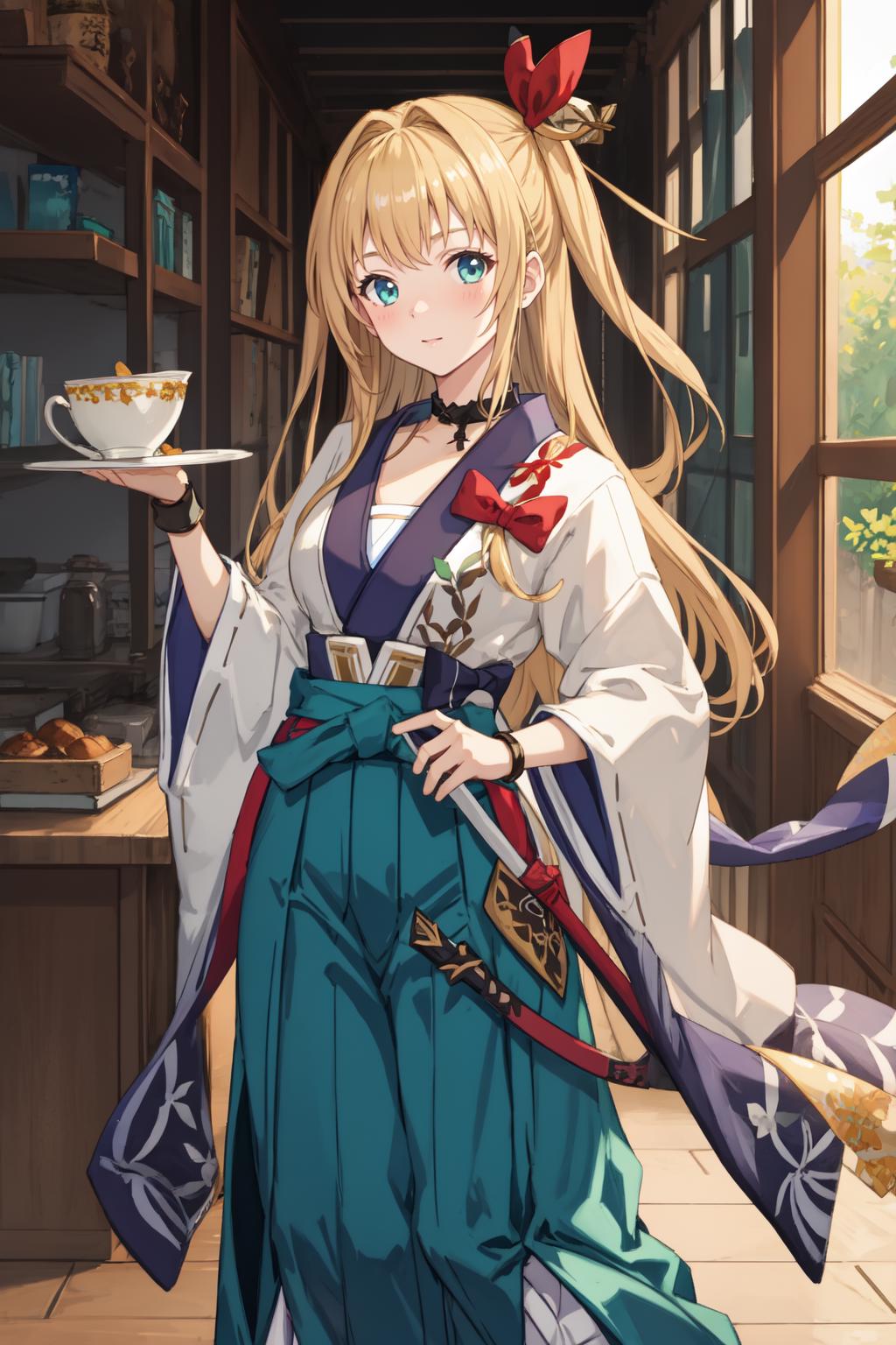 mir1nsd, white kosode, green hakama, sarashi, red ribbon, hair ornament, black choker, black gauntlets, boots