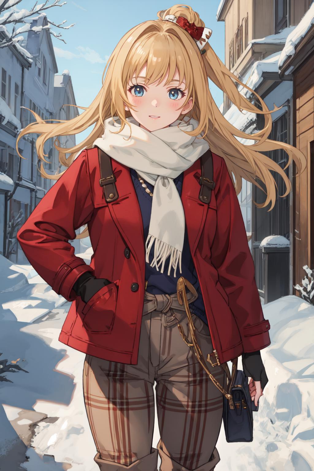 mir1nh, white scarf, red jacket, red plaid pants, brown boots, fingerless gloves