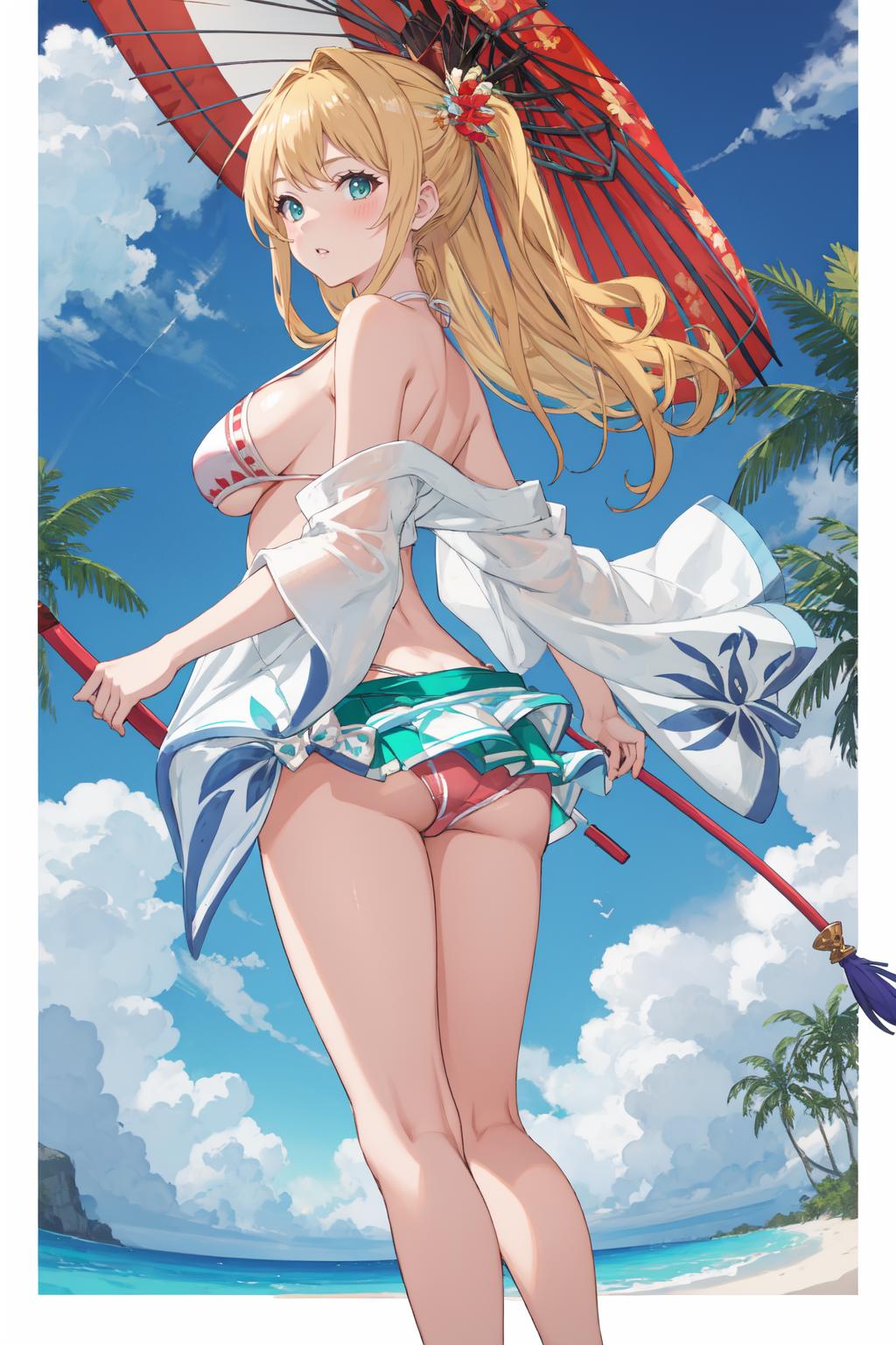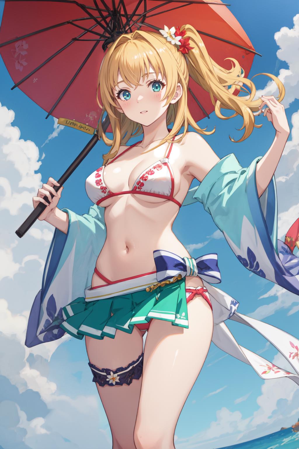 mir1nb, white bikini, hair ornament, red panties, green bikini skirt, wide sleeves, single side thight strap, oil-paper umbrella, sandals