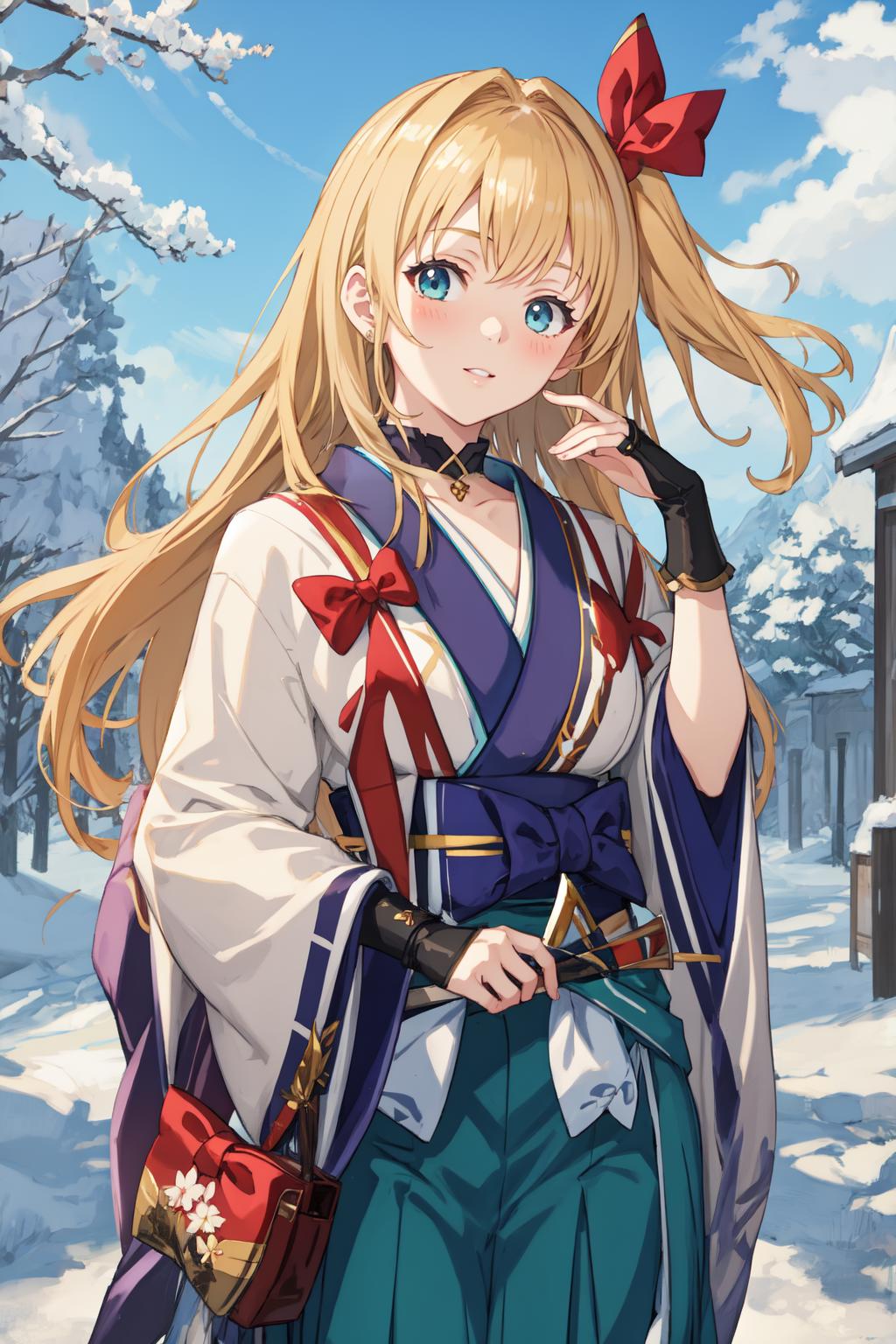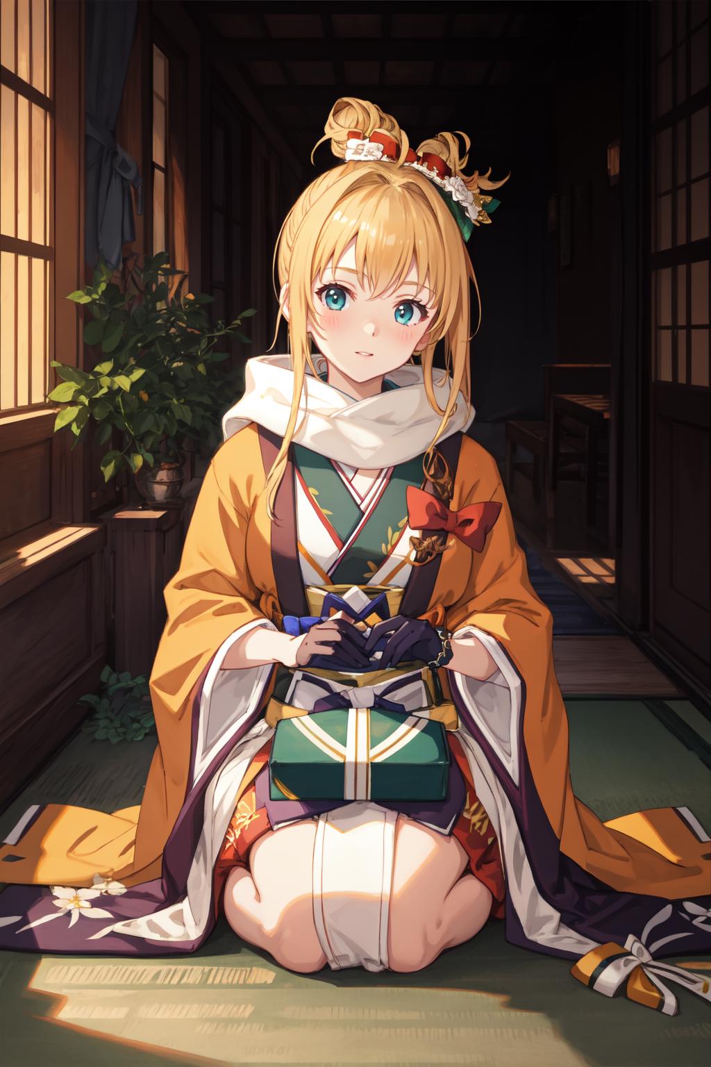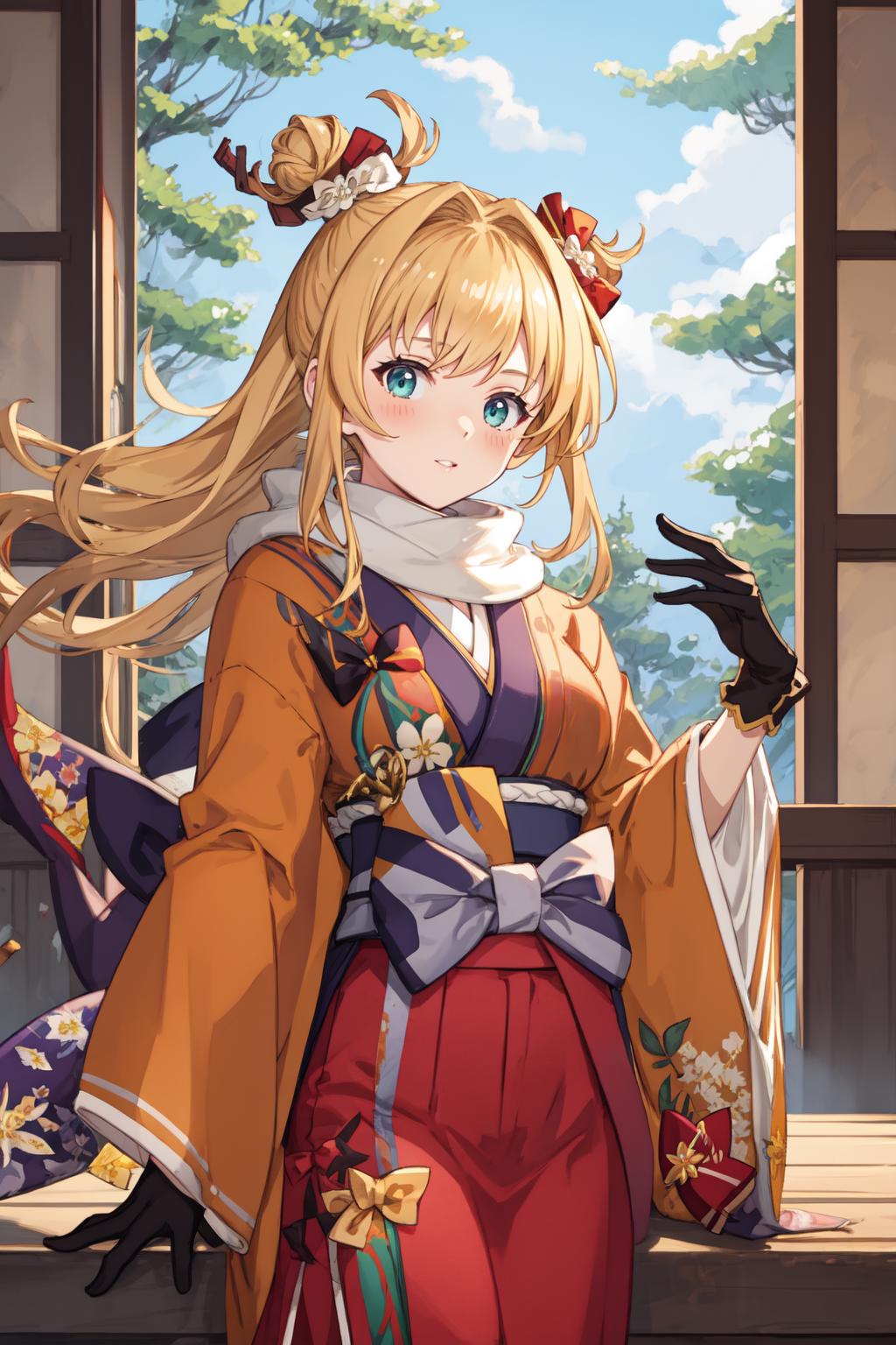mir1ny, hair ornament, green kosode, yellow kimono, orange hakama, black gloves, gray scarf, red bow, single hair bun