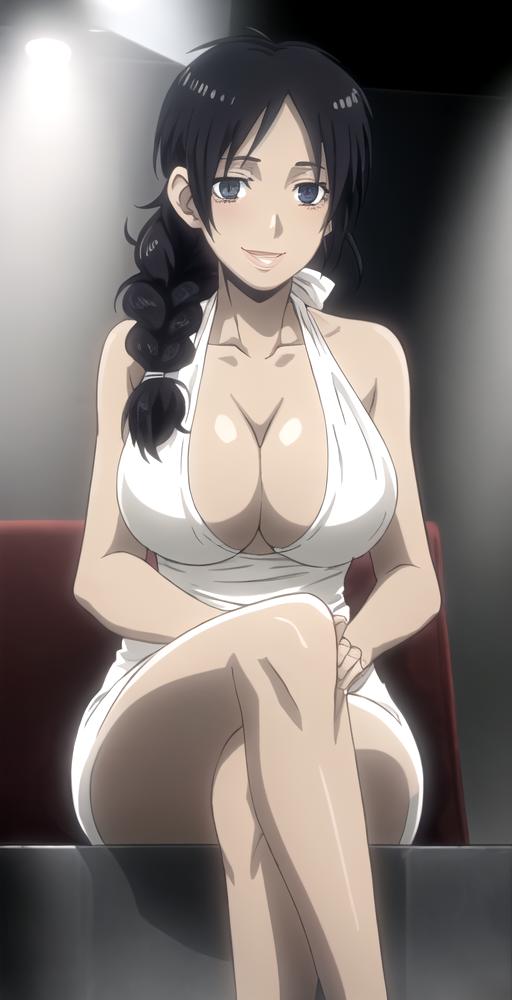 Evening Dress, "single braid, hair over shoulder, cleavage, evening dress, halterneck, legs,"