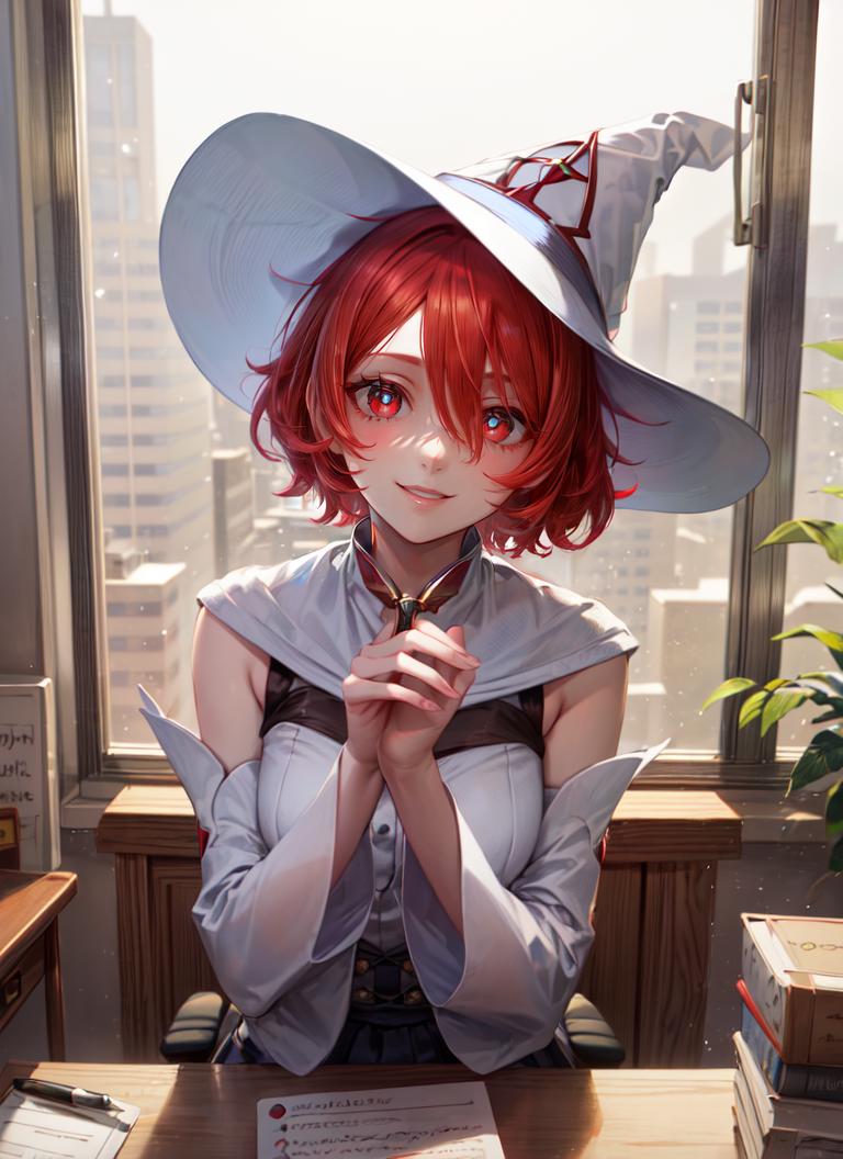 You may want to add "chariot_uniform, white top, witch hat, skirt, thighhighs" to your Prompt