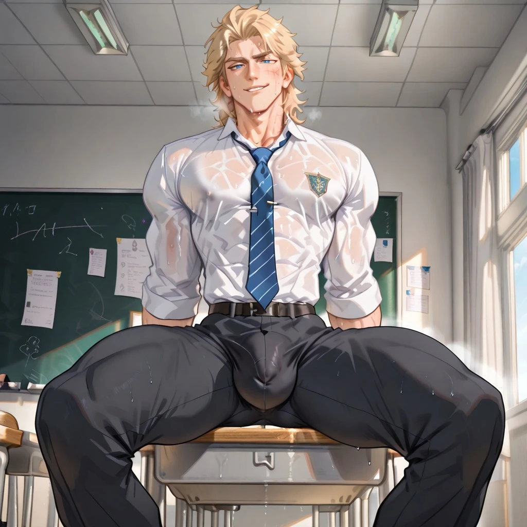 Benji, shaggy blonde hair, blue eyes, scar on lip