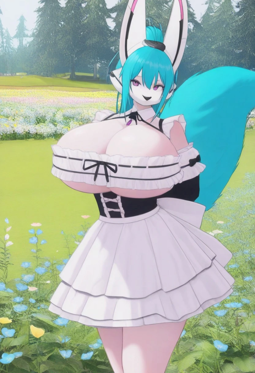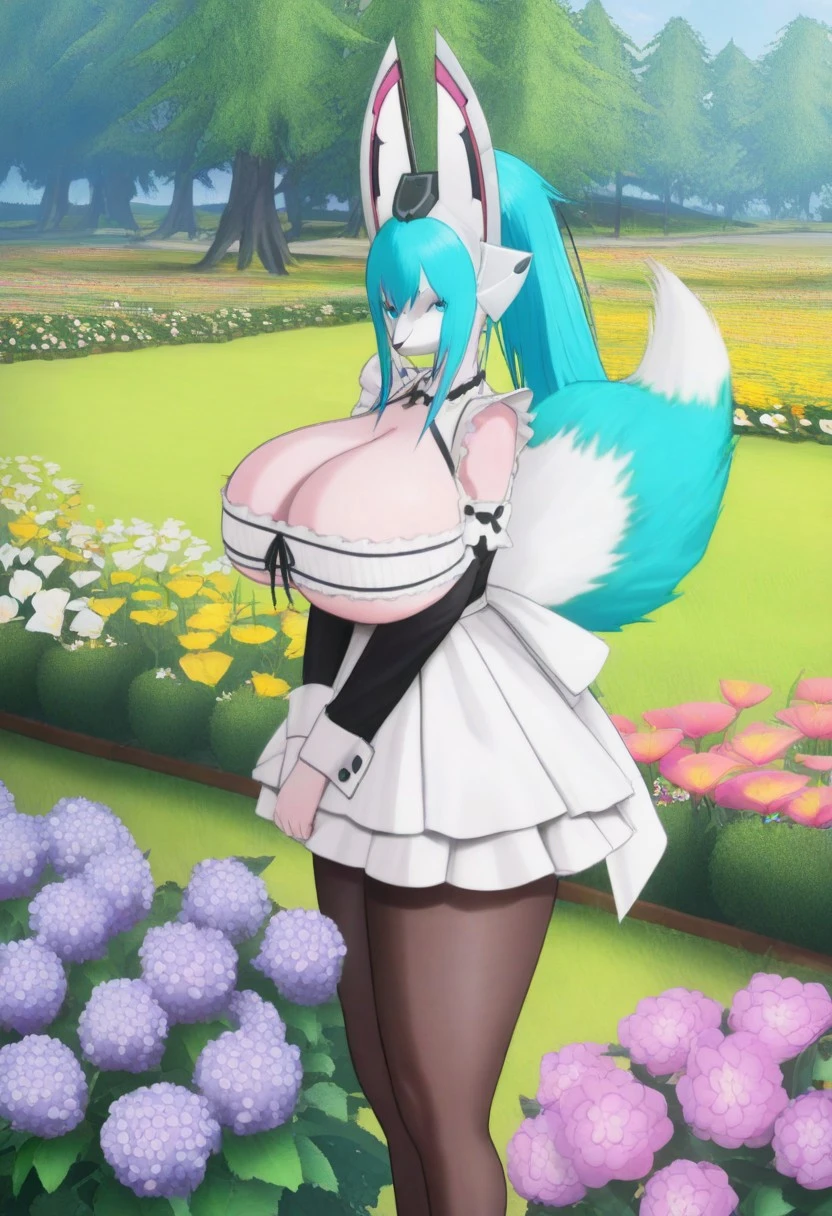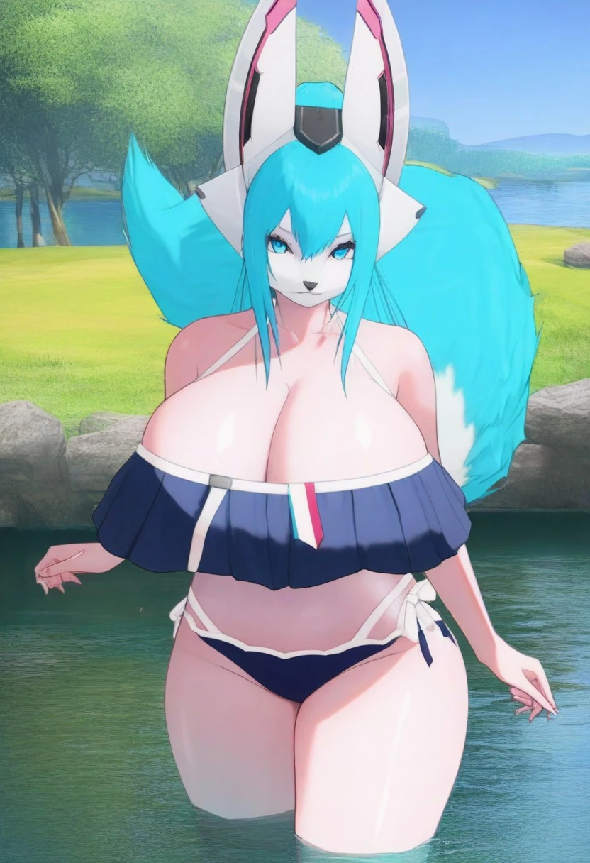 1girl, solo, Mistcat_PSO2NGS, furry female, long ponytail blue hair, fox tail, huge breasts, curvy, thicc, cute,