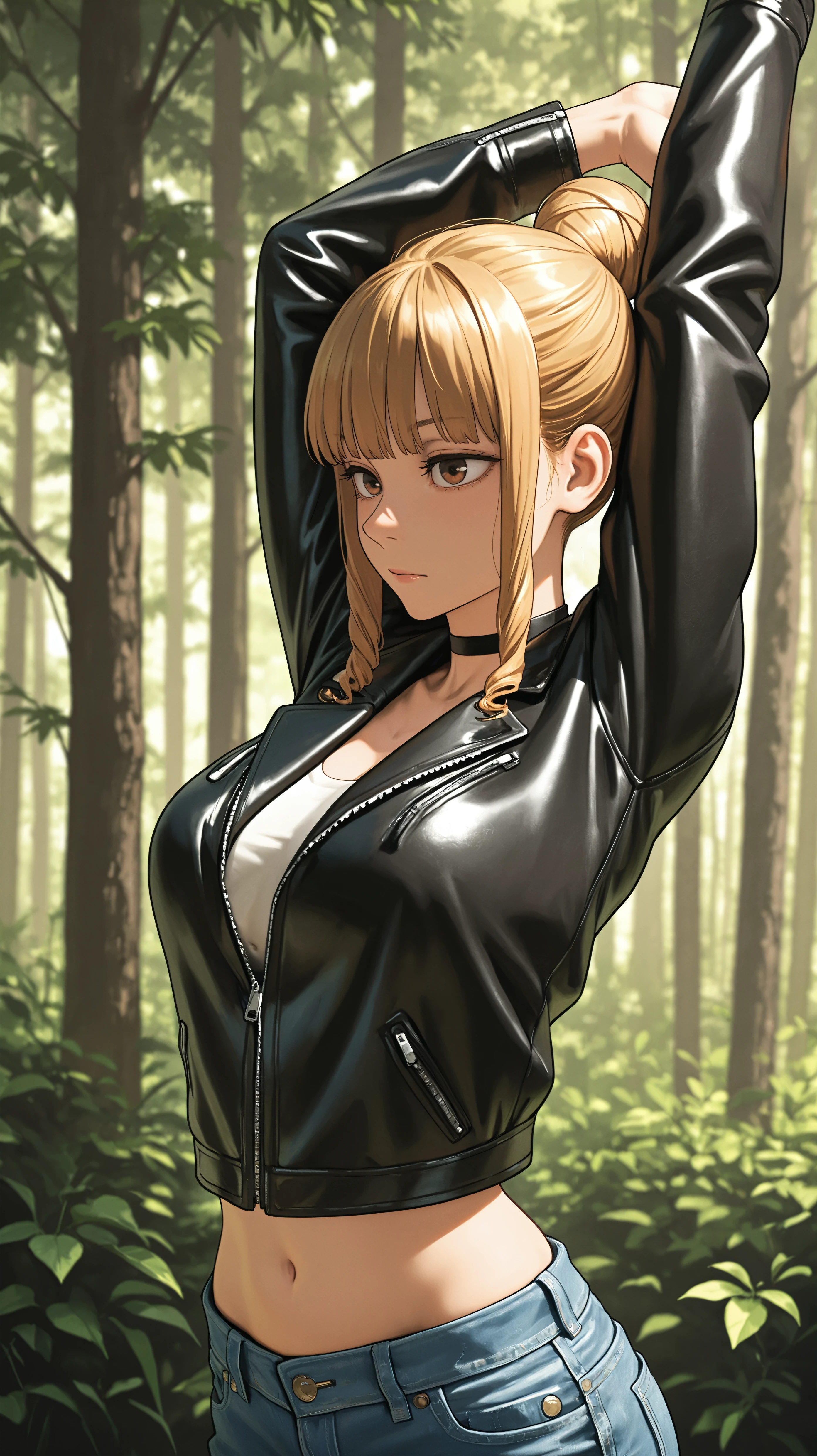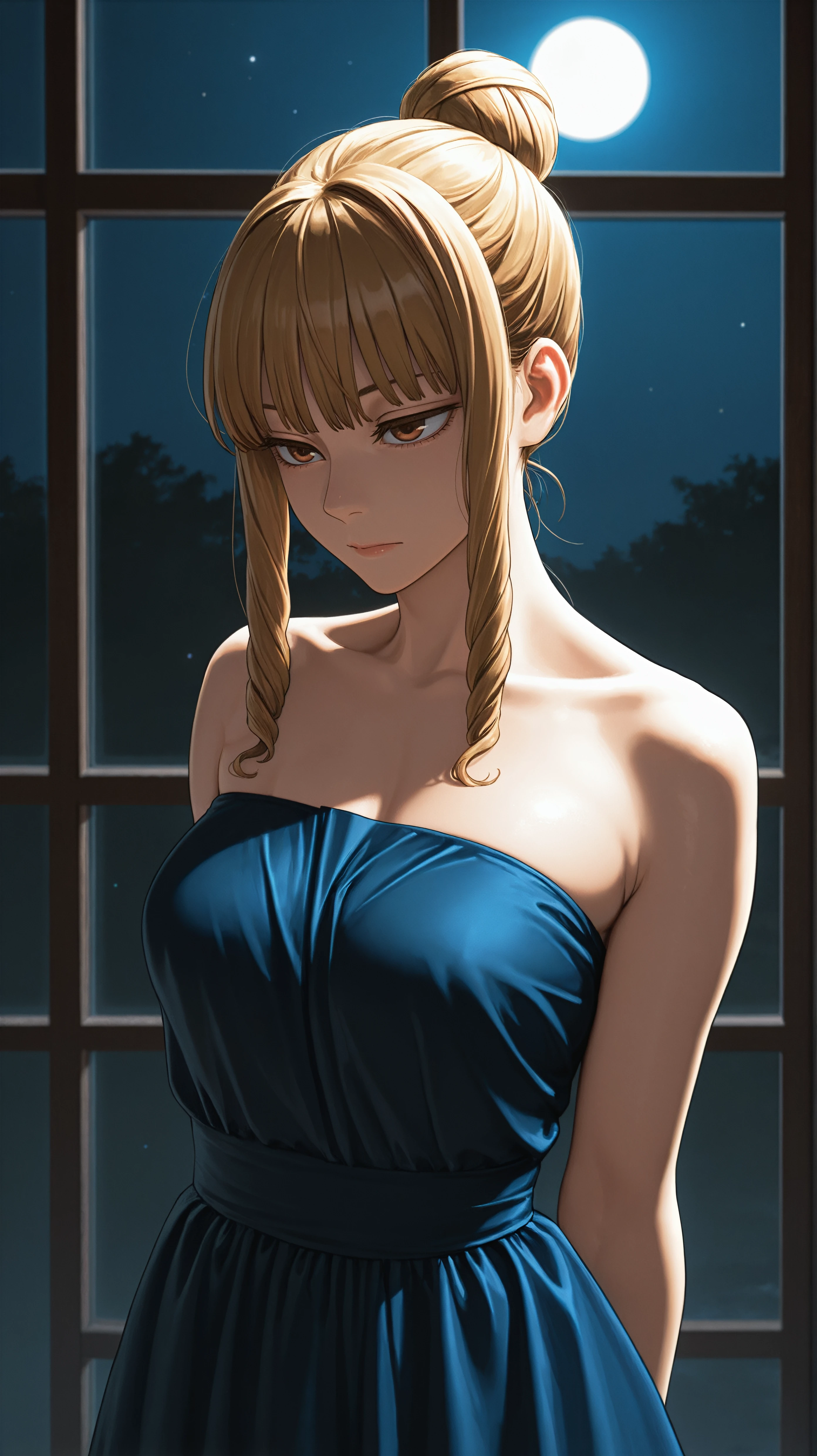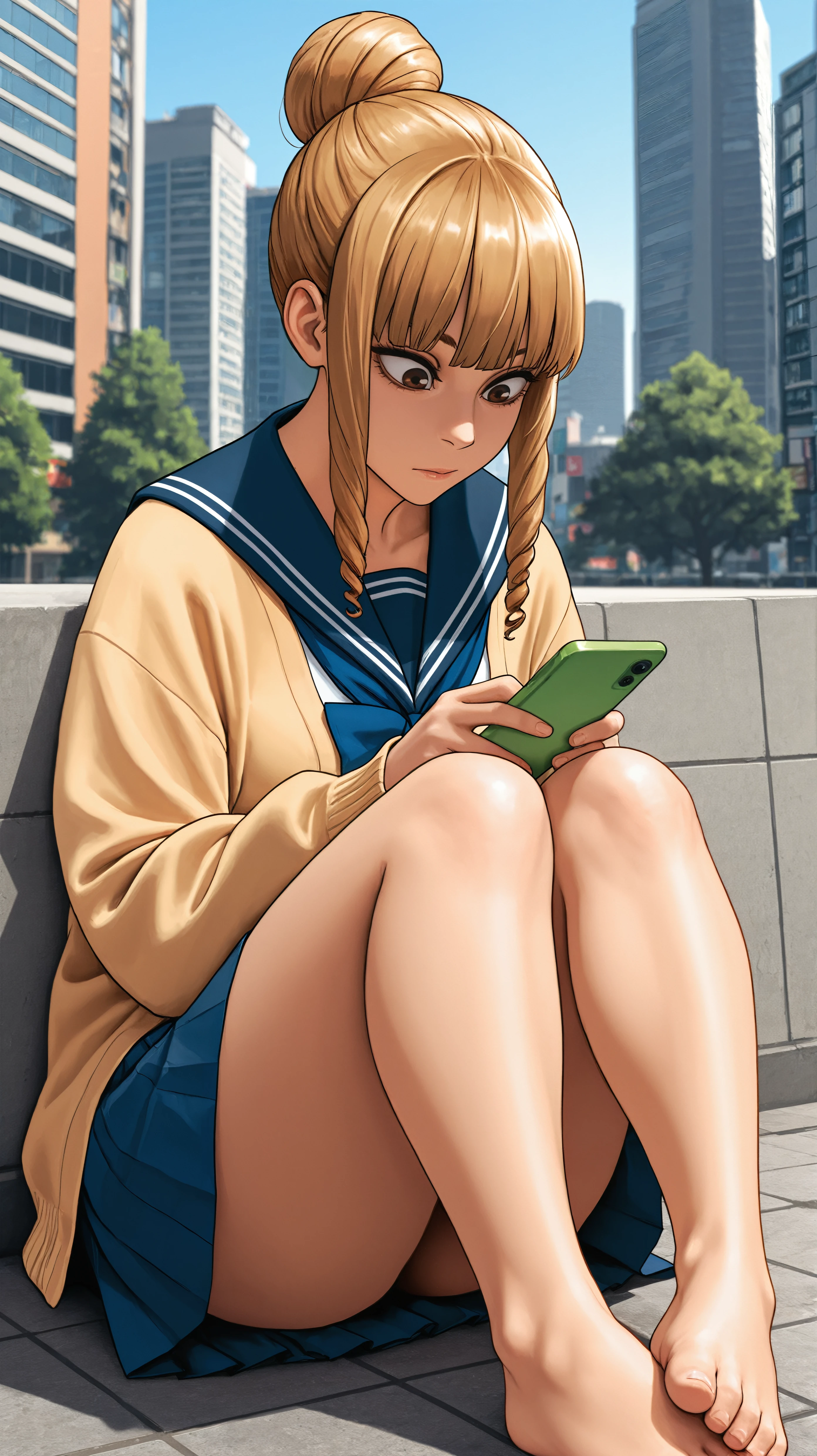 blonde brown hair, single hair bun, brown eyes, yellow cardigan, blue pleated skirtDescription