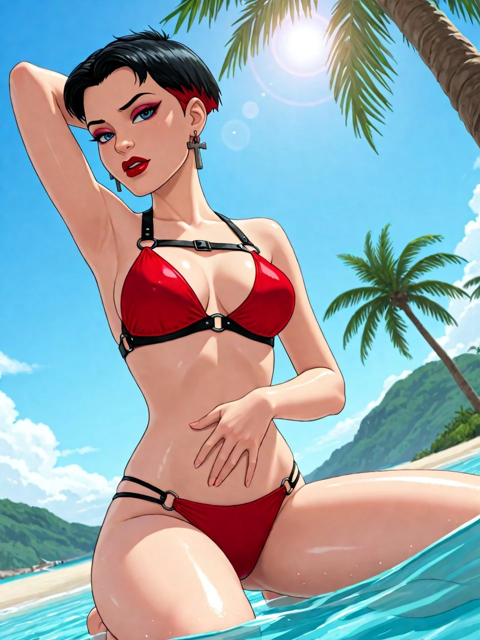 • acc: eyeshadow, (red/scarlet) lipstick, (red/scarlet or black) nail polish, ankh earrings