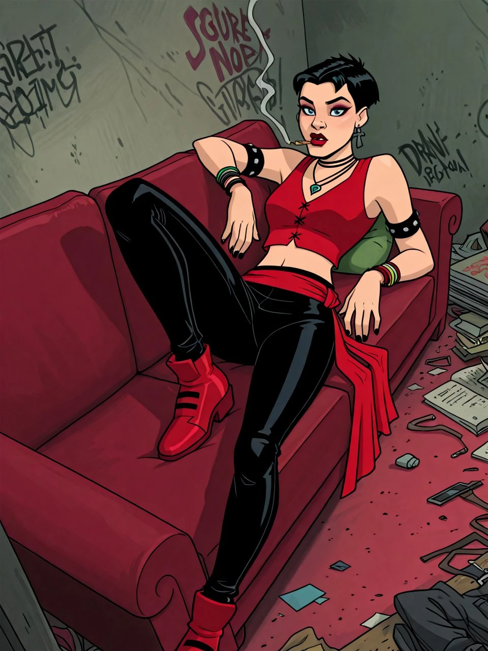 • "casual" outfit: (red/scarlet) gothic crop top, (black) pants, (dark red/crimson) shoes