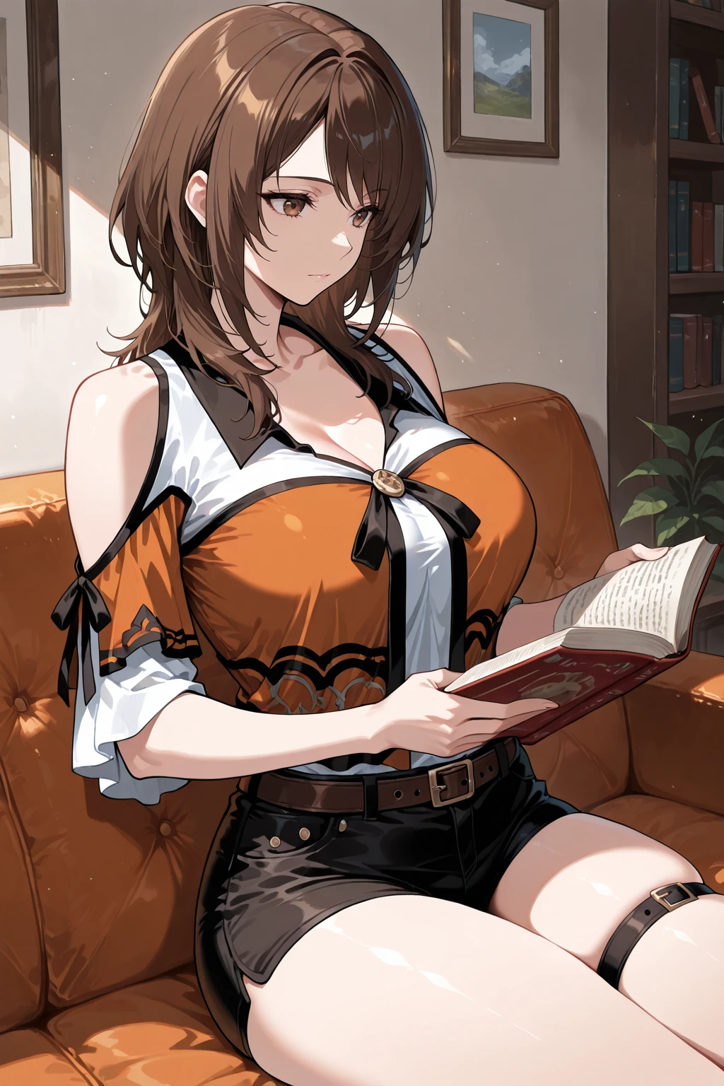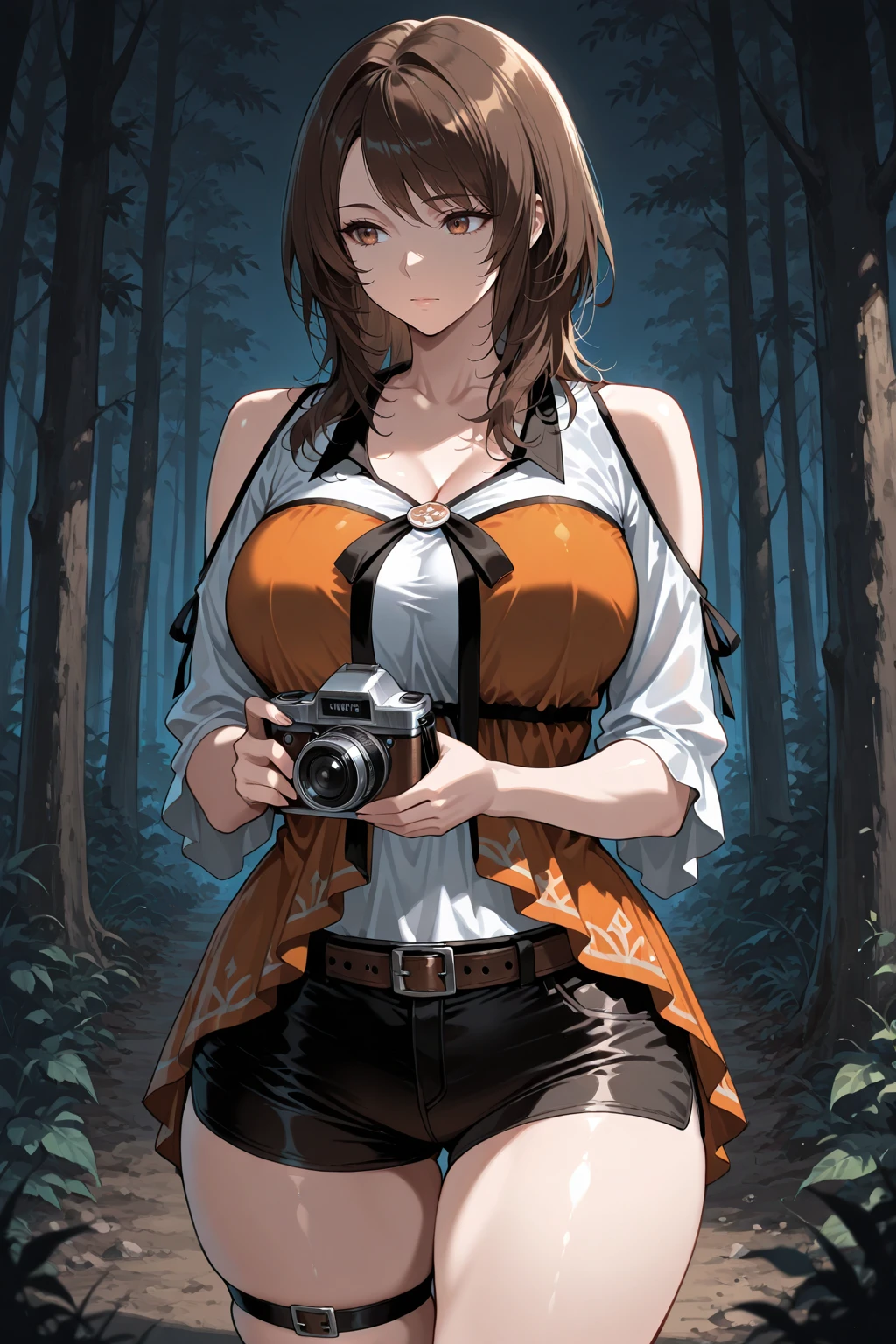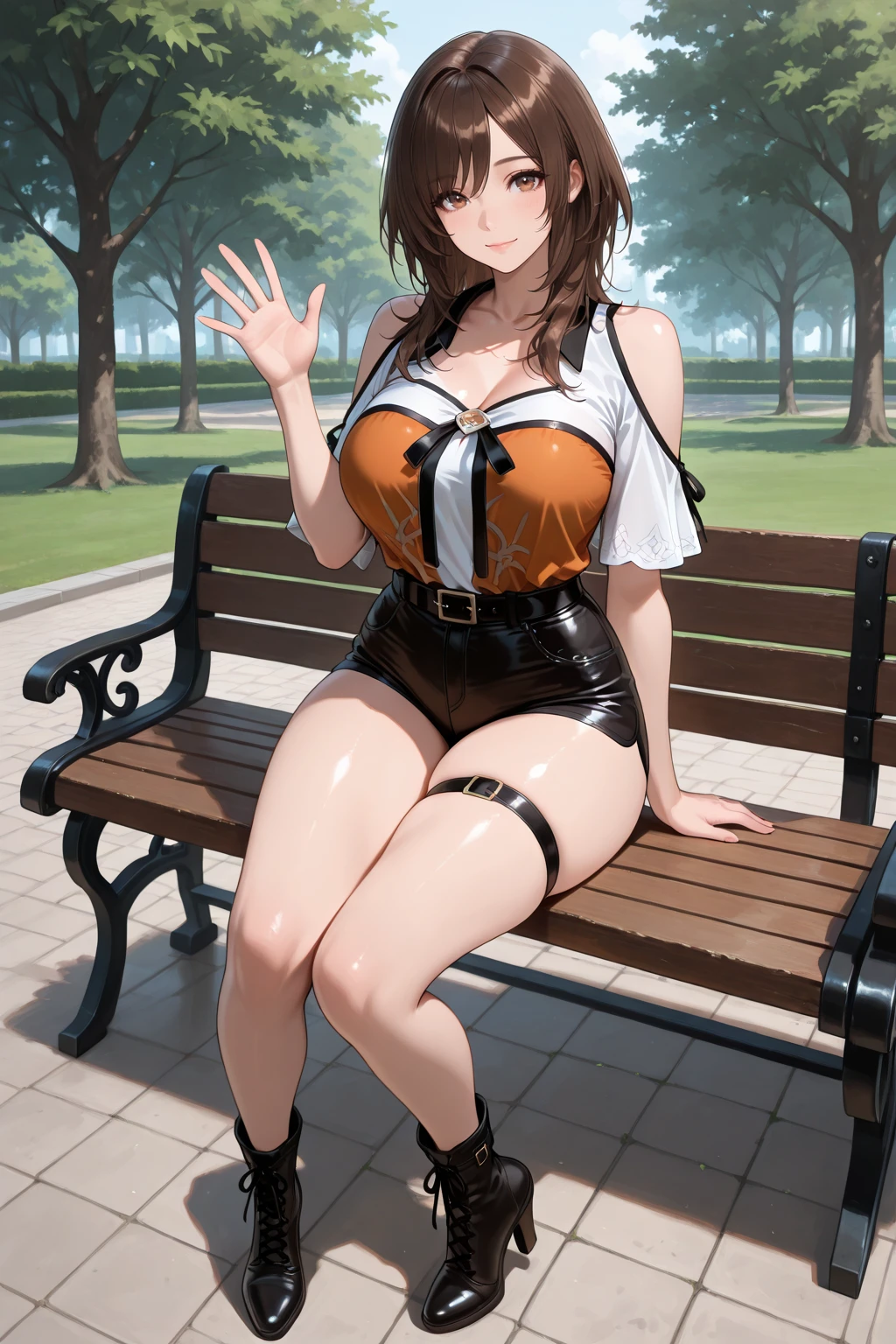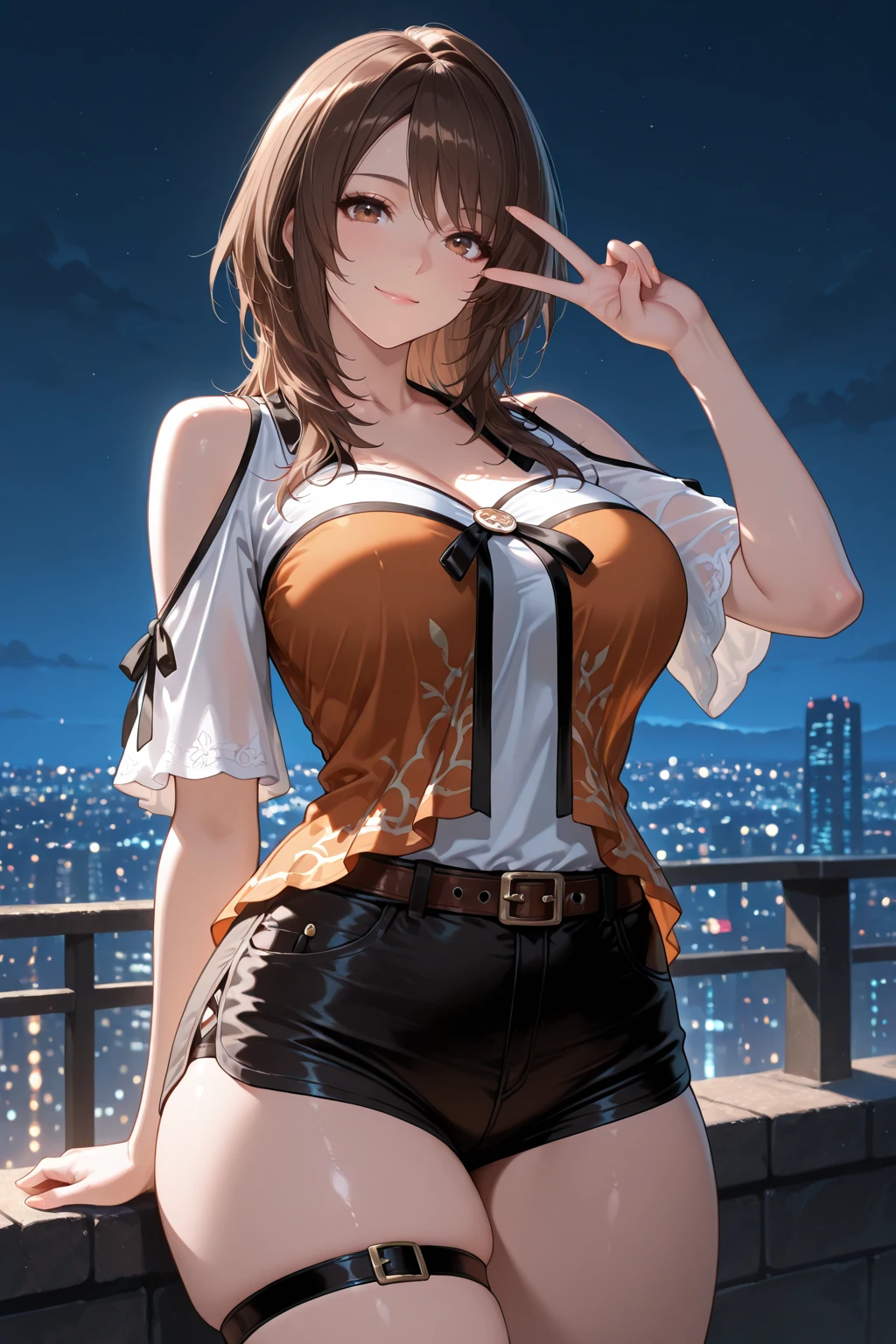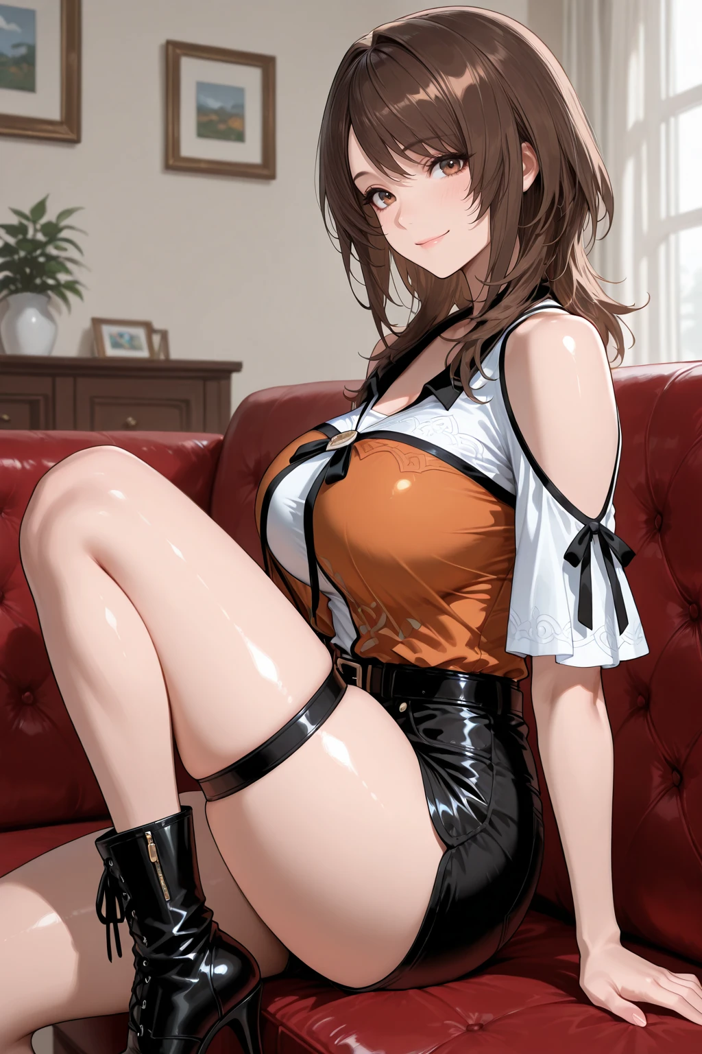 white and orange shirt, white undershirt, shoulder cutout, shoulders, two-tone shirt, belt, black short shorts, thigh strap, boots, high heels