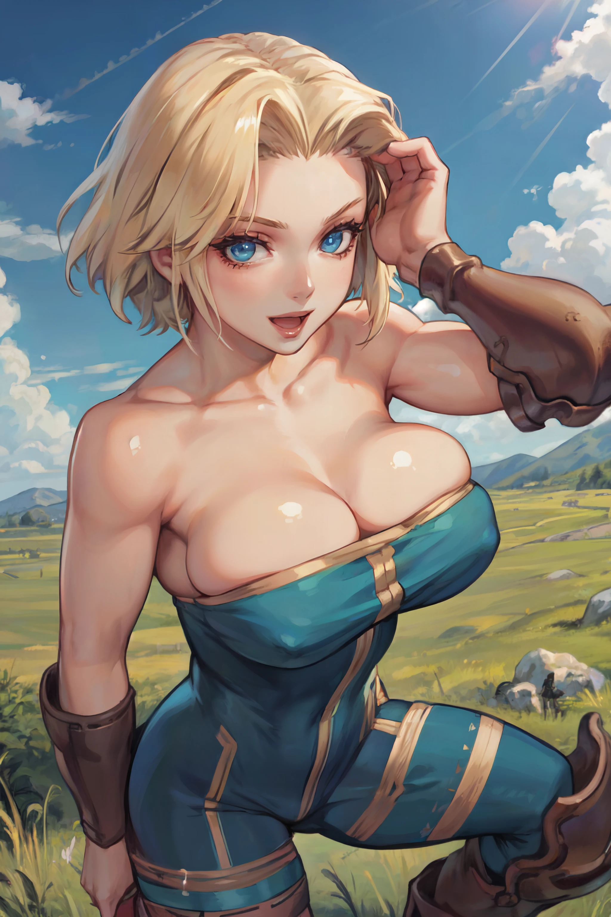Default Outfit: MonkFFT, short hair, blonde hair, blue eyes, muscular female, strapless, bare shoulders, blue unitard, gauntlets, boots,