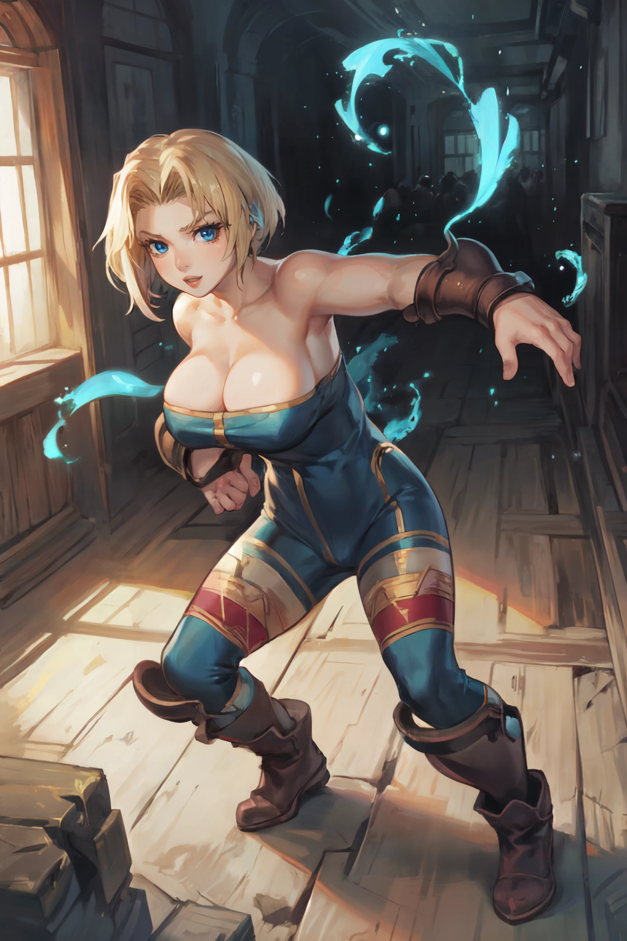 MonkFFT, short hair, blonde hair, blue eyes, muscular female, strapless, bare shoulders, blue unitard, gauntlets, boots,