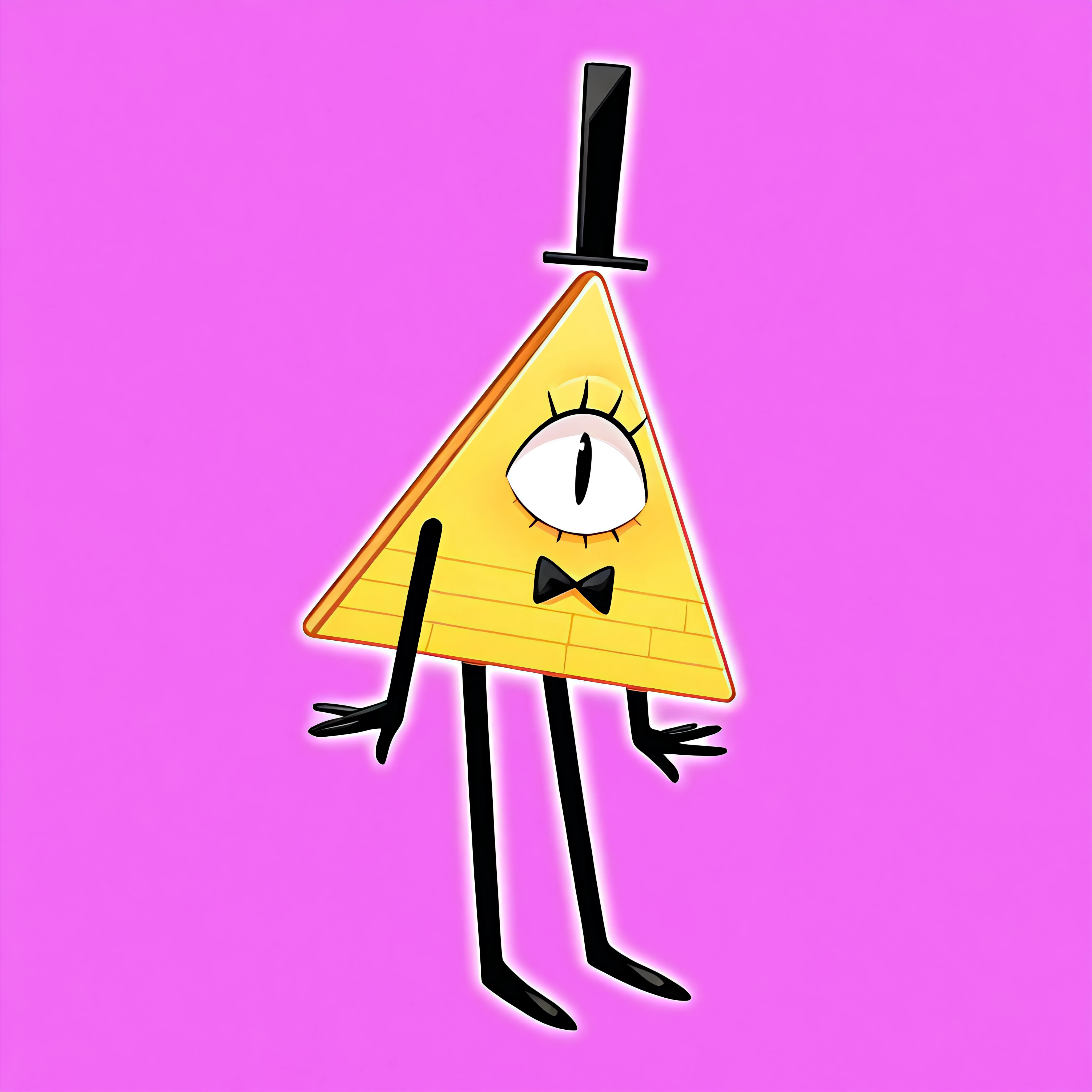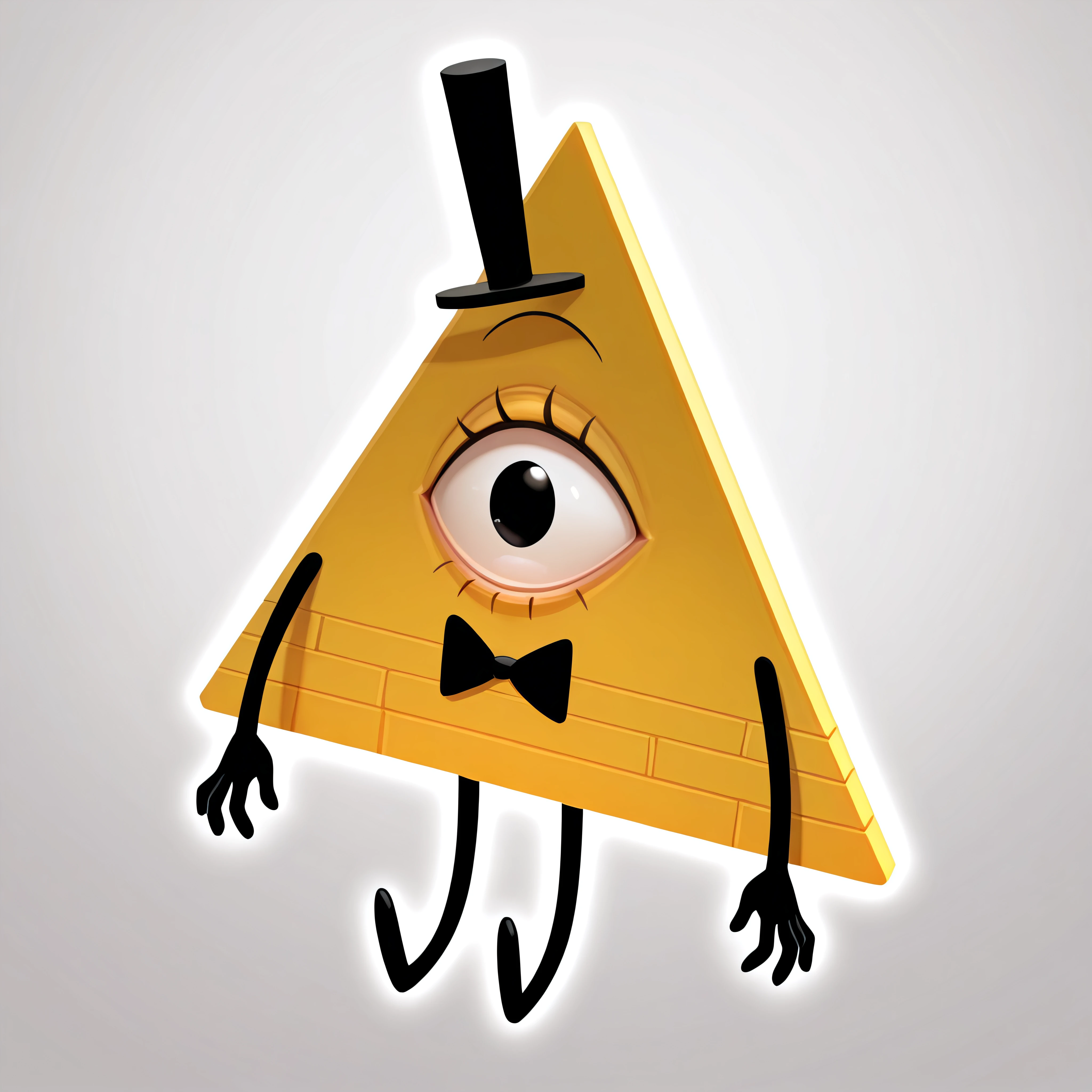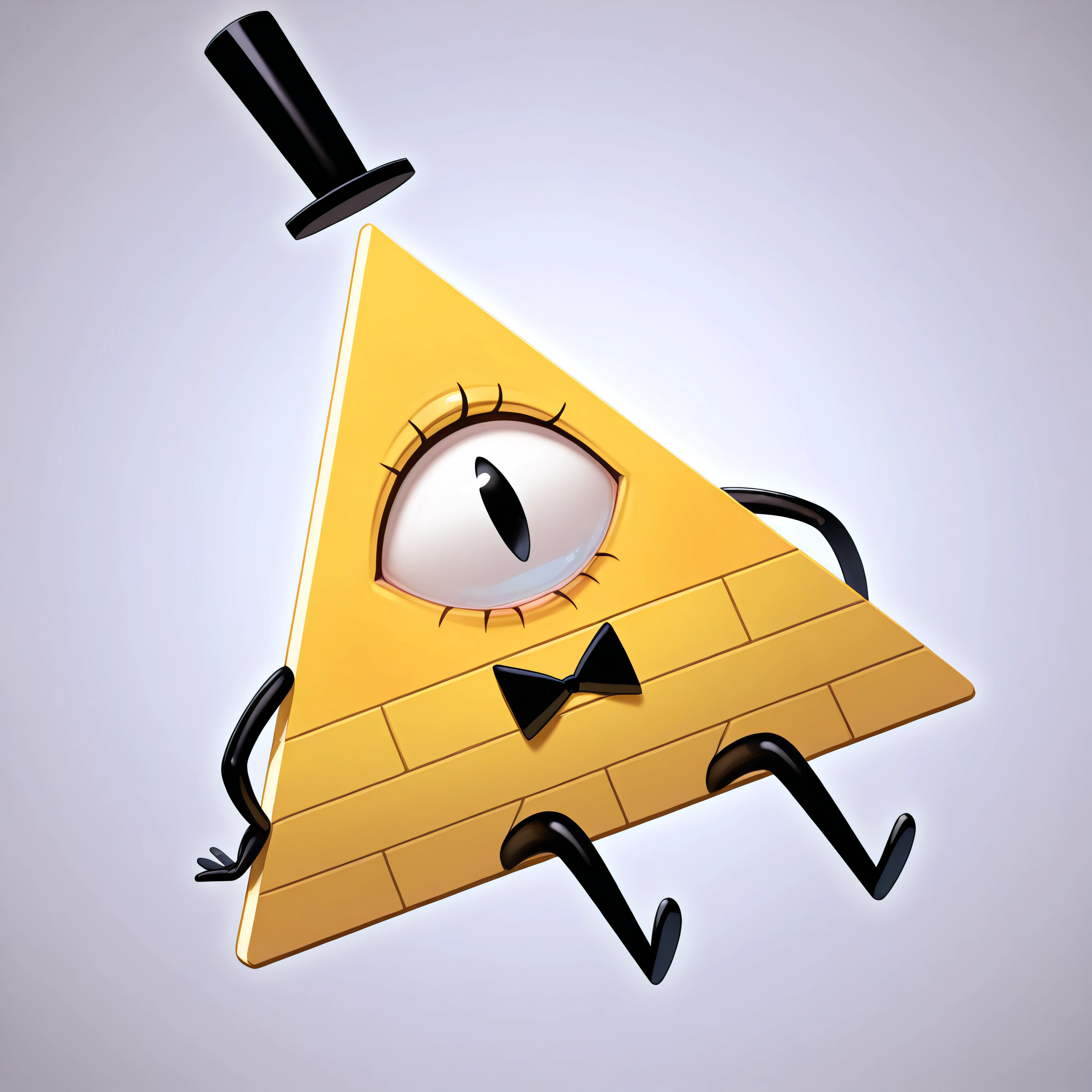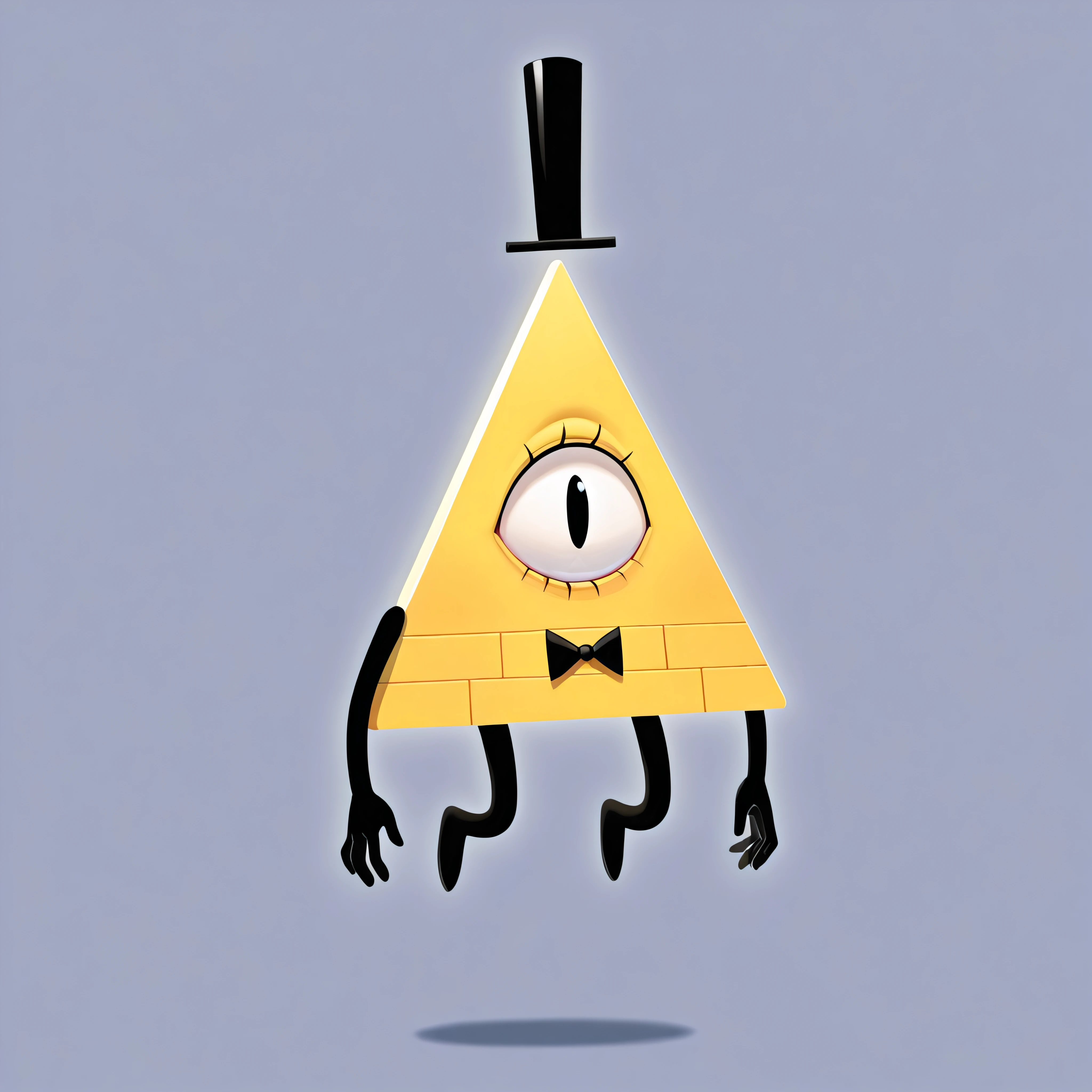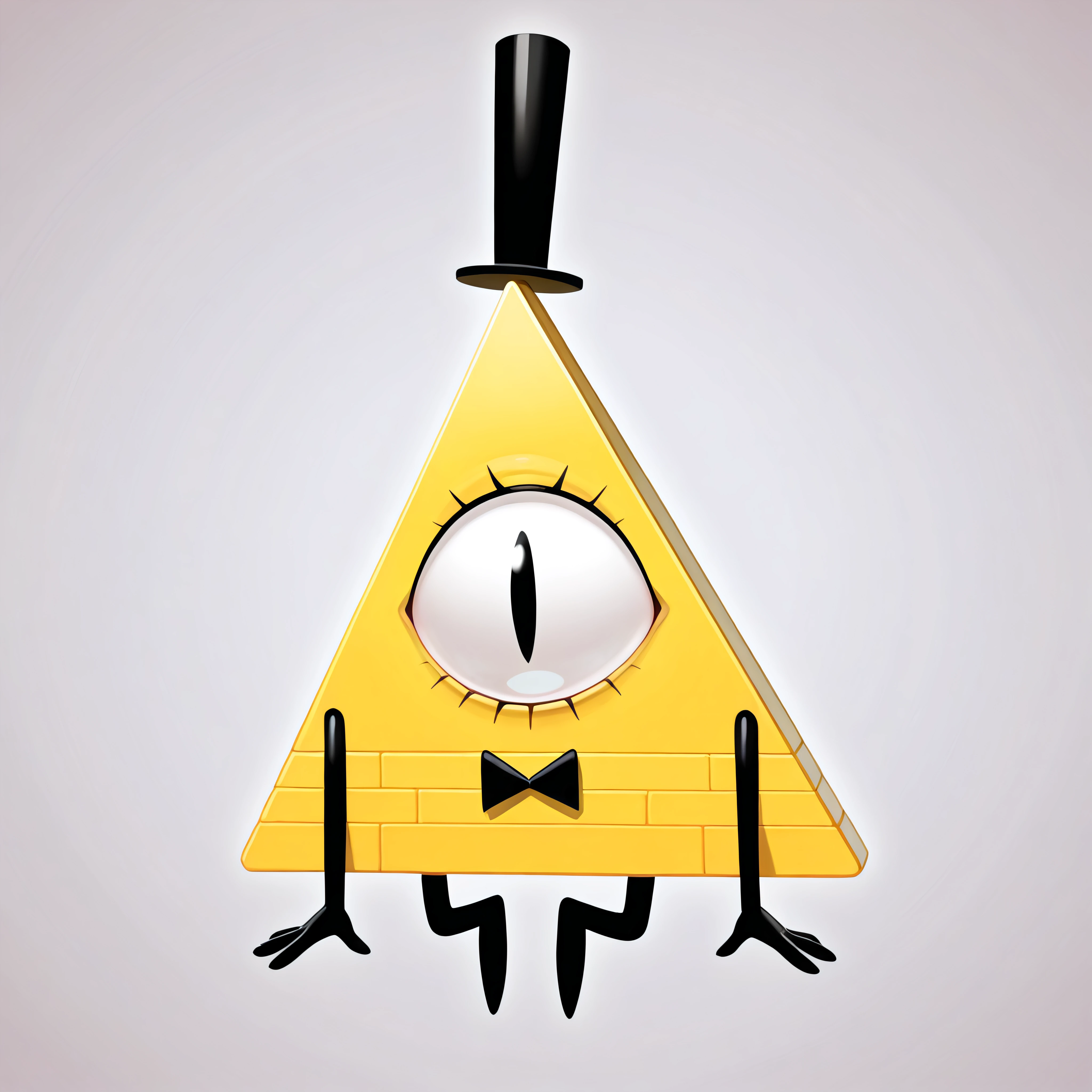 Bill_cipher, yellow triangle, black eyes, bow tie, black hands, black legs, black hat