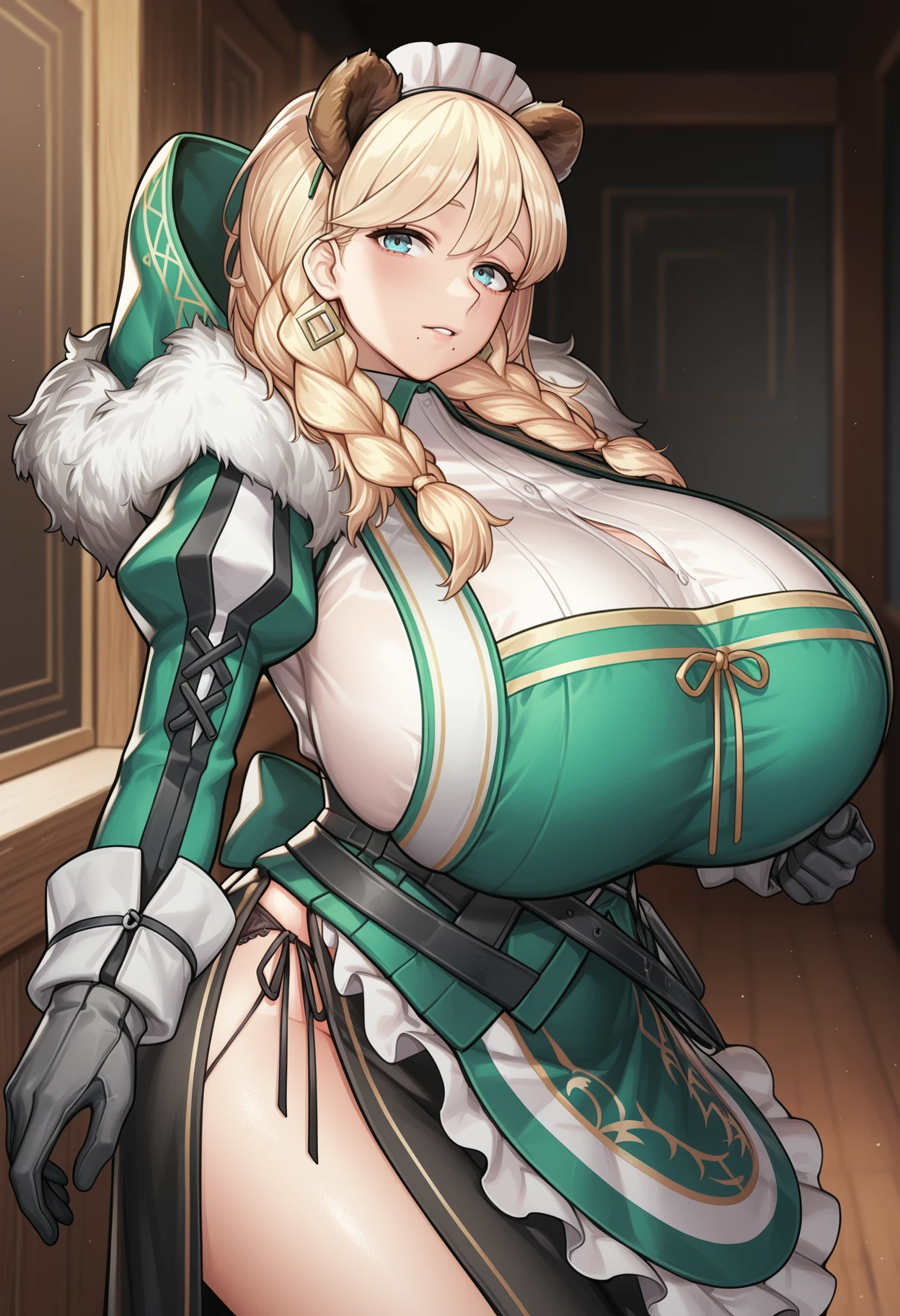 fr1d3f, bear ears, blue eyes, blonde hair, bear girl, twin braids, fur trim, maid headdress, earrings, gigantic breasts, german clothes, mole under mouth, gloves, long skirt, hood, side-tie panties,