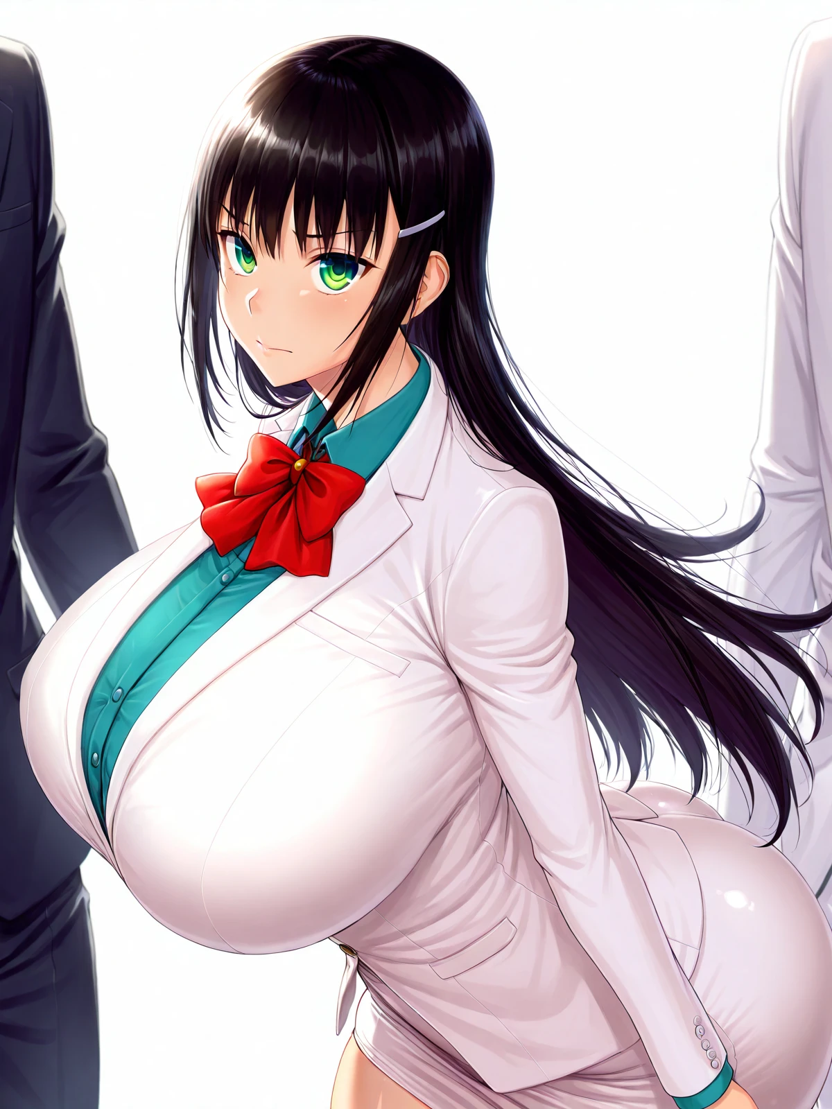 mako_suit,clothed female,aqua blue shirt,bowtie, red bow, shirt, white jacket,pencil skirt, long sleeves, suit,tights,stocking,zentai,