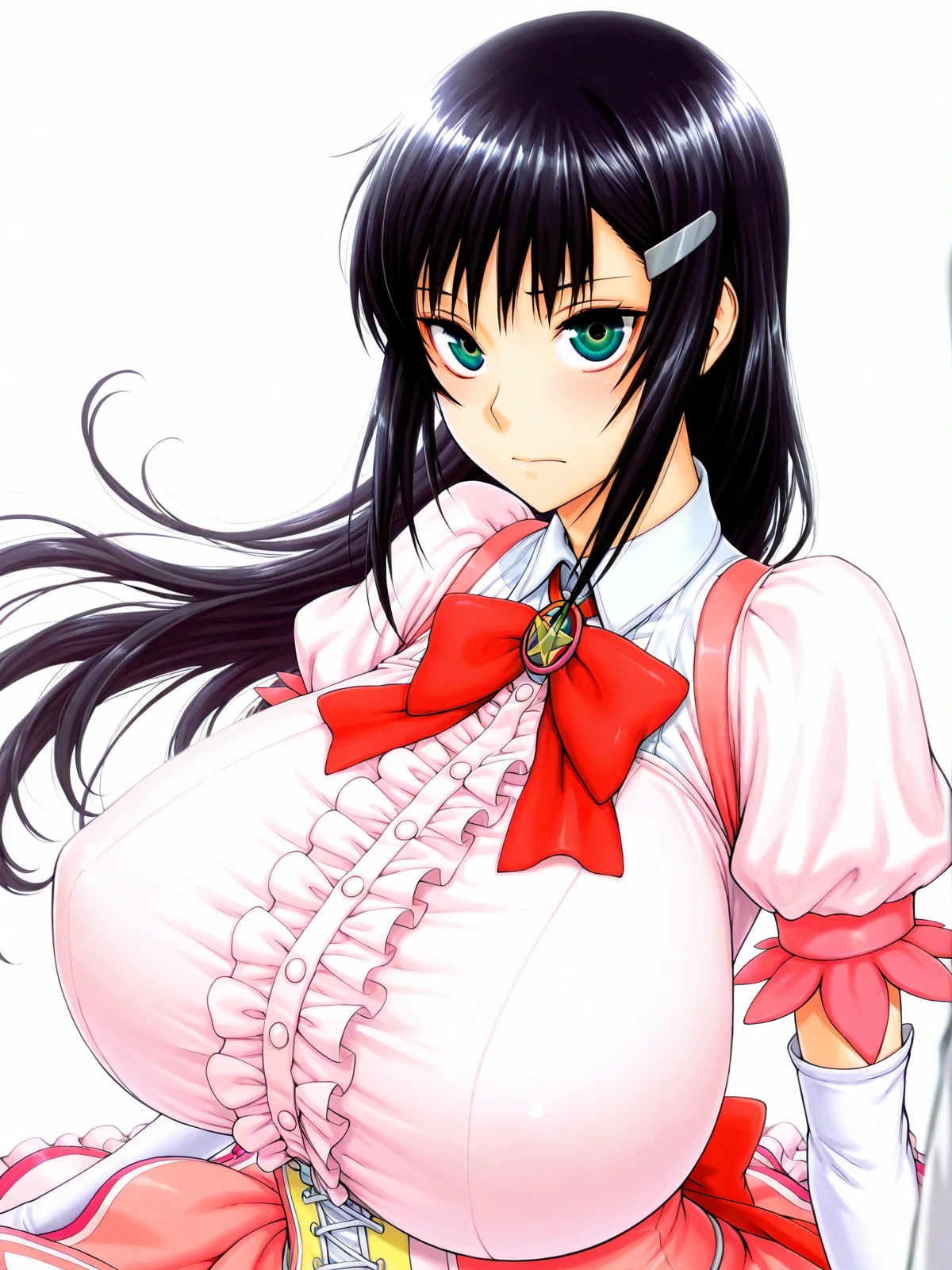 orikawa_mako, long hair,black hair,white hairpin, green eyes,