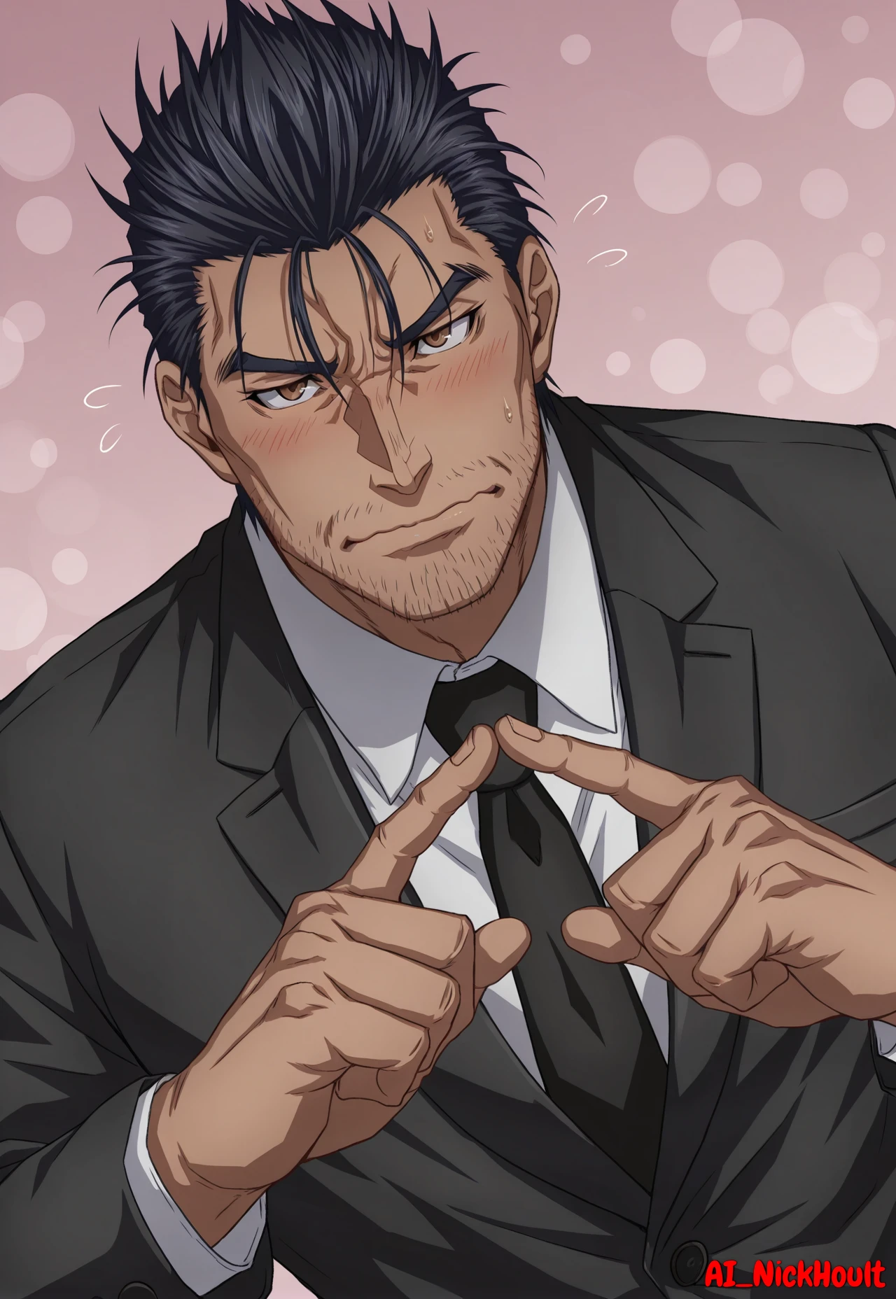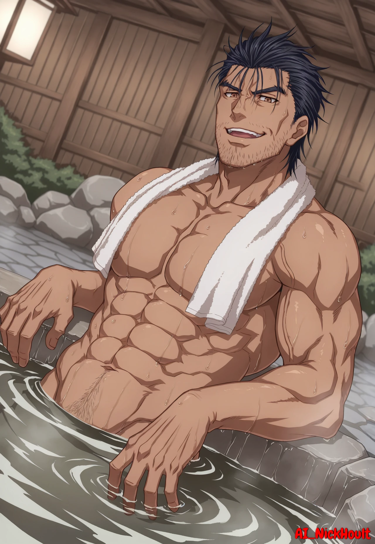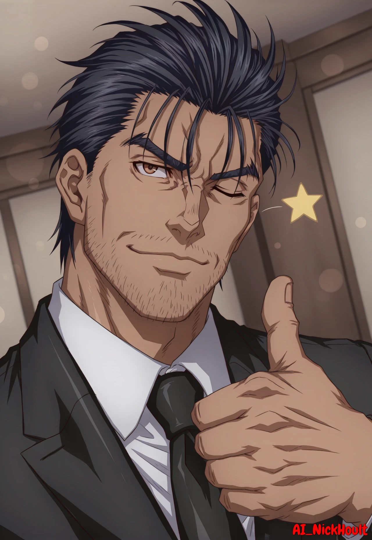 Gauron, mature male, muscular build, black spiky hair, brown eyes, stubble beard,