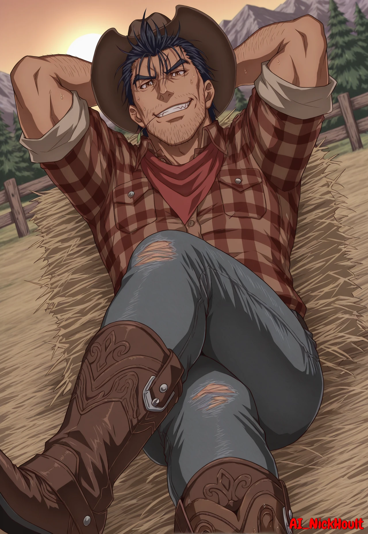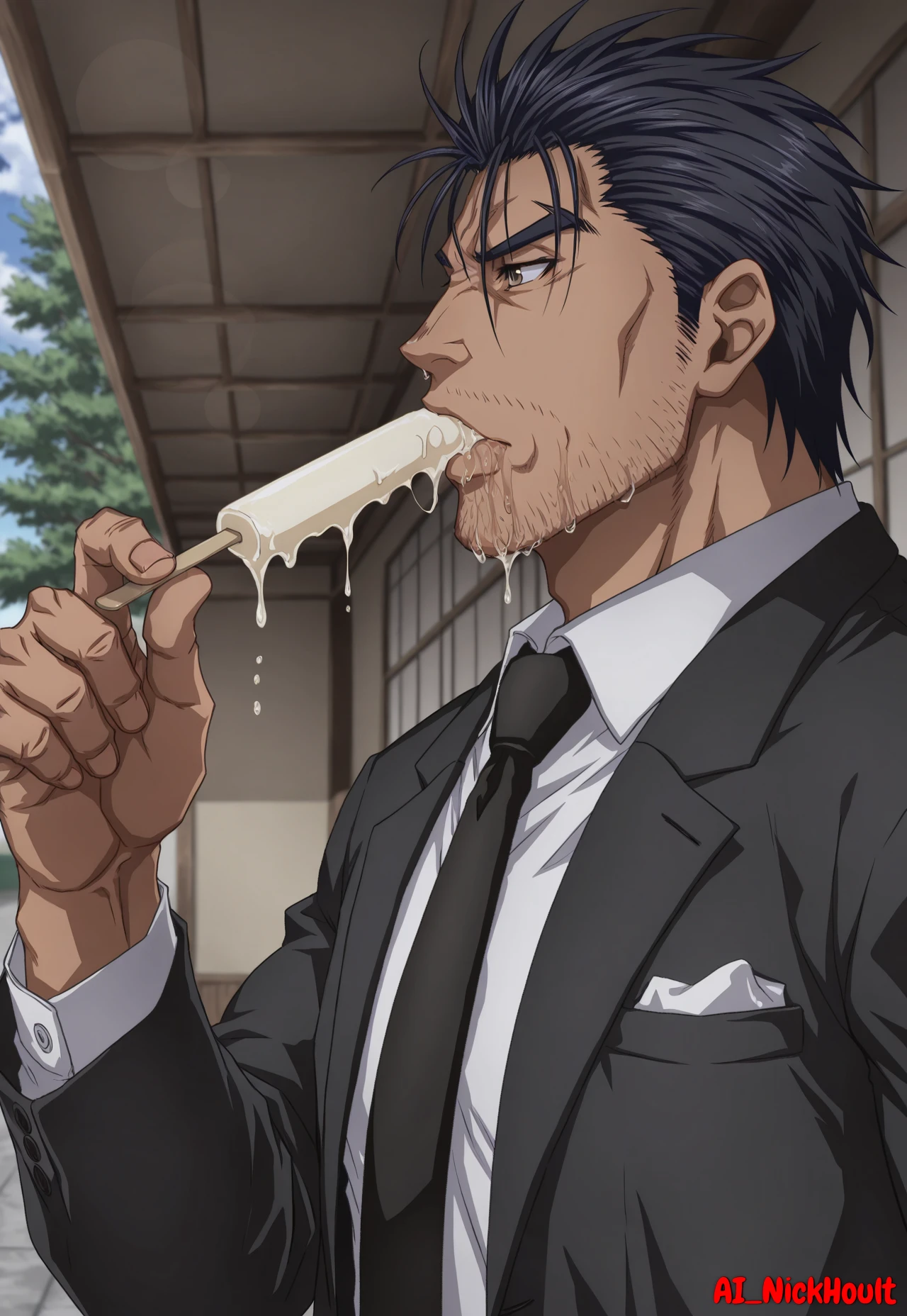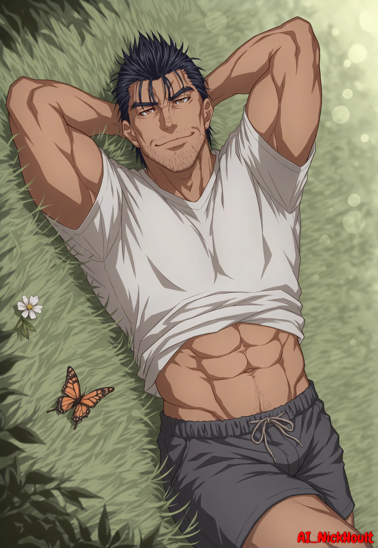 Gauron, mature male, muscular build, black spiky hair, brown eyes, stubble beard,