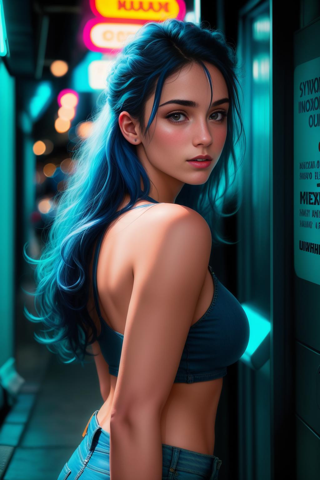 RAW photo, beautiful french 20 year old woman, wearing a tanktop and blue jeans, standing in a neon light alley, ((arms behind back)) (high detailed skin:1.2), 8k uhd, dslr, soft lighting, high quality, film grain, Fujifilm XT3