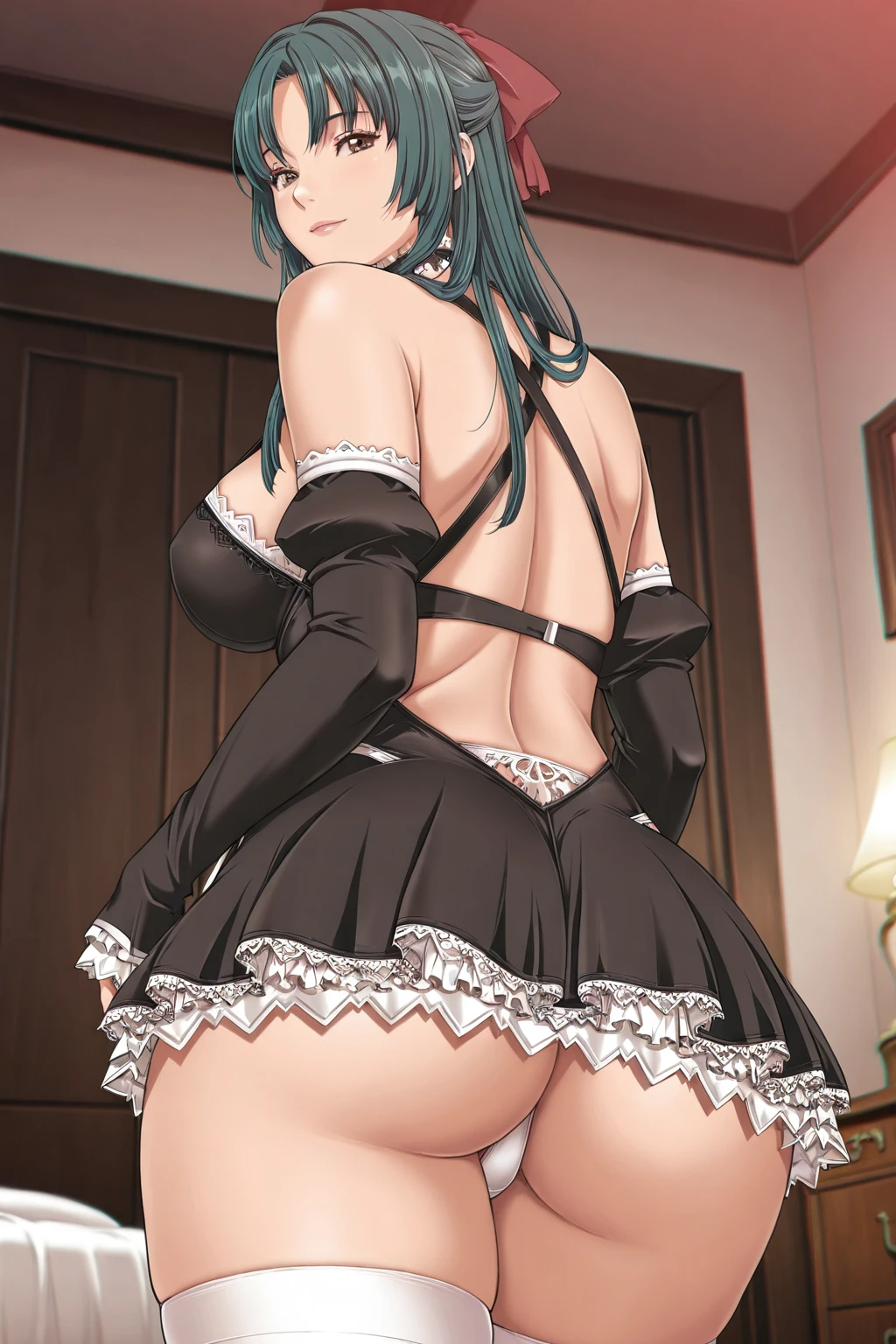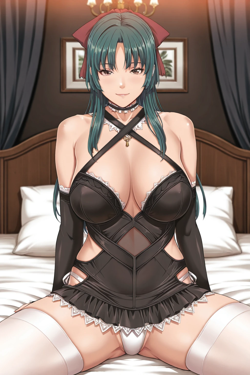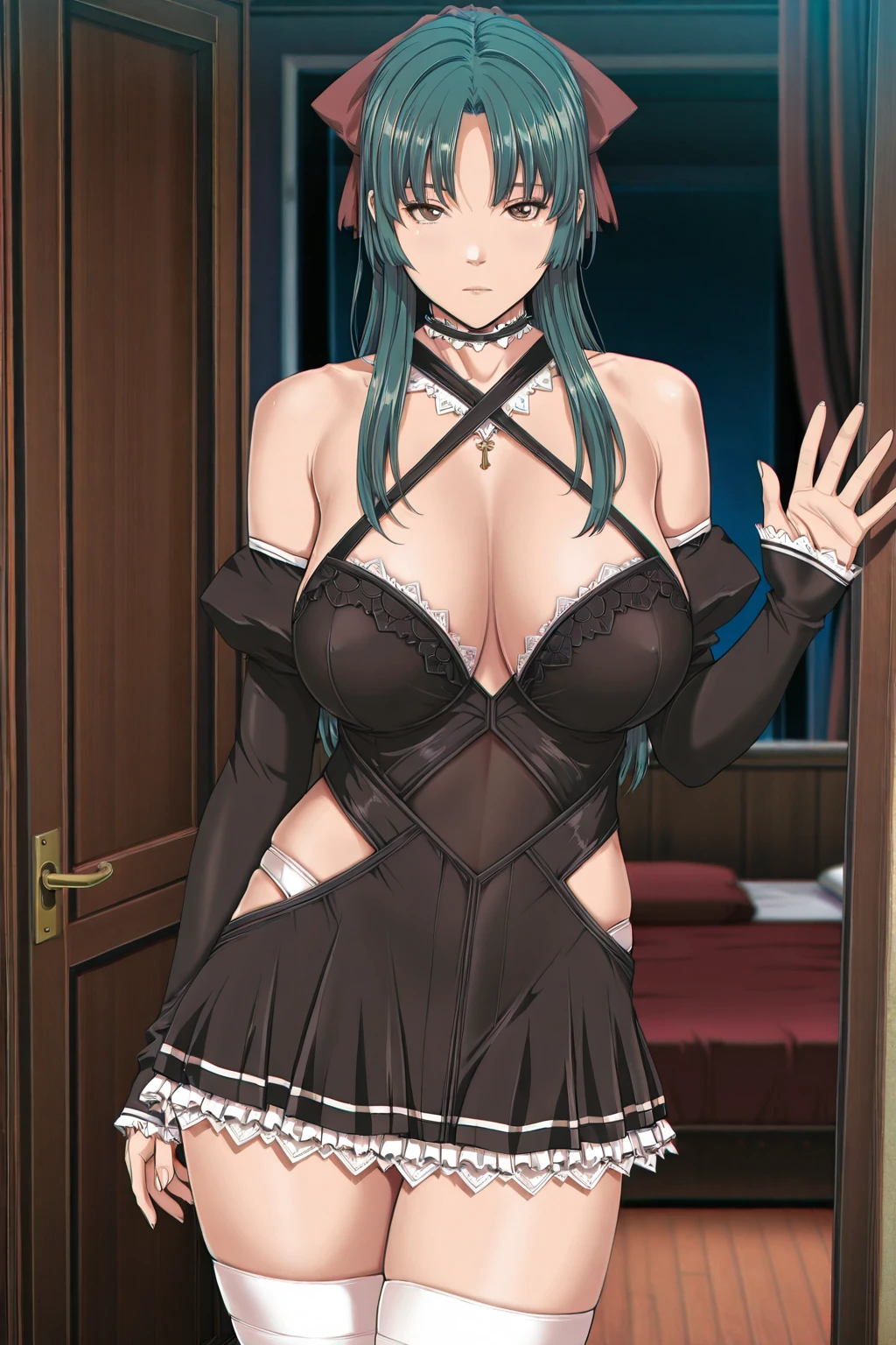 Marika Mamiya, long hair, green hair, parted bangs, brown eyes, black choker, large breasts, hair ornament, hair bow, hair ribbon, frills, bare shoulders, black dress, white thighhighs, red bow, red ribbon, sleeves past wrists, halterneck, criss-cross halter, cross-laced clothes, frilled choker, side cutout, panty straps, Marika's dress