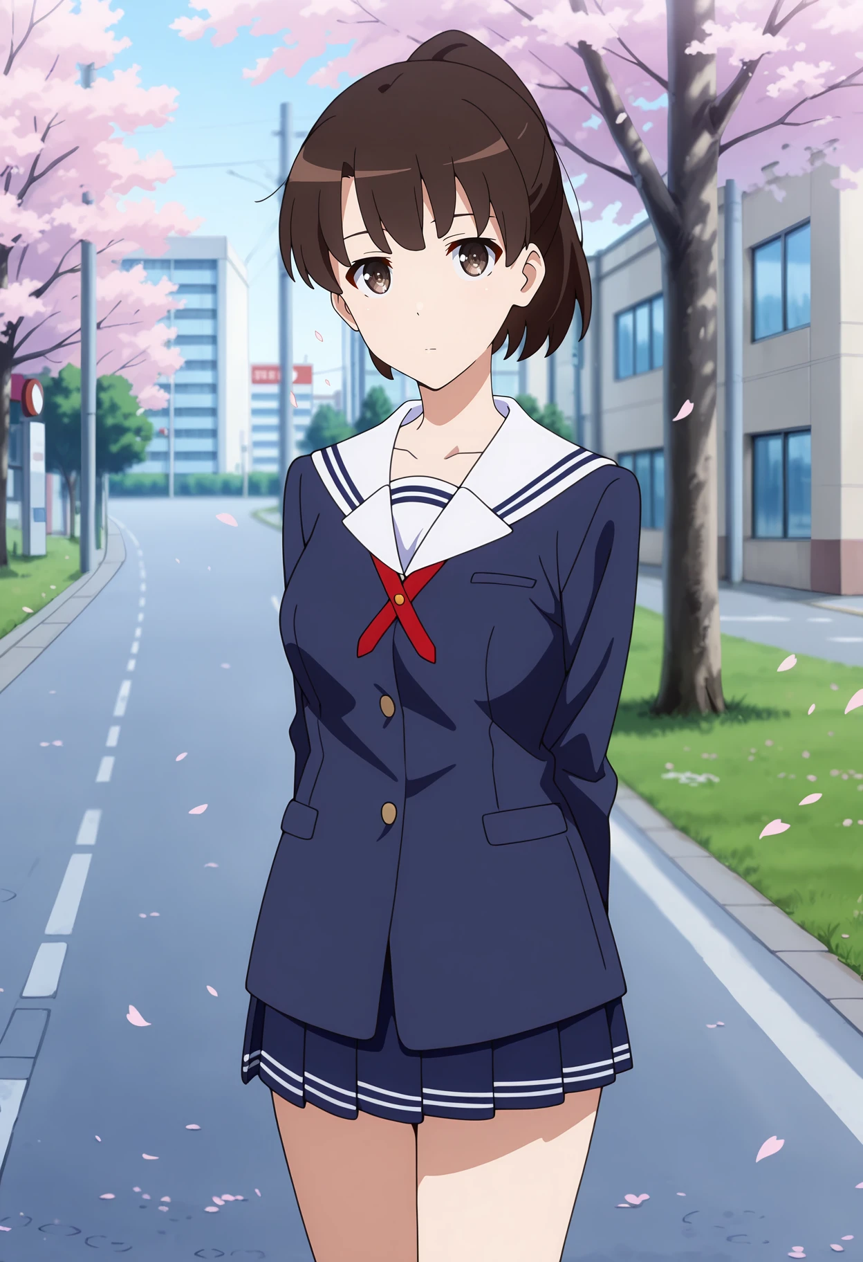 ponytail, short hair, brown hair, brown eyes