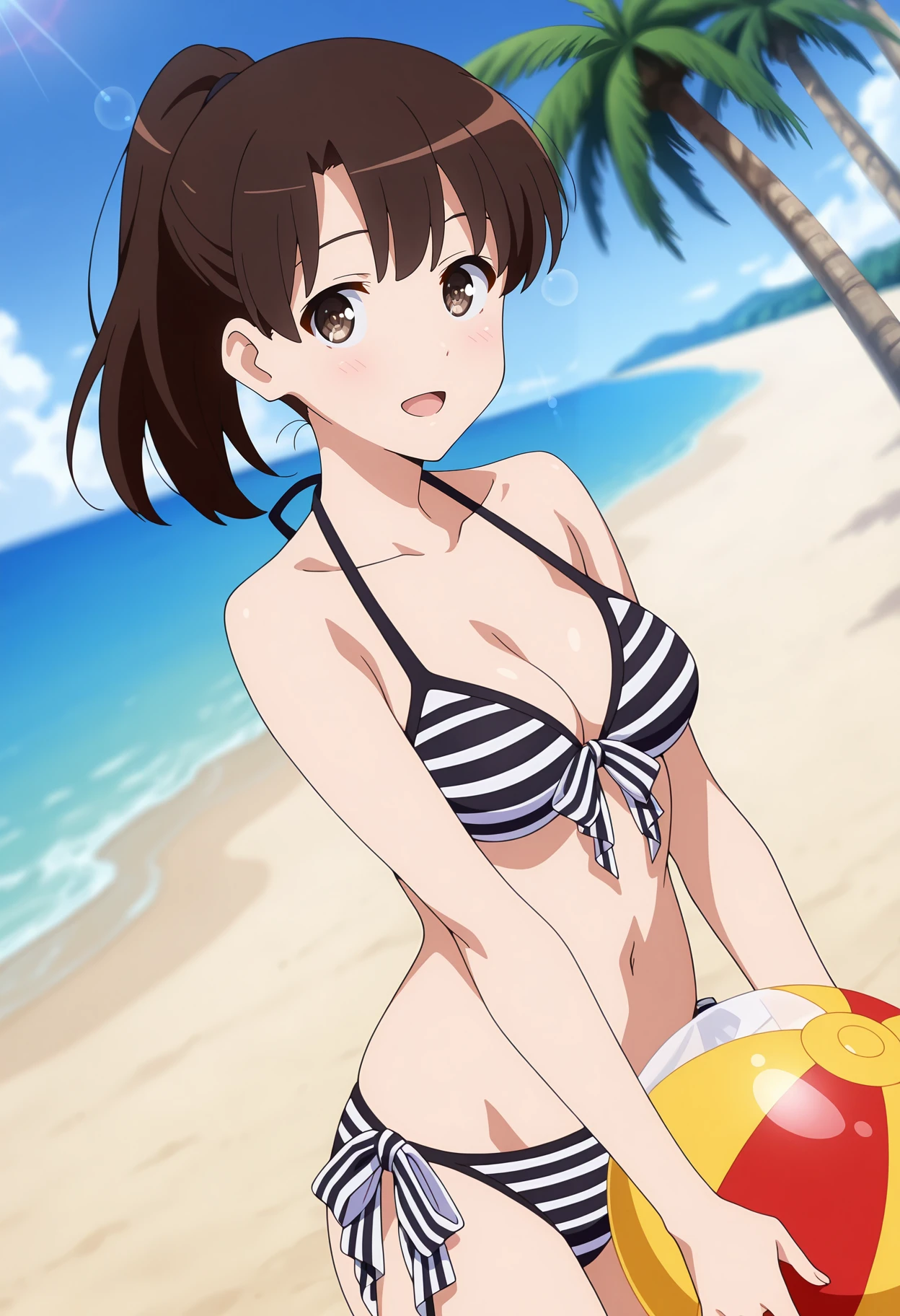 front-tie bikini top, striped bikini, white bikini, black bikini, medium breasts, side-tie bikini bottom
