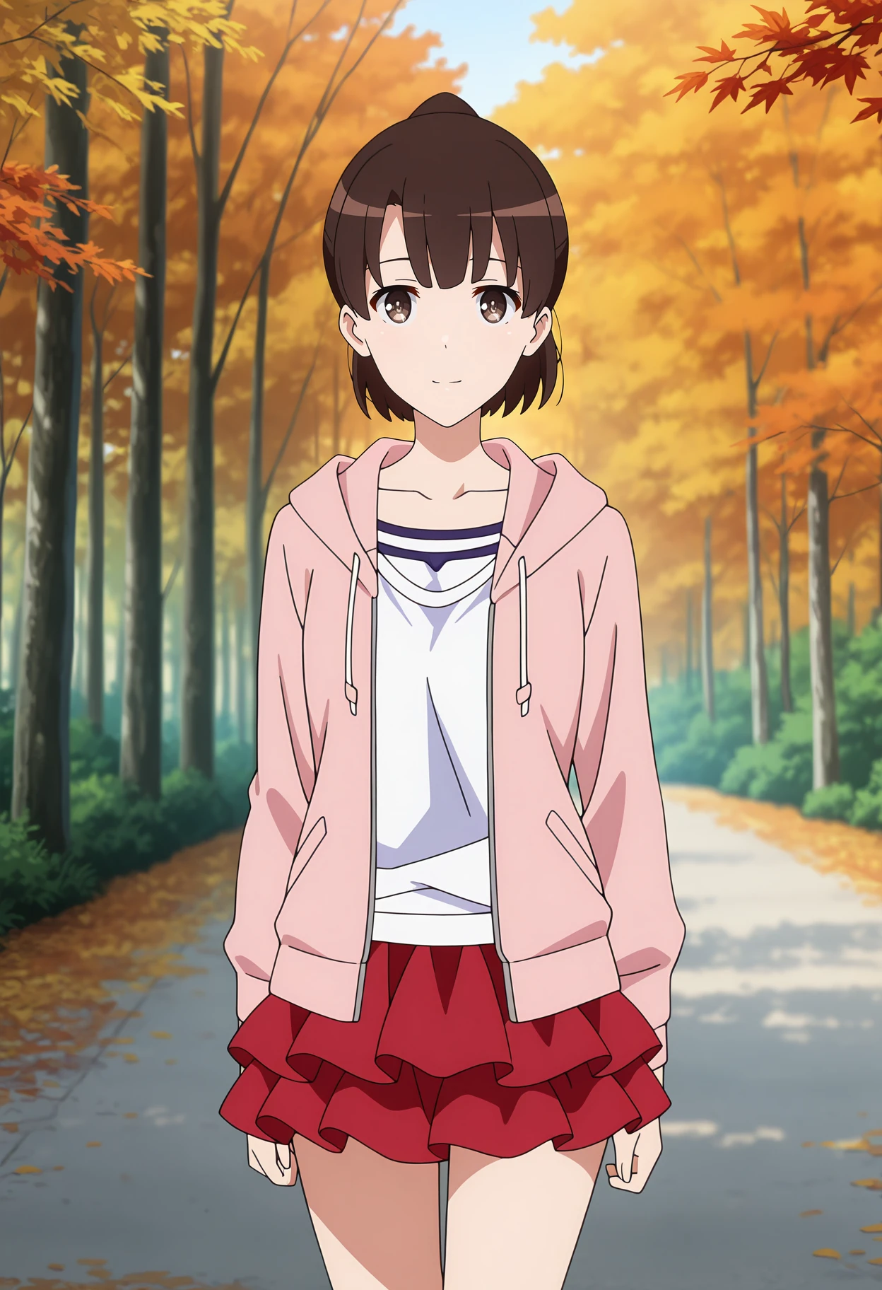 open hoodie, pink hoodie, collarbone, white shirt, long sleeves, miniskirt, layered skirt, frilled skirt, red skirt