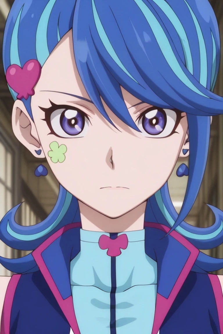 1girl, Blue gal, solo, blue gal outfit, purple eyes, facial tattoo, multicolored hair, blue hair, hair ornament,