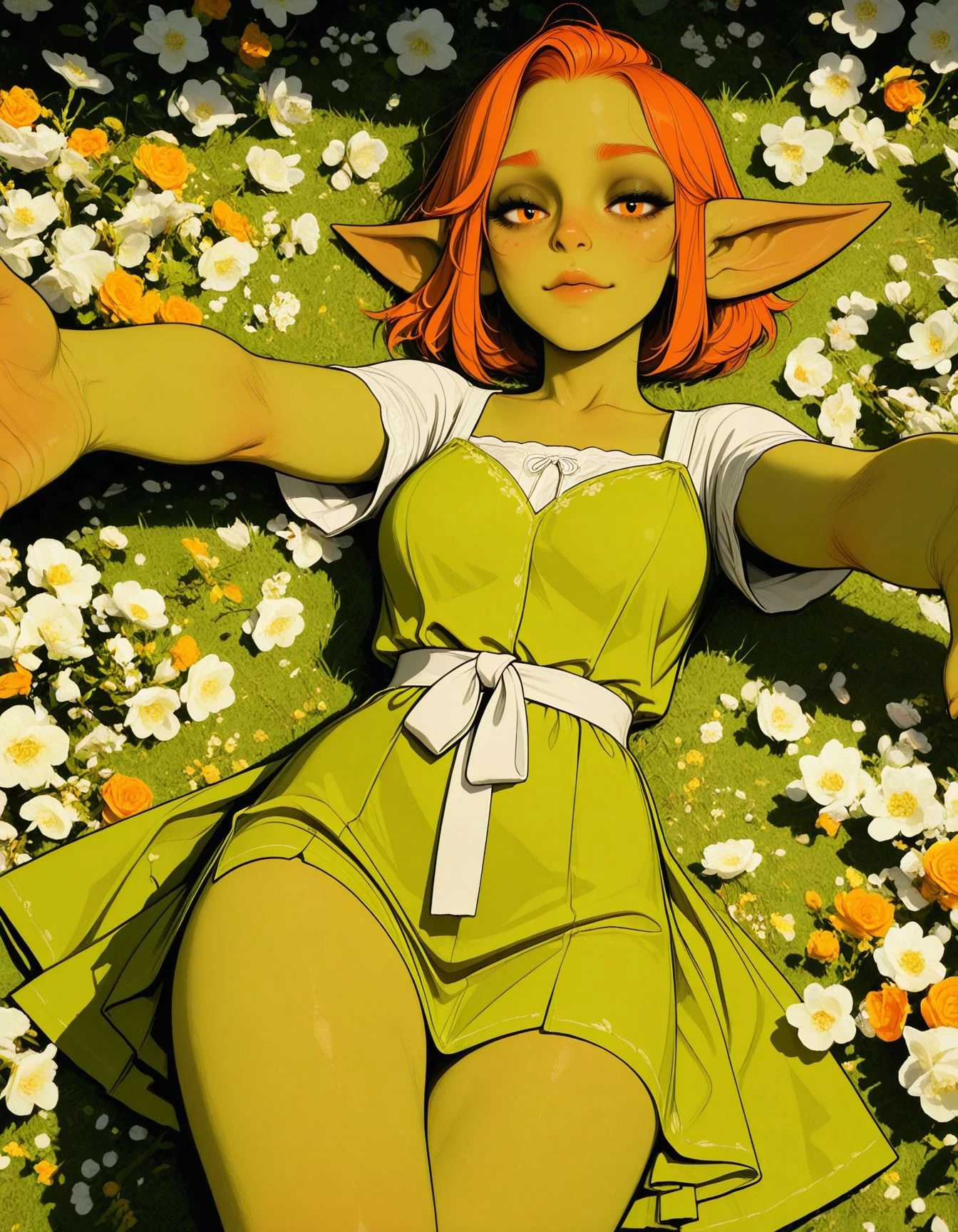 OCN1bba, green Skin, female Goblin, pointy ears, orange eyes, orange hair, freckles, short hair