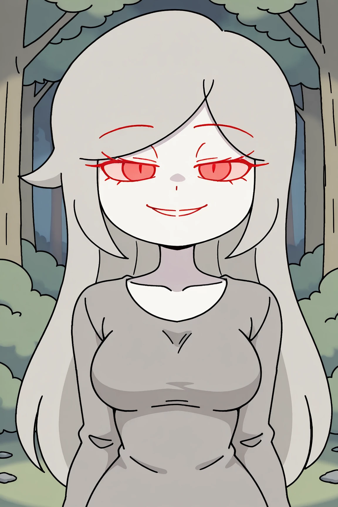 SusieD00ILXL, shortstack, toon (style), cartoon, cartoonized, pale skin, red eyes, red eyebrow, no sclera, grey hair, long hair, medium breasts, grey dress, long sleeves, barefoot