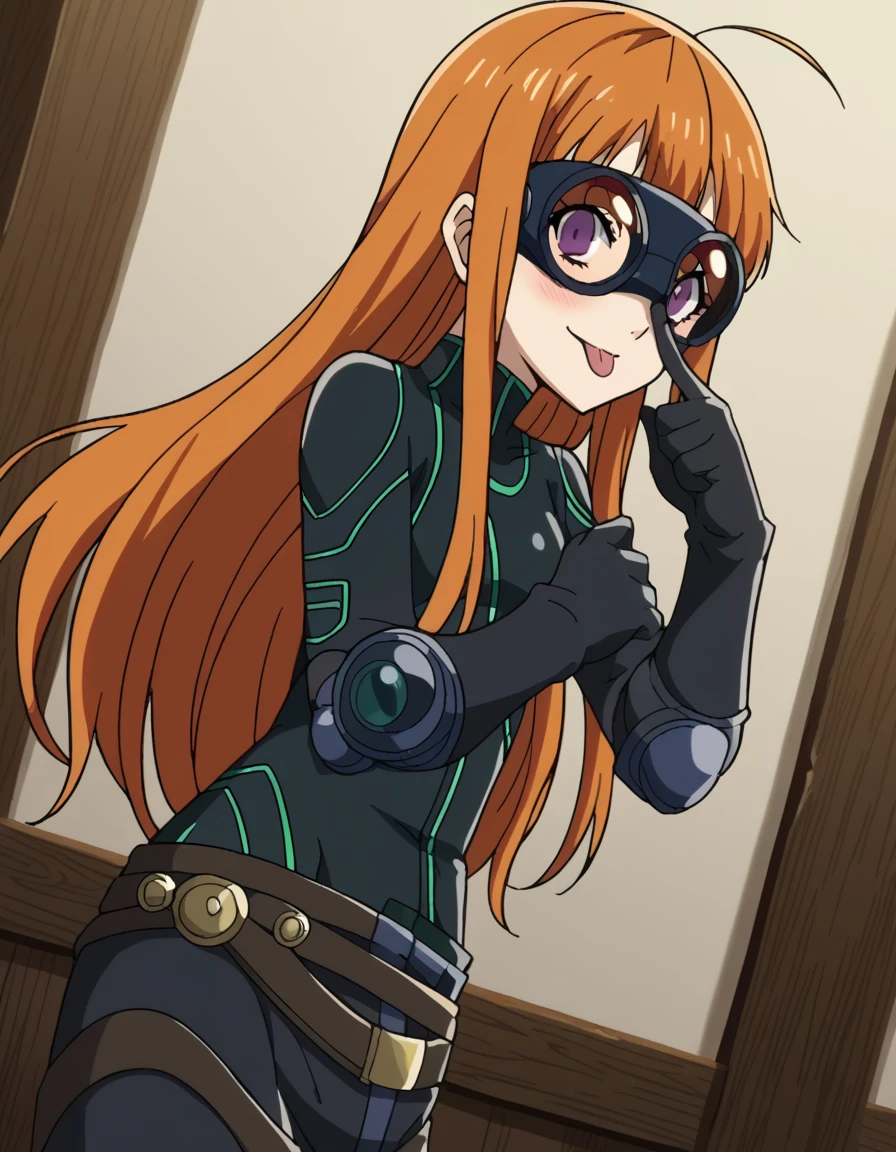futaba sakura, orange hair, long hair, purple eyes, ahoge,