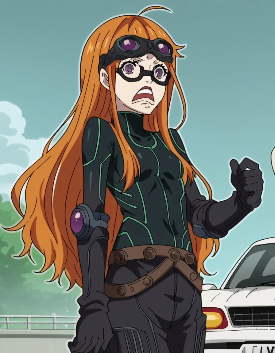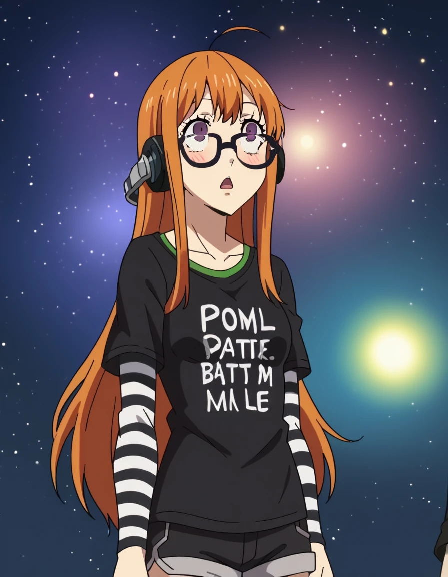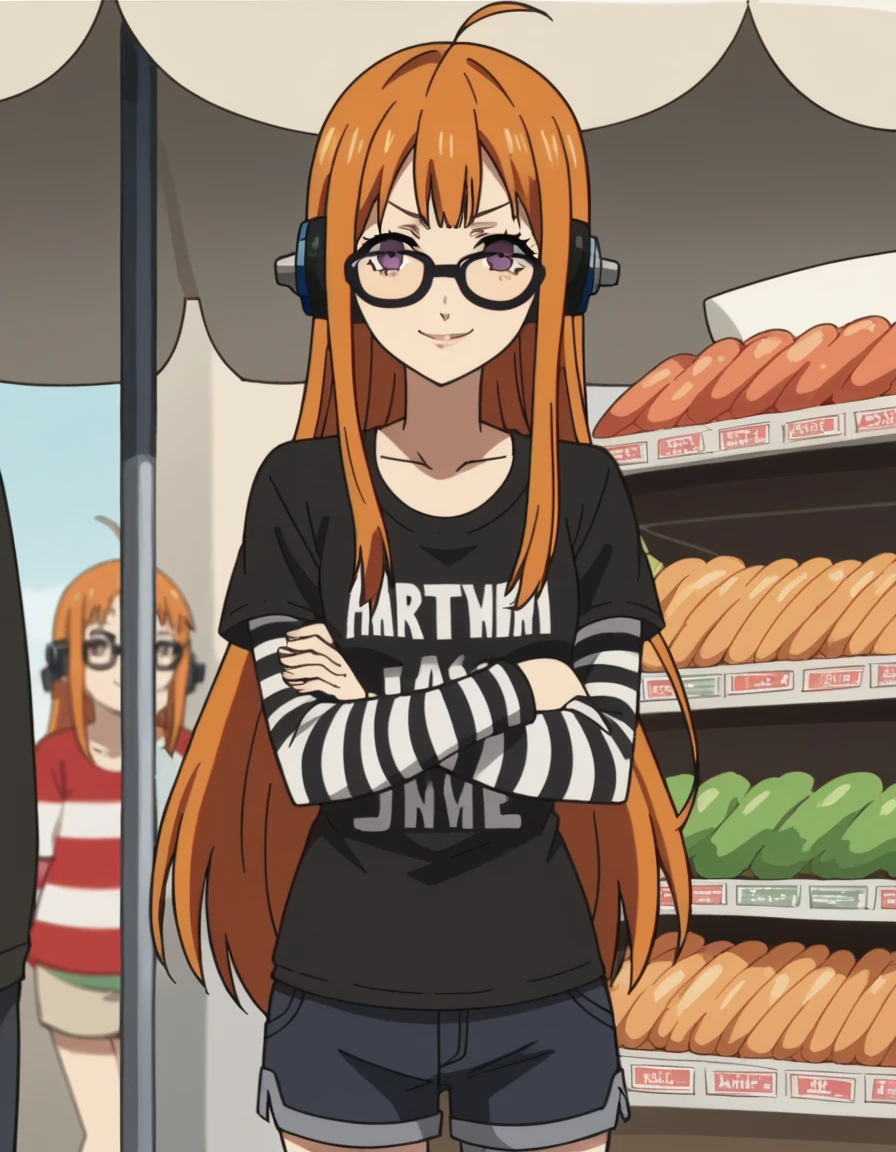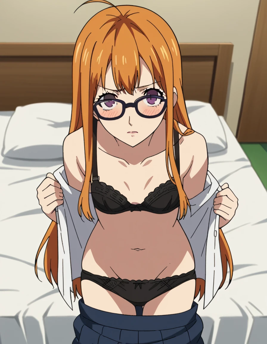 futaba sakura, orange hair, long hair, purple eyes, ahoge, glasses, black-framed eyewear, mature female, small breasts, anime screencap
