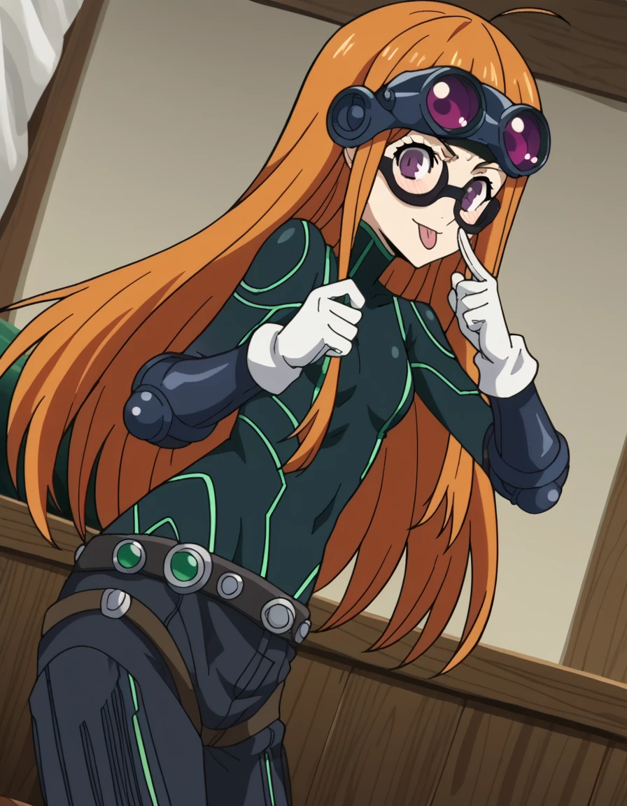 gloves, belt, bodysuit, goggles, goggles on head, black bodysuit, elbow pads,